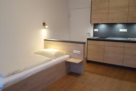 Die Wohnung wurde im Jahr 2023 komplett renoviert. Sie ist mit einem neuen PVC-Boden in Eichenoptik, Einzelbett (100 x 200 cm), einem großen Eckschreibtisch mit Flachbild-TV, einem großen Einbauschrank und Kommode, Stuhl sowie einem großen Spiegel ausgestattet. Steckdosen sind in großer Zahl und gut erreichbar in Bettnähe und beim Schreibtisch vorhanden. Die Wohnung hat einen kleinen überdachten Balkon.