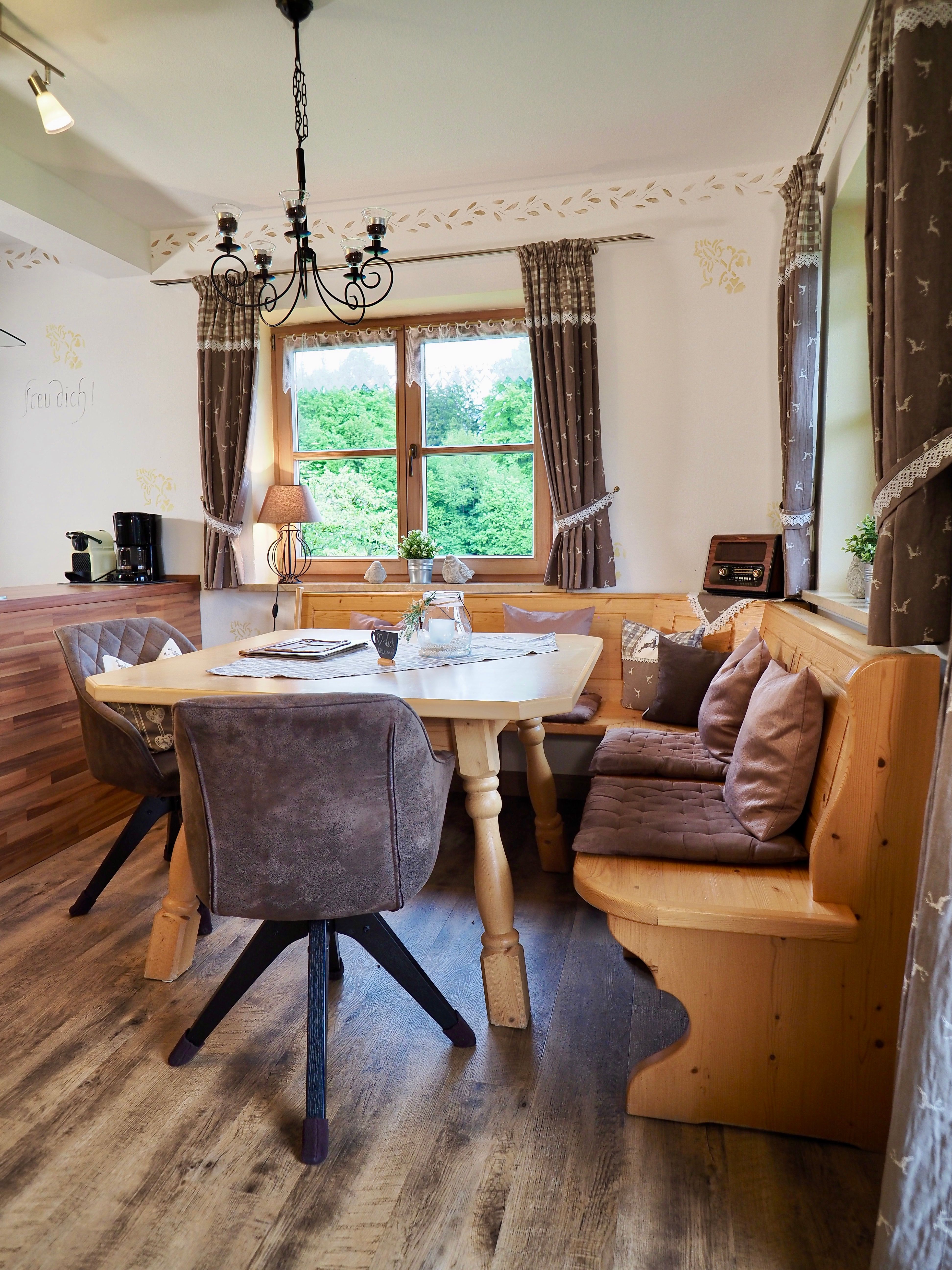 Neu renoviert in 2022: Die Ferienwohnung Panorama-Eckerl bietet eine grandiose Aussicht auf den Hochstaufen, den Untersberg, den Högl und je nach Wetterlage weit nach Österreich hinein.Die sehr geschmackvoll eingerichtete Ferienwohnung befindet sich in der ersten Etage unseres Hauses.Eine Wohnküche mit moderner Kücheneinrichtung (Geschirrspüler, Herd mit Ceranfläche und Backrohr, Mikrowelle, Kaffeeautomat, Kühl-Gefrierkombination, Nespresso-Kaffeemaschine), Eckbank, Sitzecke, TV und Radio steht für Sie bereit. Ebenso ein Schlafzimmer mit Doppelbett und ein modernes Duschbad. Vom Balkon genießen Sie eine traumhafte Aussicht.
