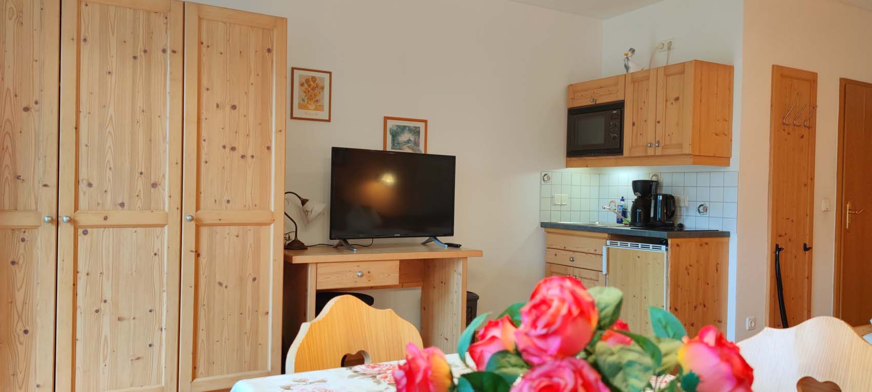 Dieser großzügige Raum hat eine kleine Küchenzeile mit Essecke, einen großen Schrank und eine eigene Terrasse mit Zugang zum Garten. Von der Terrasse blickt man auf den Obstgarten mit Pferdekoppel und den schönen Berggipfeln des östlichen Inntals.