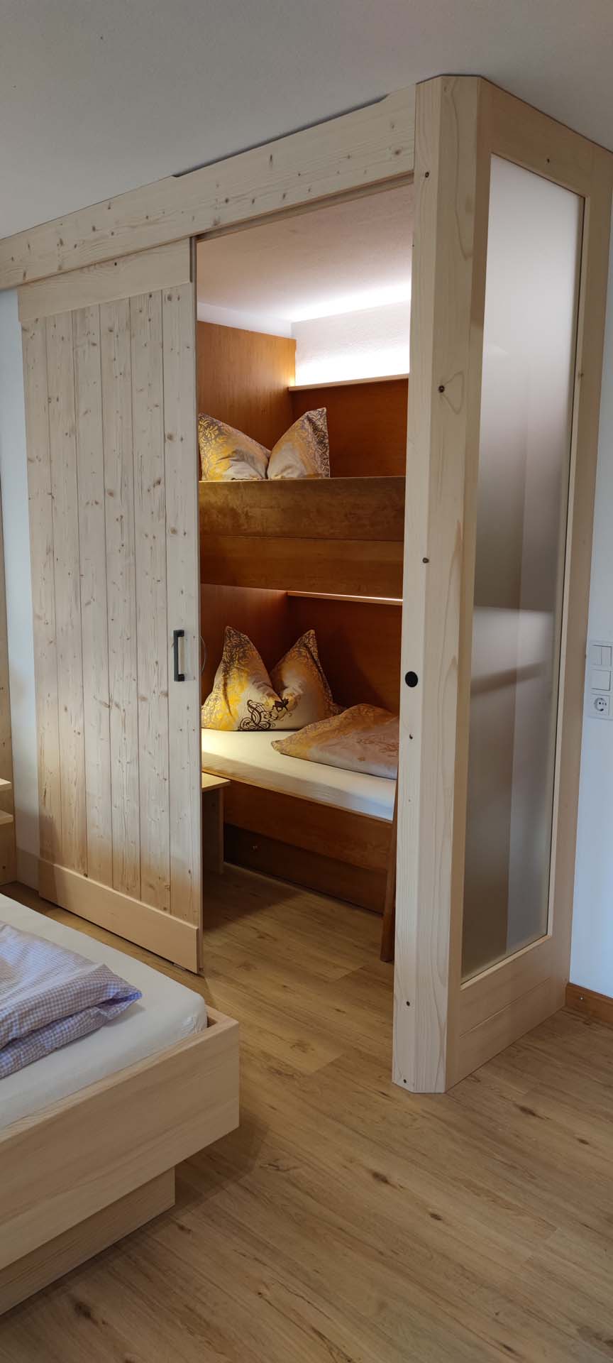 Mit einer Scheunentür kann der Schlafbereich der Kinder vom Elternbereich abgetrennt werden.