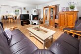 Die Ferienwohnung 1 mit ca. 100m² befindet sich im Erdgeschoss. Die Terrasse ist mit einer Hollywoodschaukel, einer Bank mit großem Tisch, Stühle, Markisse und Sonnenschirm ausgestattet. Die großzügige Einbauküche mit elegantem Raumteiler lädt zum Kochen ein. Es bietet sich viel Platz beim großen Esstisch mit zehn Bestuhlungen. Die großzügige Wohnraum-Galerie vermittelt ein offenes gemütliches Wohlgefühl.