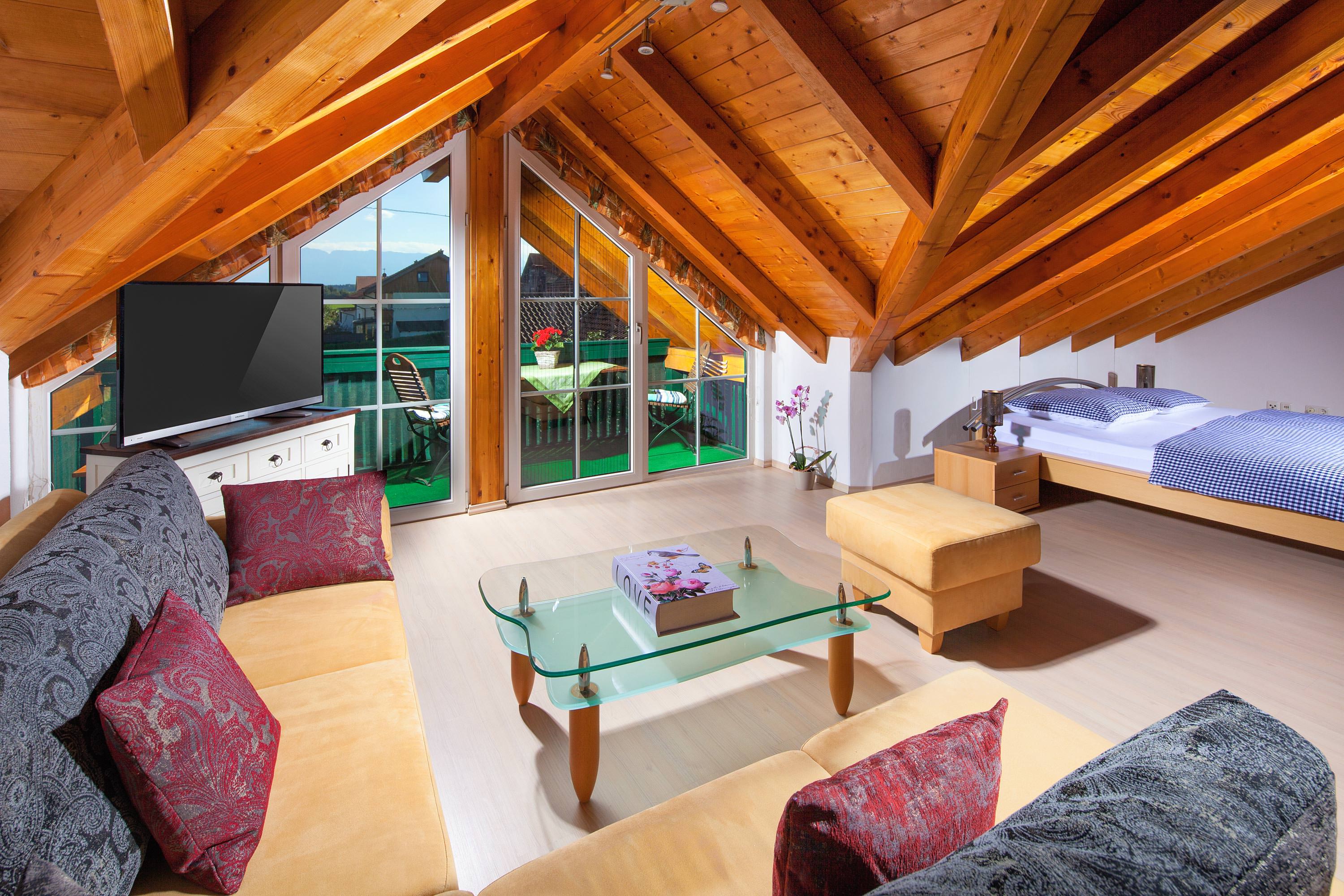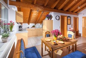 Sie wollten schon immer einmal im Dachgeschoss wohnen? Die Dachschräge und viel Holz sorgen für eine einzigartige Atmosphäre. Natürlich haben Sie auch dort einen sonnigen Südbalkon mit herrlichem Weitblick über die liebliche, bunte Landschaft zu den Bergen. Eine Einbauküche läd zum Kochen ein. Tisch, Eckbank und Bestuhlung wurden aus Naturholz angefertigt.
