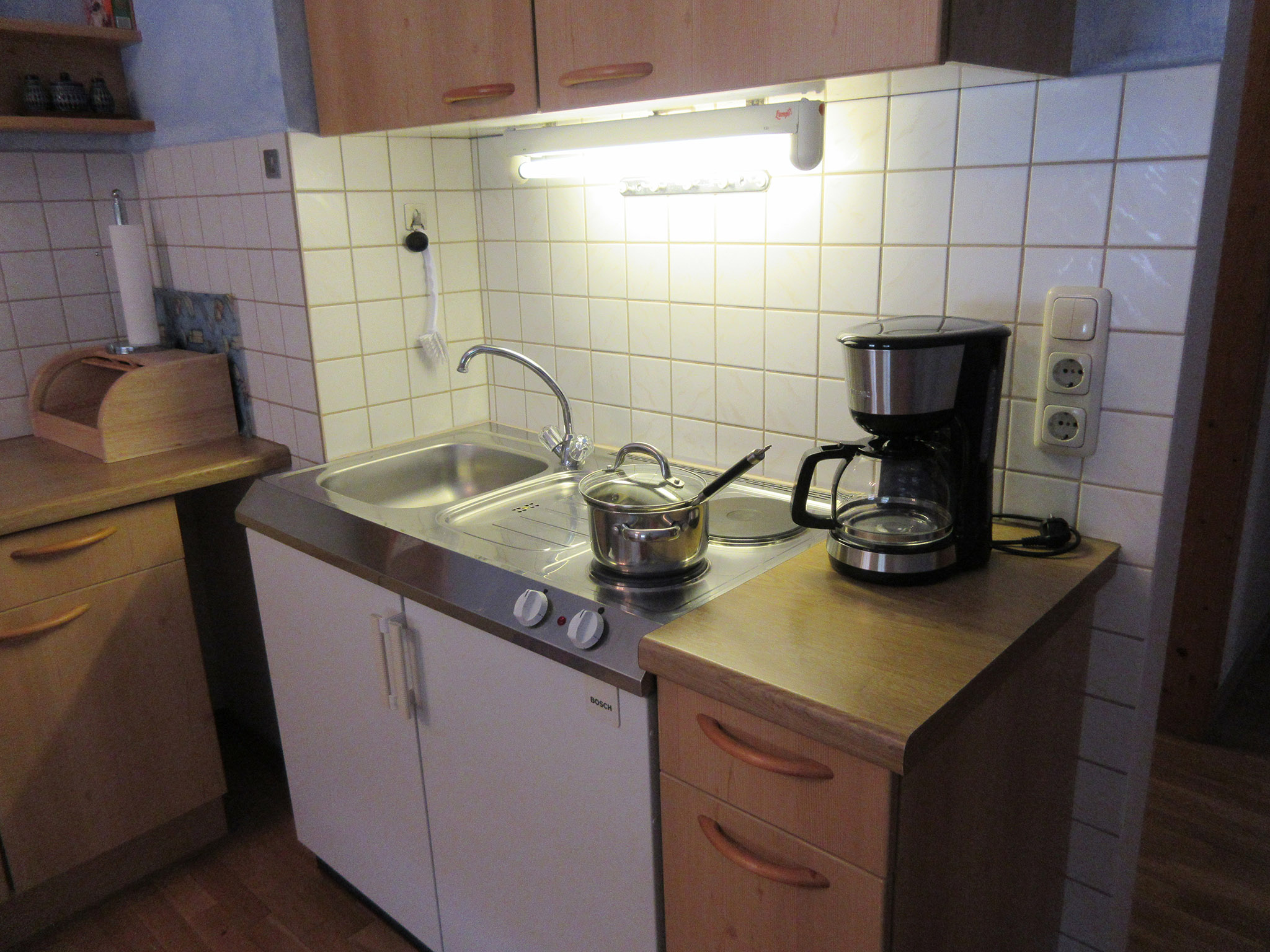Die Küche ist komplett ausgestattet mit einer Kochnische, einem Kühlschrank und einem Tiefkühlfach. Hier können Sie nach Herzenslust kochen und sich kulinarisch verwöhnen lassen. Genießen Sie Ihre Mahlzeiten an der Essecke oder im Freien auf unserer schönen Liegewiese, wo Sie auch die Möglichkeit haben, zu grillen.