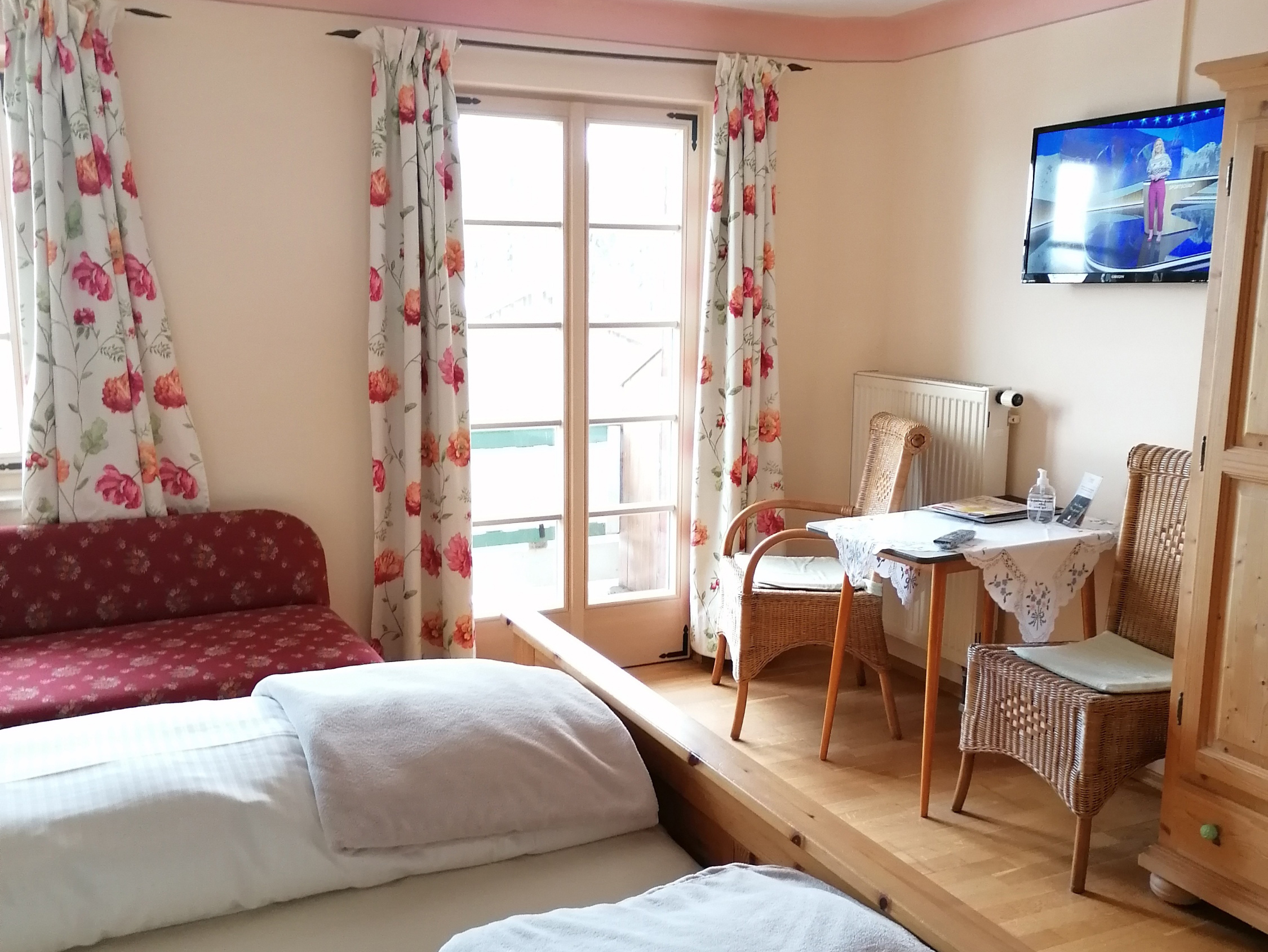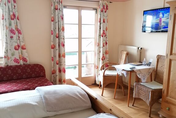 Helles, geräumiges Zimmer im 2. Stock. Zur Ostseite mit Balkon. Ausgestattet mit Dusche/WC, TV, Föhn und Wasserkocher.