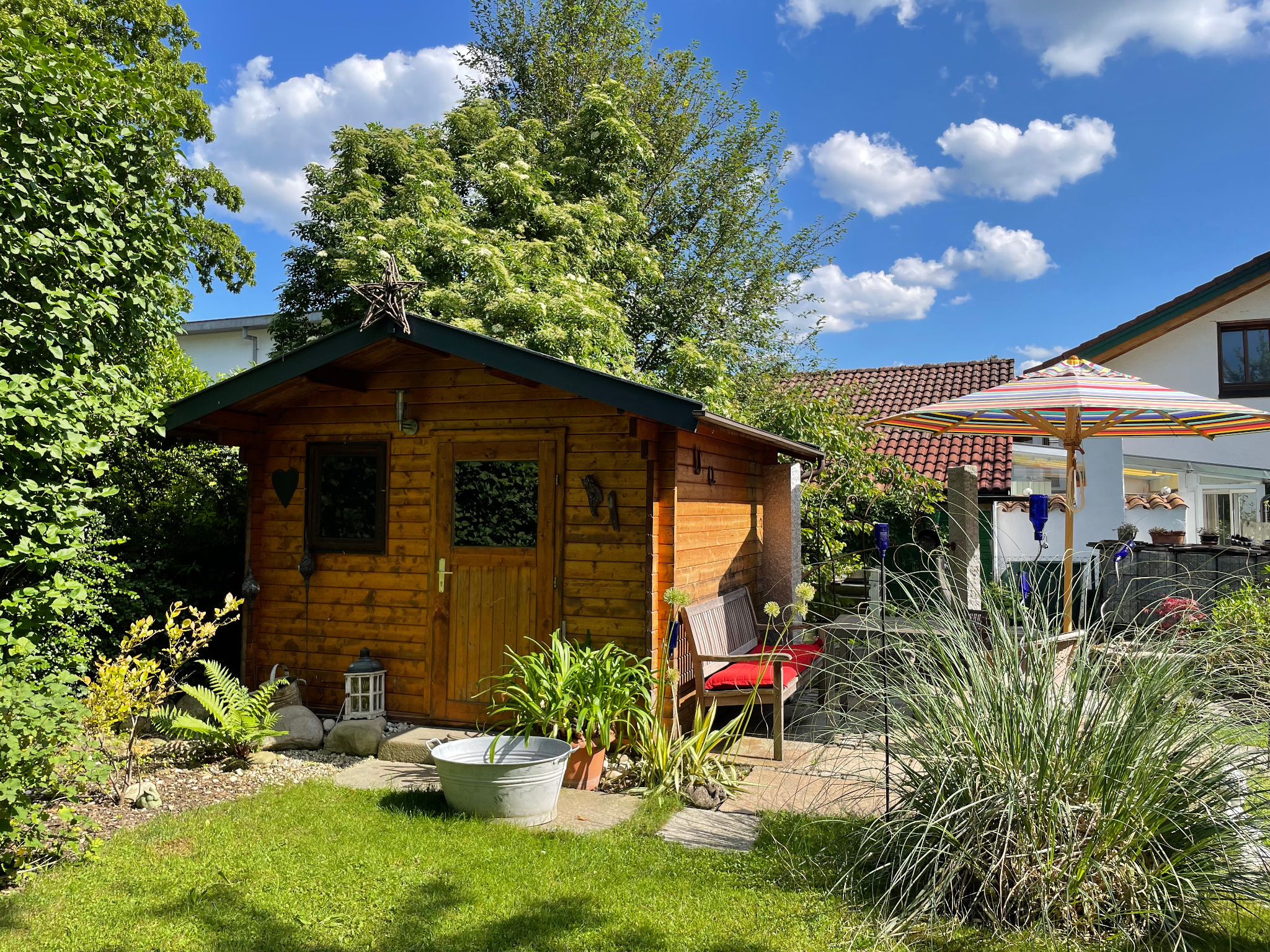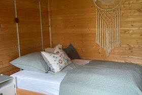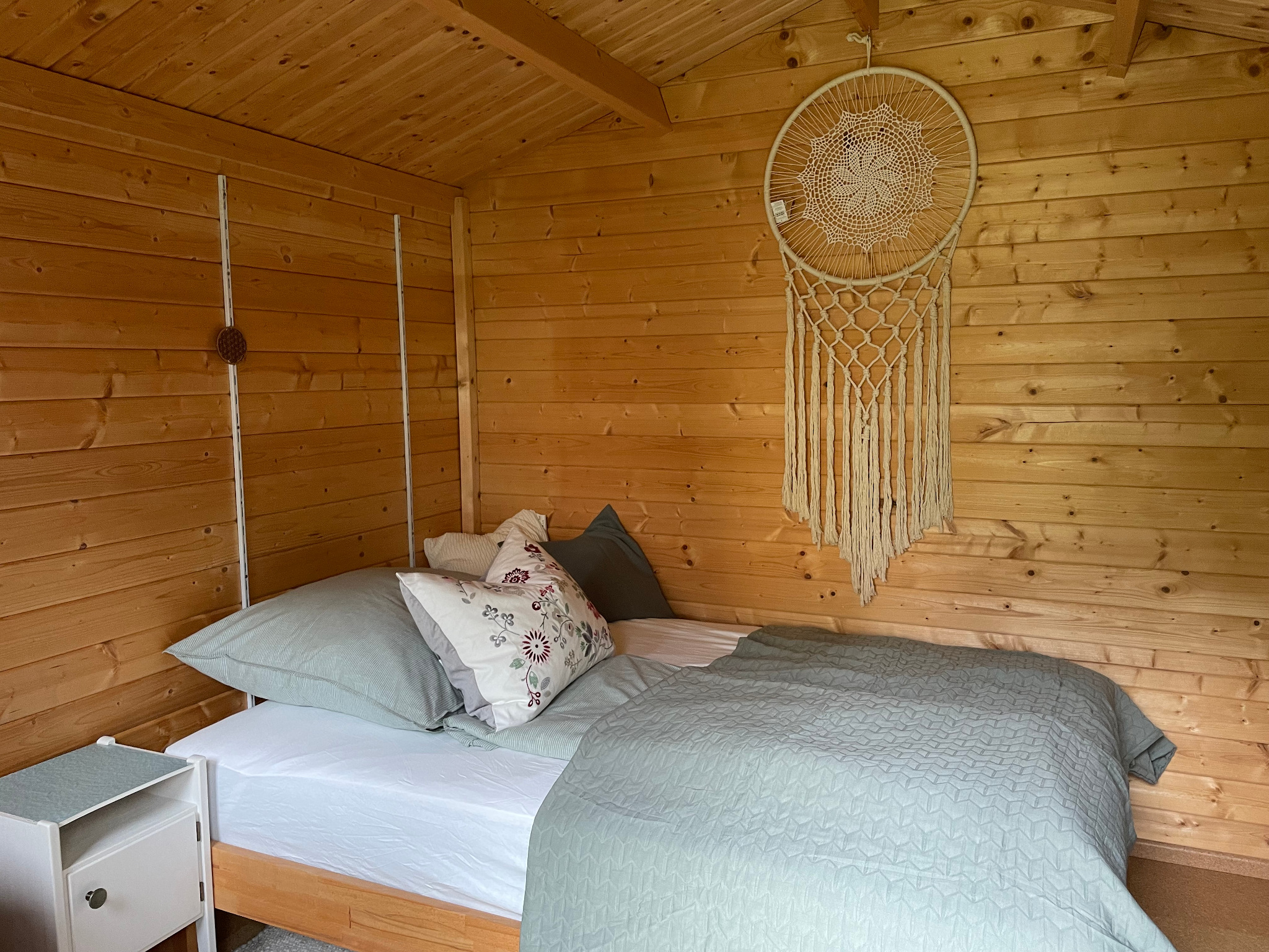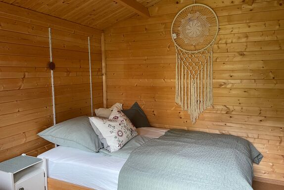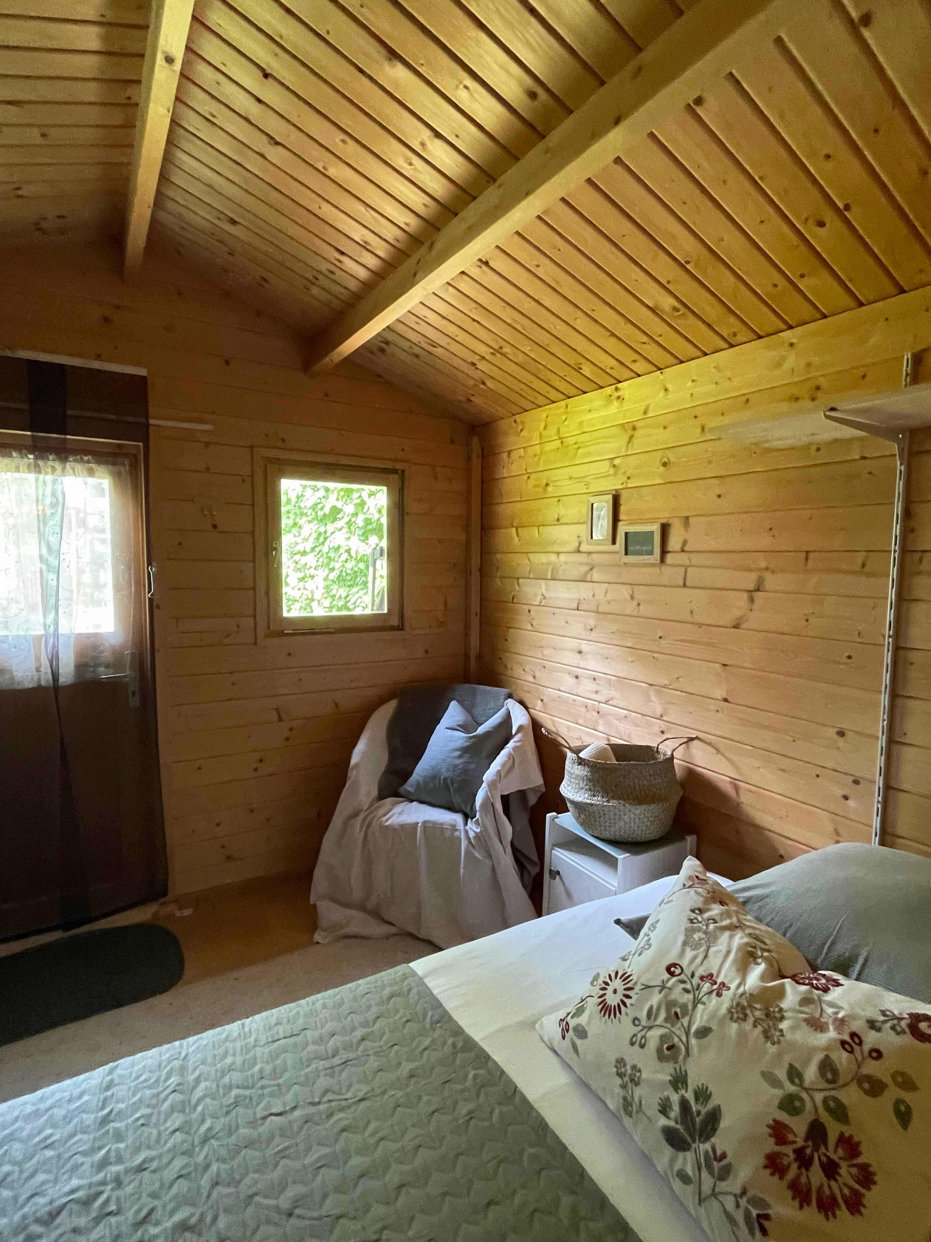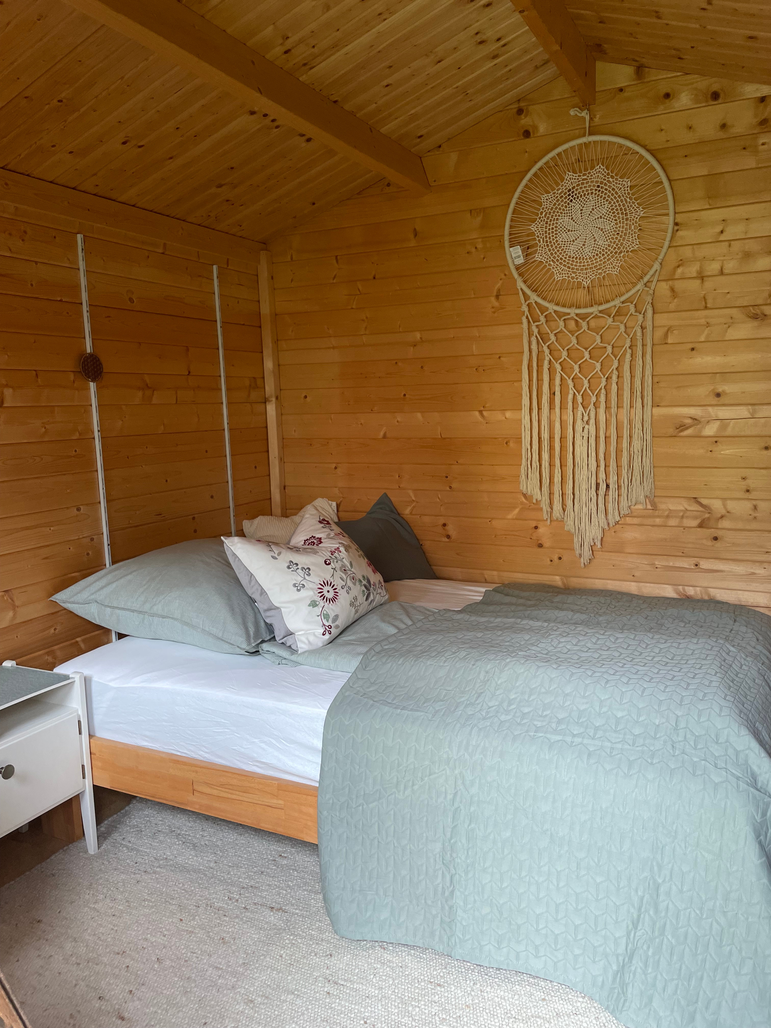 Wir bieten eine Übernachtungsmöglichkeit für maximal zwei Personen in unserem Gartenhäuschen aus Holz, direkt im Garten.