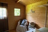 Im Gartenhäuschen aus Holz mit Korkboden und 7,85 Quadratmeter befindet sich ein Bett aus Buche (140x200), ein Stuhl und ein Nachttisch. Auf der kleinen Terrasse davor haben sie eine Sitzgelegenheit im Garten und können den Tag ausklingen lassen.