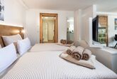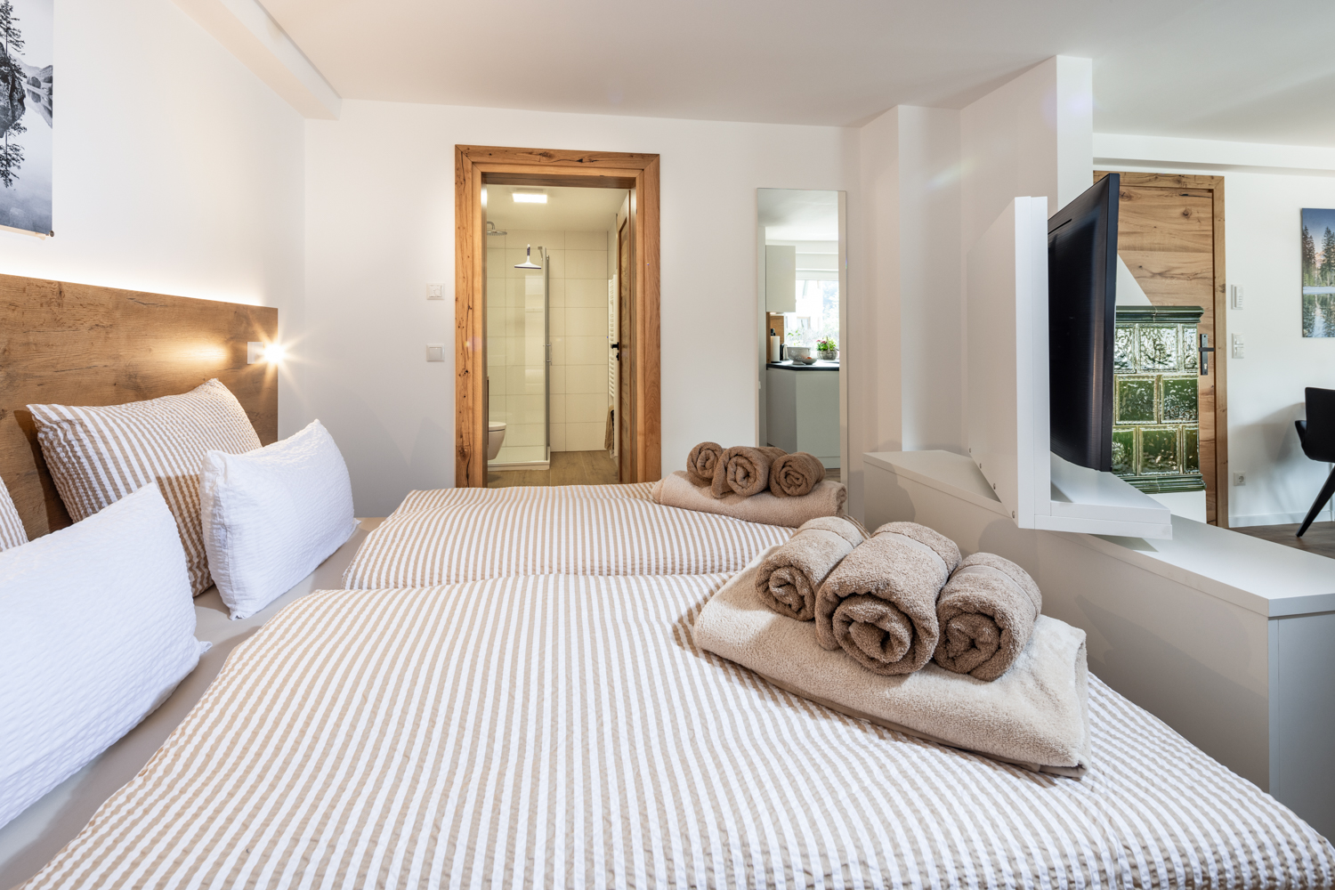Ein drehbarer Flachbild-Smart-TV trennt den Wohnbereich optisch vom Schlafbereich ab. Dort bilden das bequeme, hinterleuchtete Doppelbett in der Größe 180×200 cm mit hochwertigen Tonnentaschenfederkernmatratzen, der großzügige Kleiderschrank mit angrenzender Garderobe sowie Kofferablage und integriertem Laptopsafe eine harmonische Einheit. Im Wohn-/ Essbereich steht für die 3. und 4. Person ein Dauerschläfer-Sofa mit Matratze in der Größe 140×200 cm zur Verfügung. Die vollausgestattete Einbauküche mit Marken-Elektrogeräten inklusive Spülmaschine, Induktionskochfeld sowie Mikrowelle mit Backfunktion hat einen großen Esstisch mit vier Armlehnstühlen.