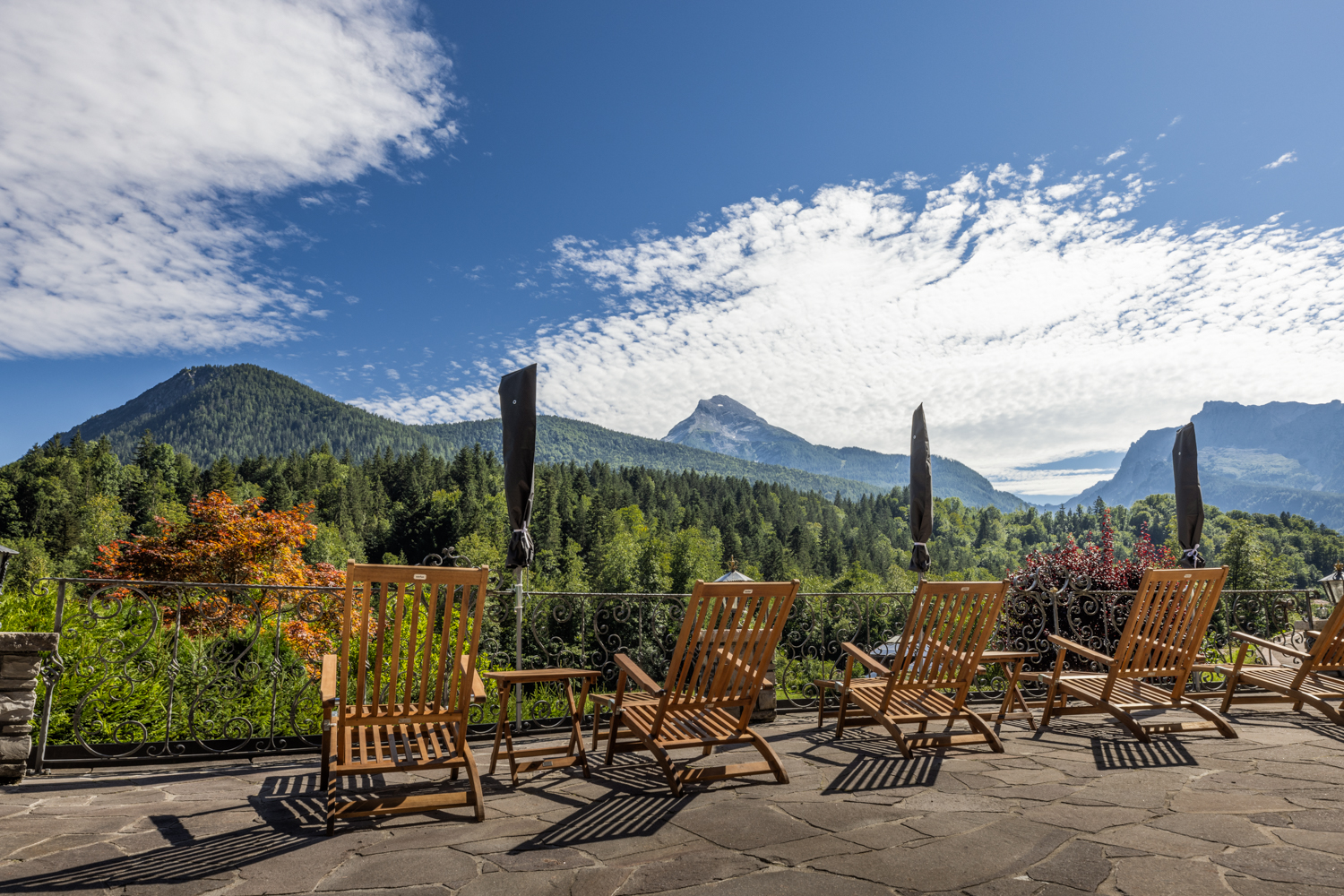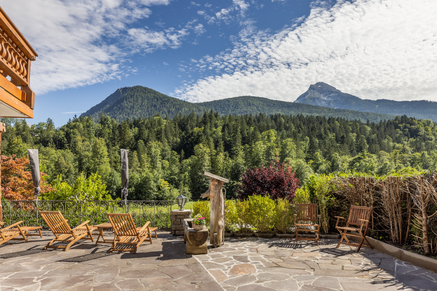 Die von der Wohnung aus zugängliche Terrasse bietet von der überdachten Sitzecke aus einen wunderschönen Blick auf das beeindruckende Panorama der Berchtesgadener Alpen und den majestätischen Watzmann.