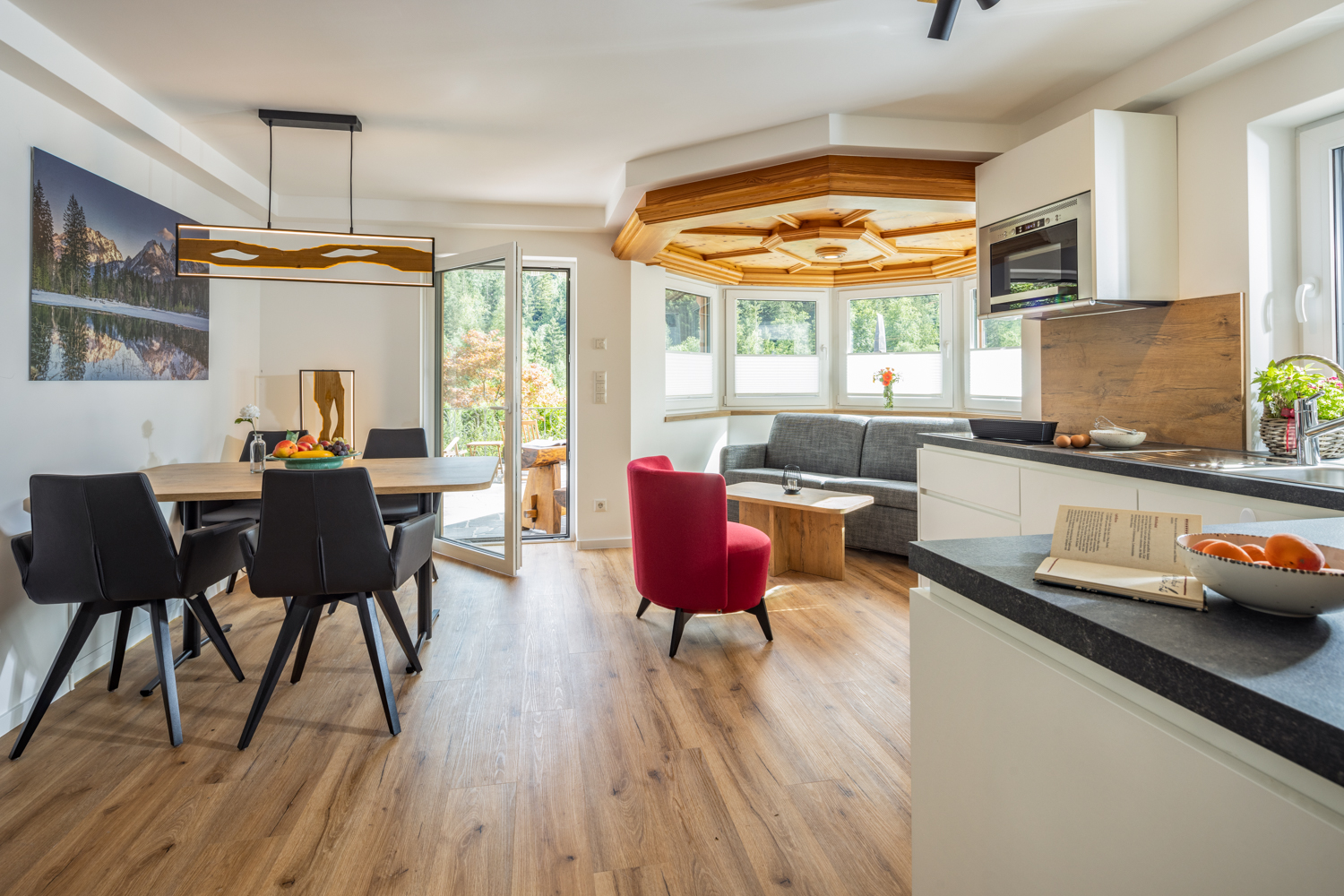 Die Wohnung „Hochkalter“ ist im Appartement-Stil mit kombiniertem Wohn- Schlafraum, großzügigem Küchenbereich sowie modernem Badezimmer eingerichtet. Sie befindet sich im Erdgeschoss des Haupthauses mit Platz für bis zu vier Personen.