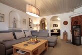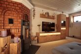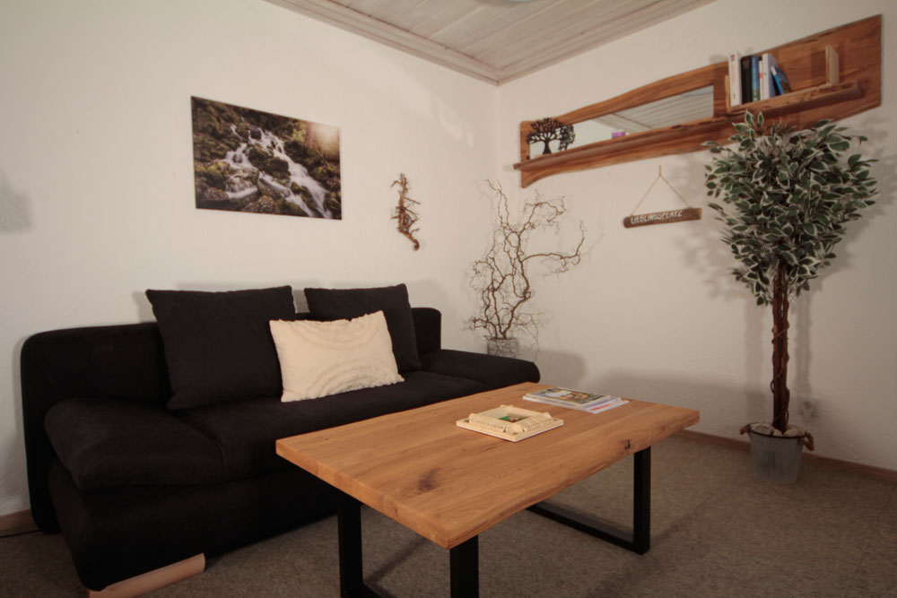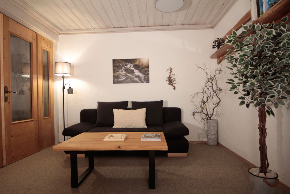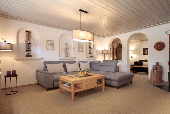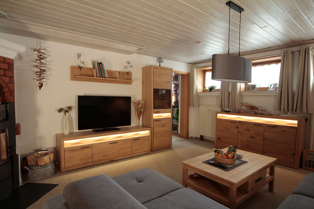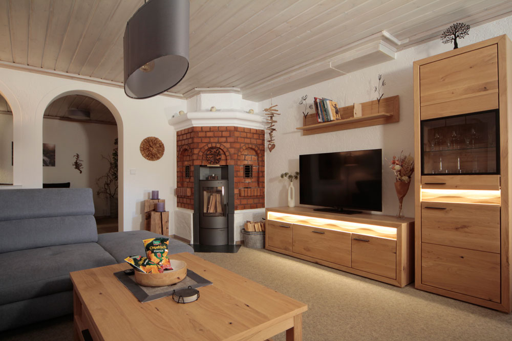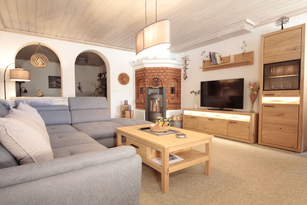 Geräumig ausgestattetes Wohnzimmer mit Wohnlandschaft, hochwertiger Nadelfilzboden, antibakteriell, antistatisch und wärmend, LED-Beleuchtung, Holzschwedenofen und Plasma-TV 55 Zoll.