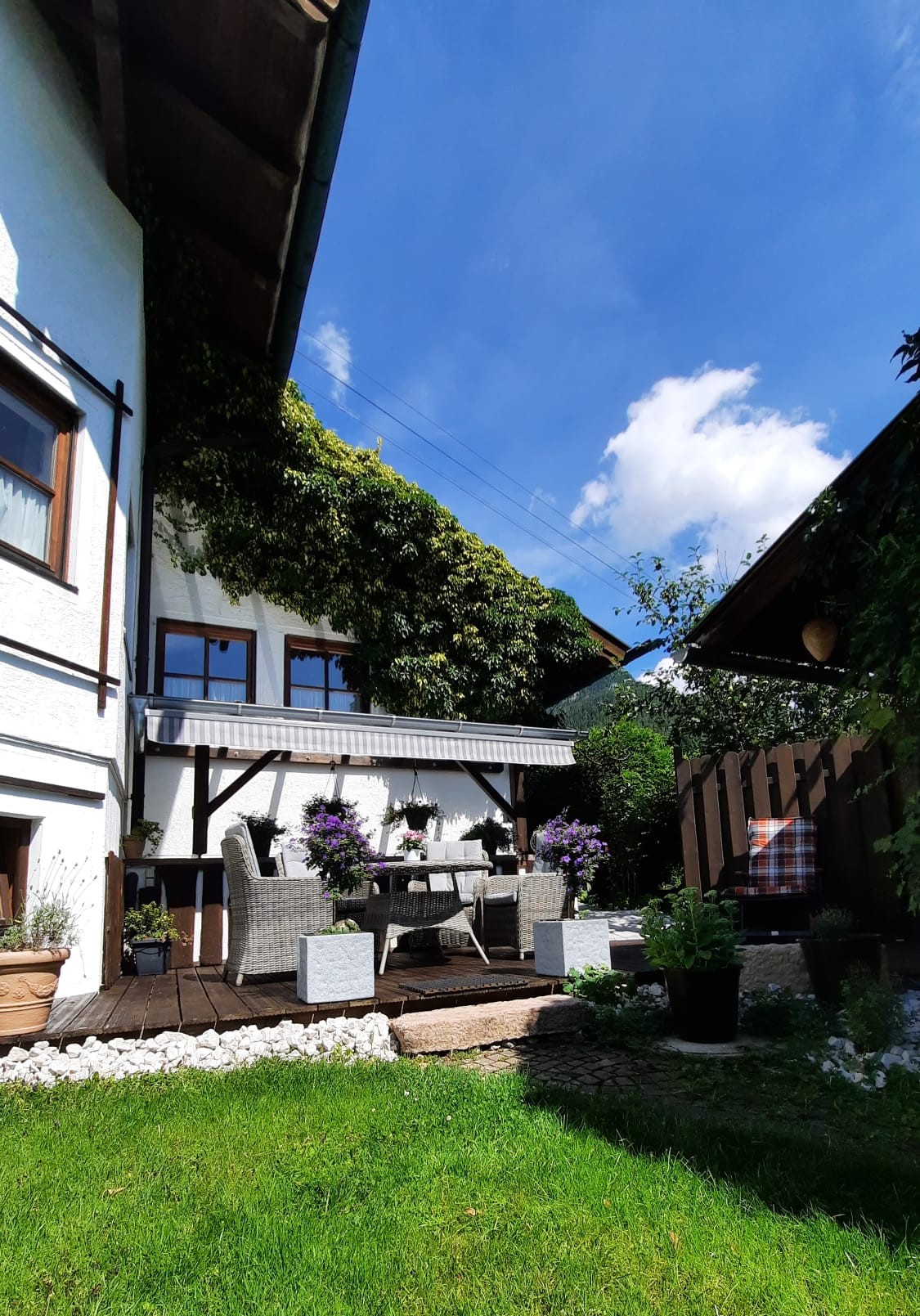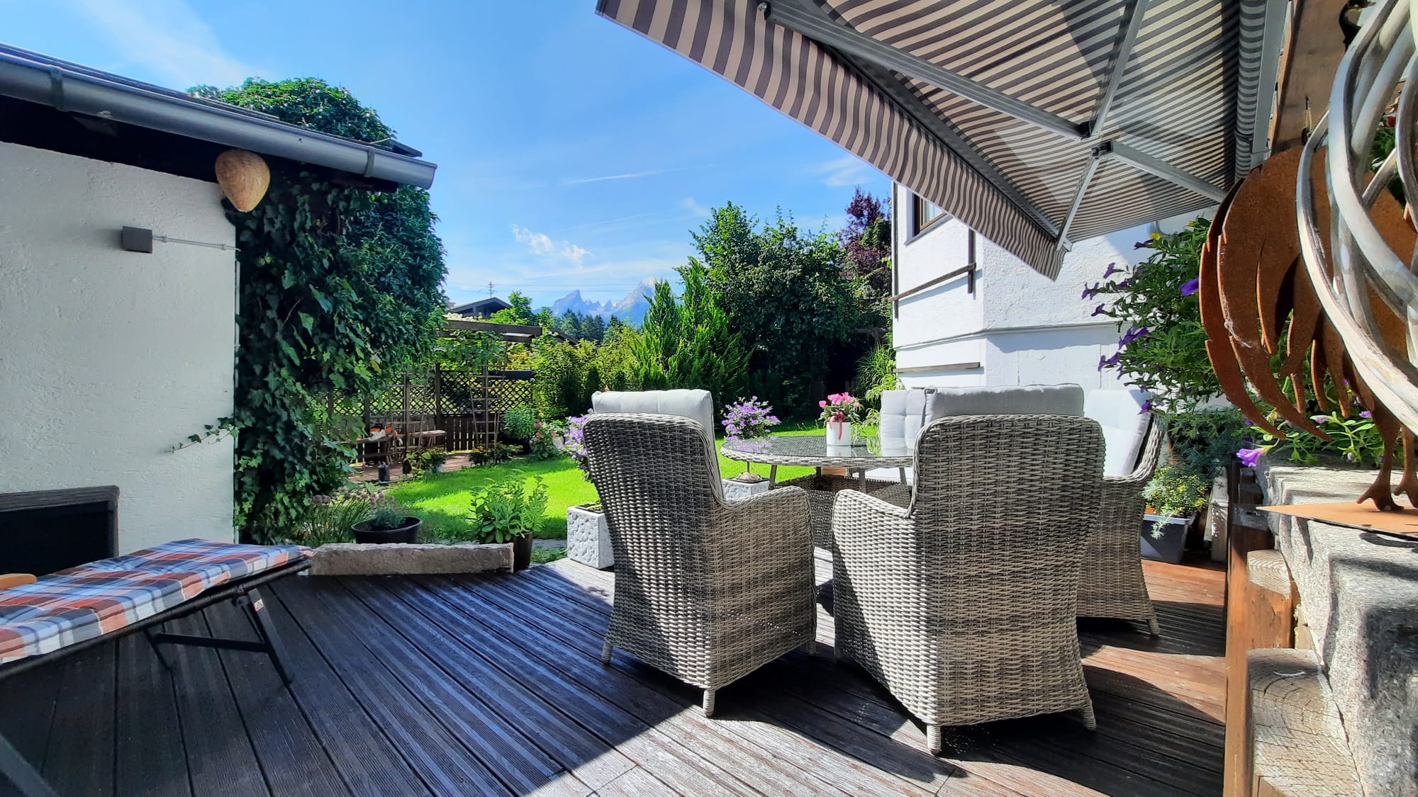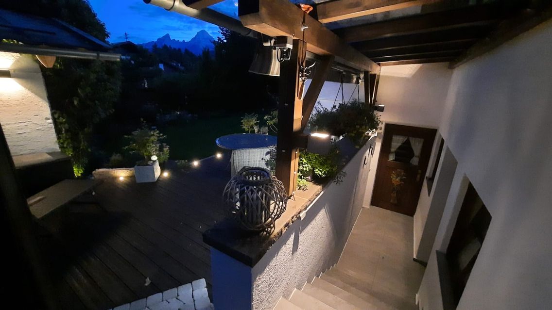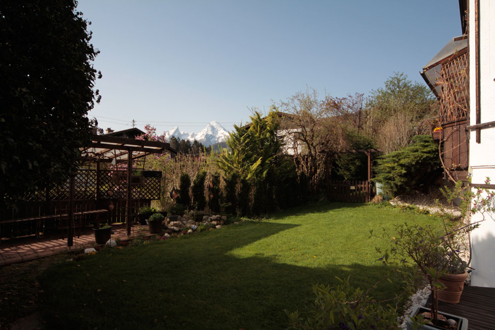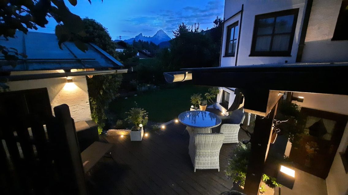 Landhaus mit vielen liebevollen Details und herrlichem Bergblick. Für gemütliche Stunden im Freien steht Ihnen eine große Terrasse mit elektrisch verfahrbaren Sonnenschutz und Gartenmöbeln mit Sitzkissen zur Verfügung. Auf der Liegewiese können Sie auf Gartenliegen den herrlichen Blick auf den Watzmann und die umliegende Bergwelt genießen.