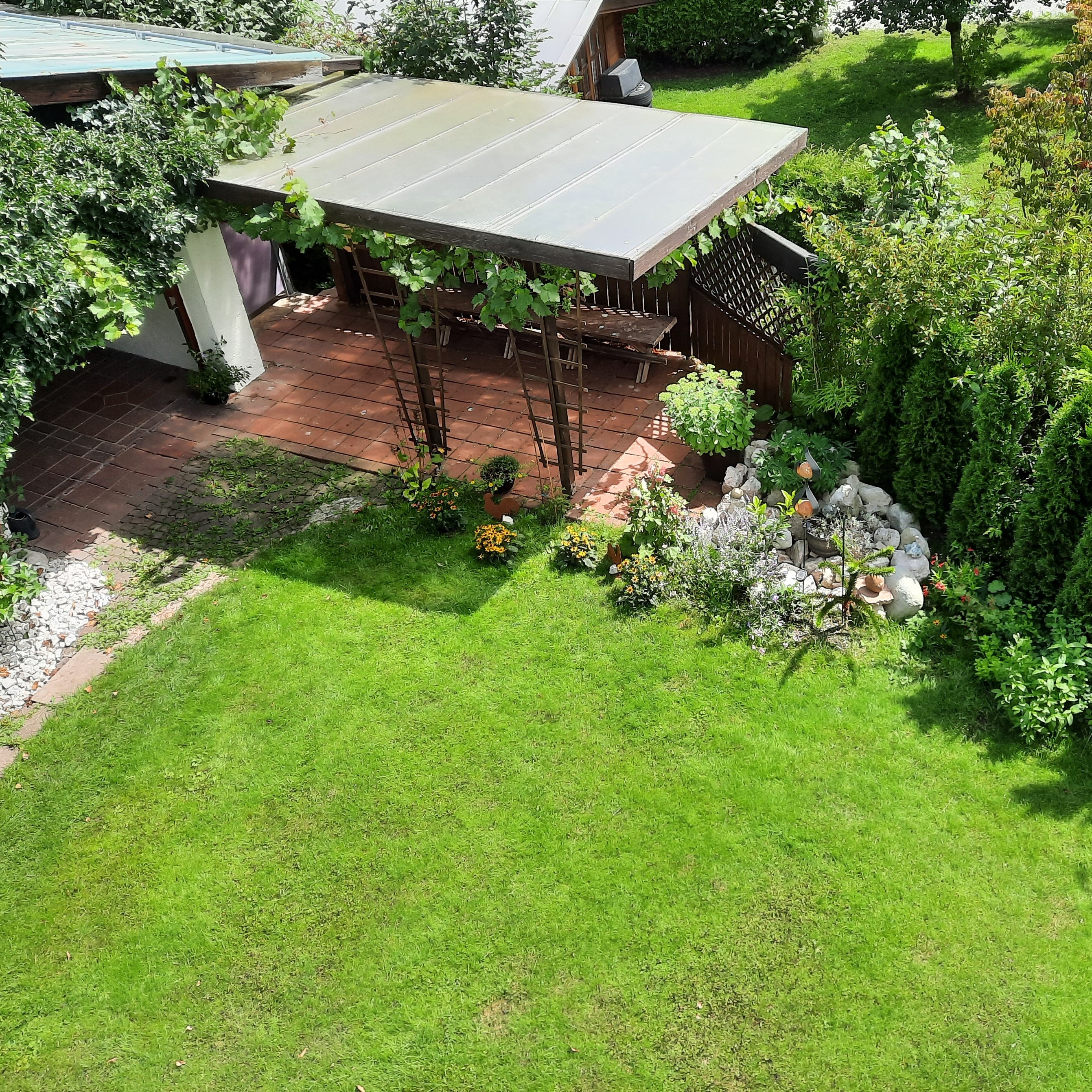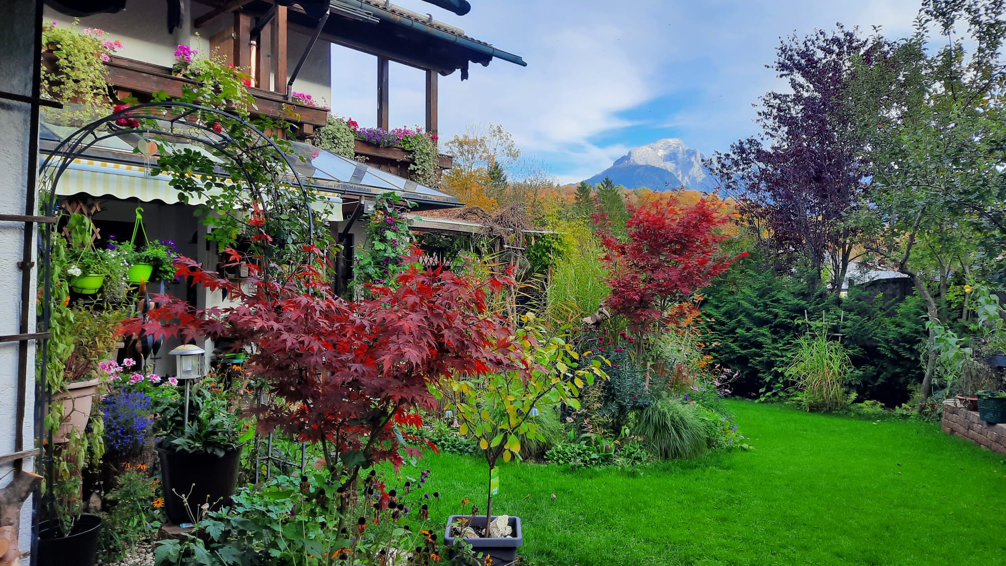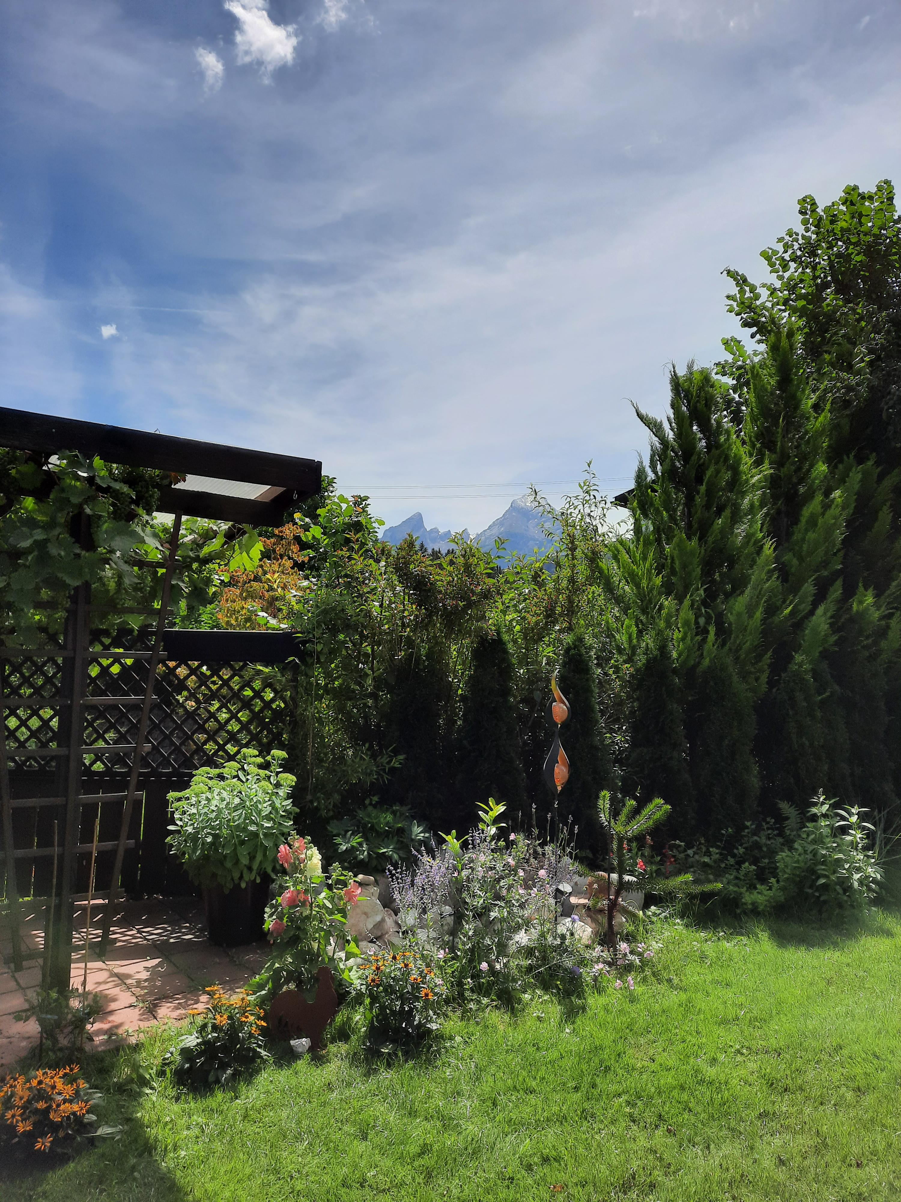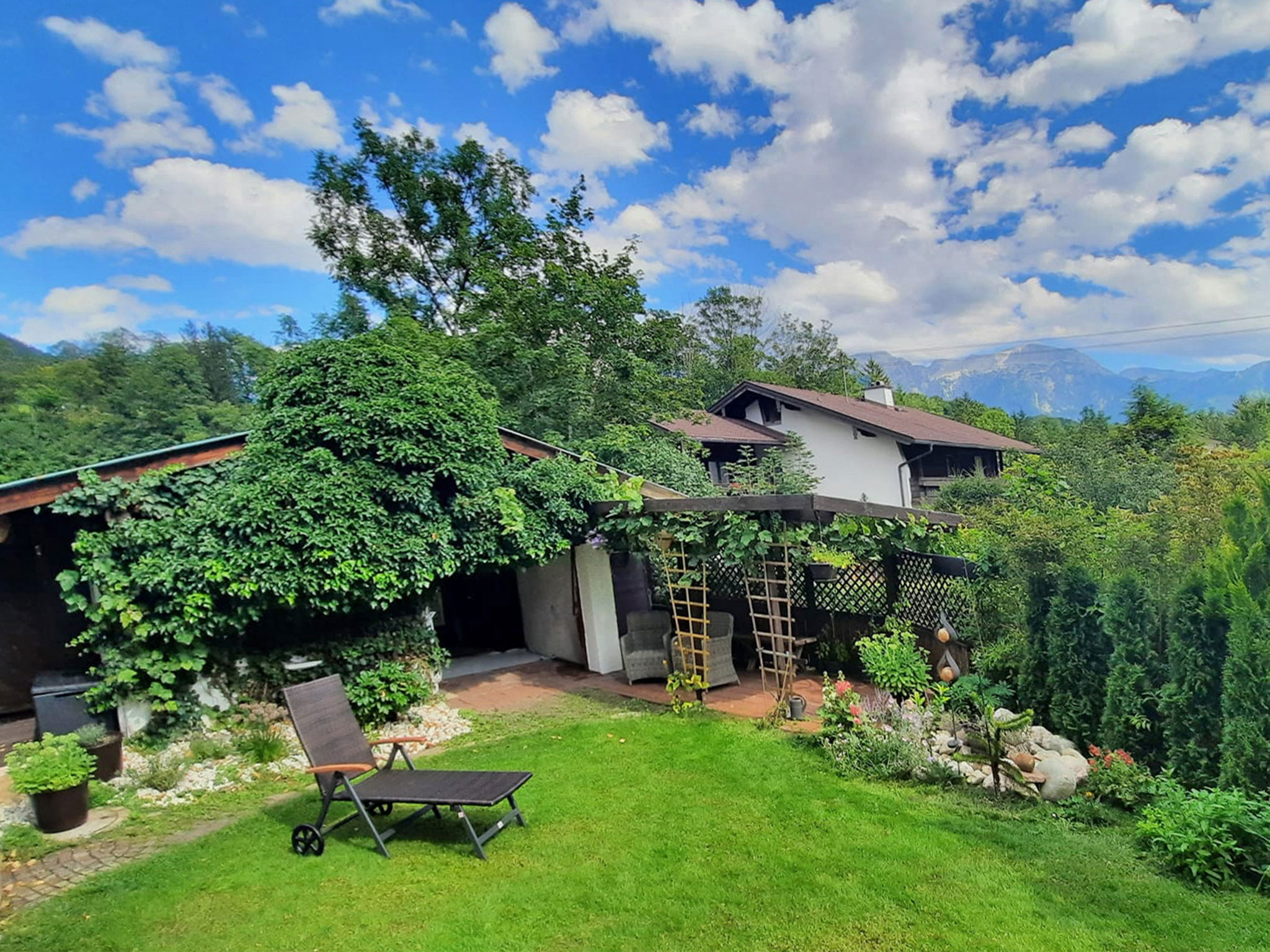 Landhaus mit vielen liebevollen Details und herrlichem Bergblick. Für gemütliche Stunden im Freien steht Ihnen eine große Terrasse mit elektrisch verfahrbaren Sonnenschutz und Gartenmöbeln mit Sitzkissen zur Verfügung. Auf der Liegewiese können Sie auf Gartenliegen den herrlichen Blick auf den Watzmann und die umliegende Bergwelt genießen.