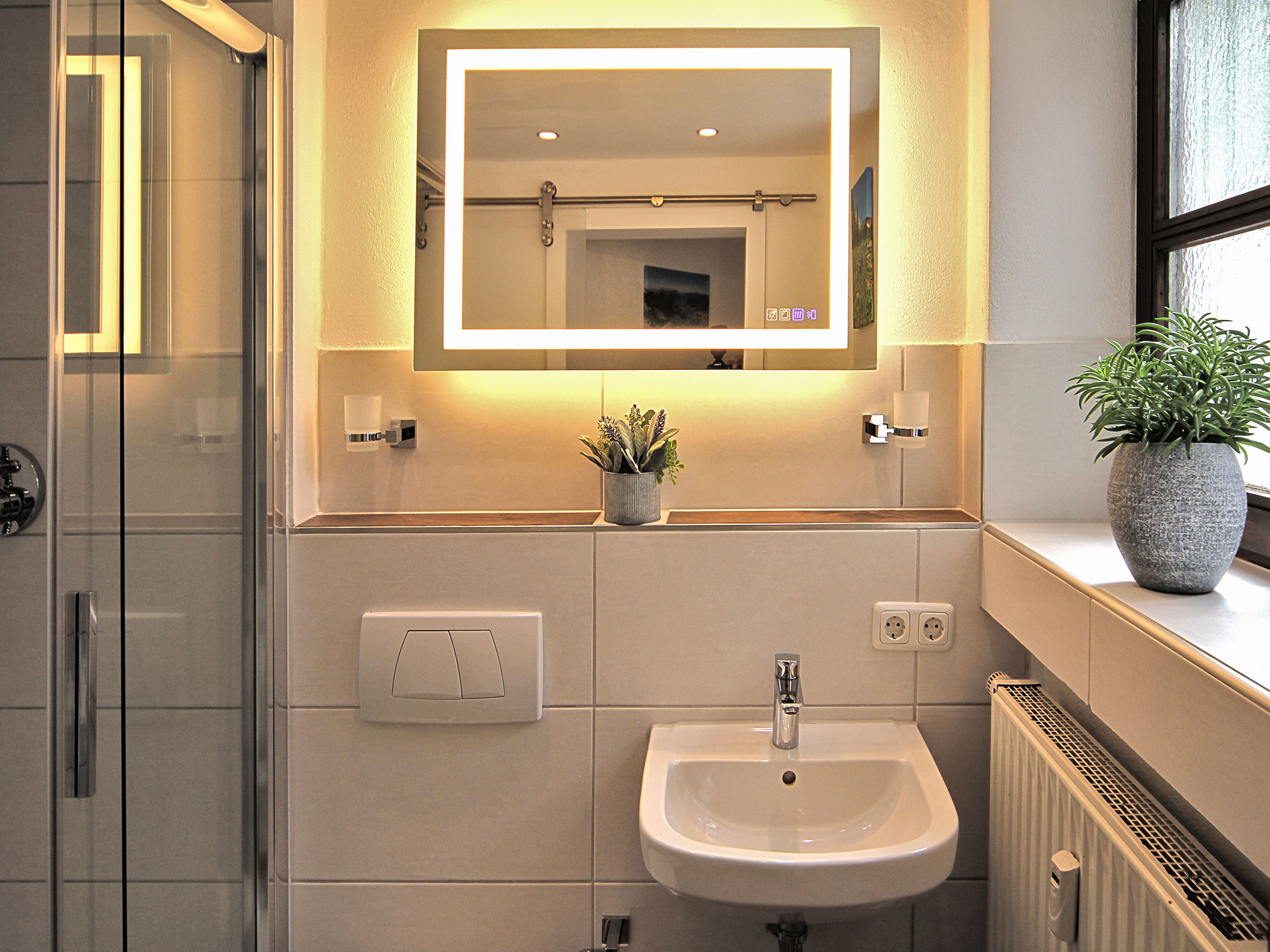 Neu renovierte und eingerichtete Halbsouterrainwohnung mit Sonnenterrasse und Garten, Sonnenschutz Markise elektrisch bedienbar, Gartenmöbel Rattan und Liegen. Küchenausstattung mit Geschirrspüler, Einbaubackofen und Ceranfeld, Miele Waschmaschine + Trockner gegen Gebühr, Kaffeemaschine für Filterkaffee, Jacobs Tassimo Padmaschine, Eier- und Wasserkocher, Bluetooth Küchenradio, Badezimmer mit Regendusche und separaten Duschkopf, Glasschiebetür und Badspiegel beleuchtet/beheizt und mit Bluetooth ausgestattet.