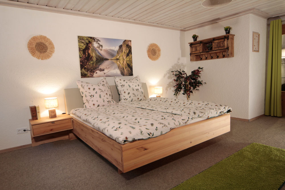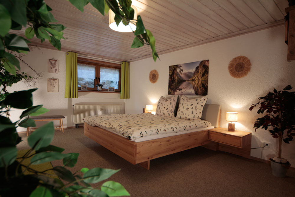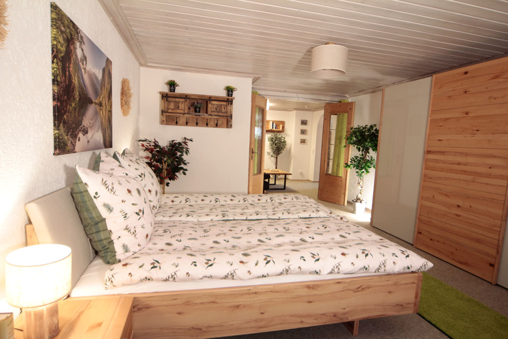 Lesezimmer mit ausziehbarer Couch und Holztisch. Schlafzimmer mit Doppelbett, Lattenrost mit verstellbarem Fuß- und Kopfteil, 3-türiger Schiebetürenschrank Massivholz. Kostenloses WLAN, elektrischer Schlüsselsafe