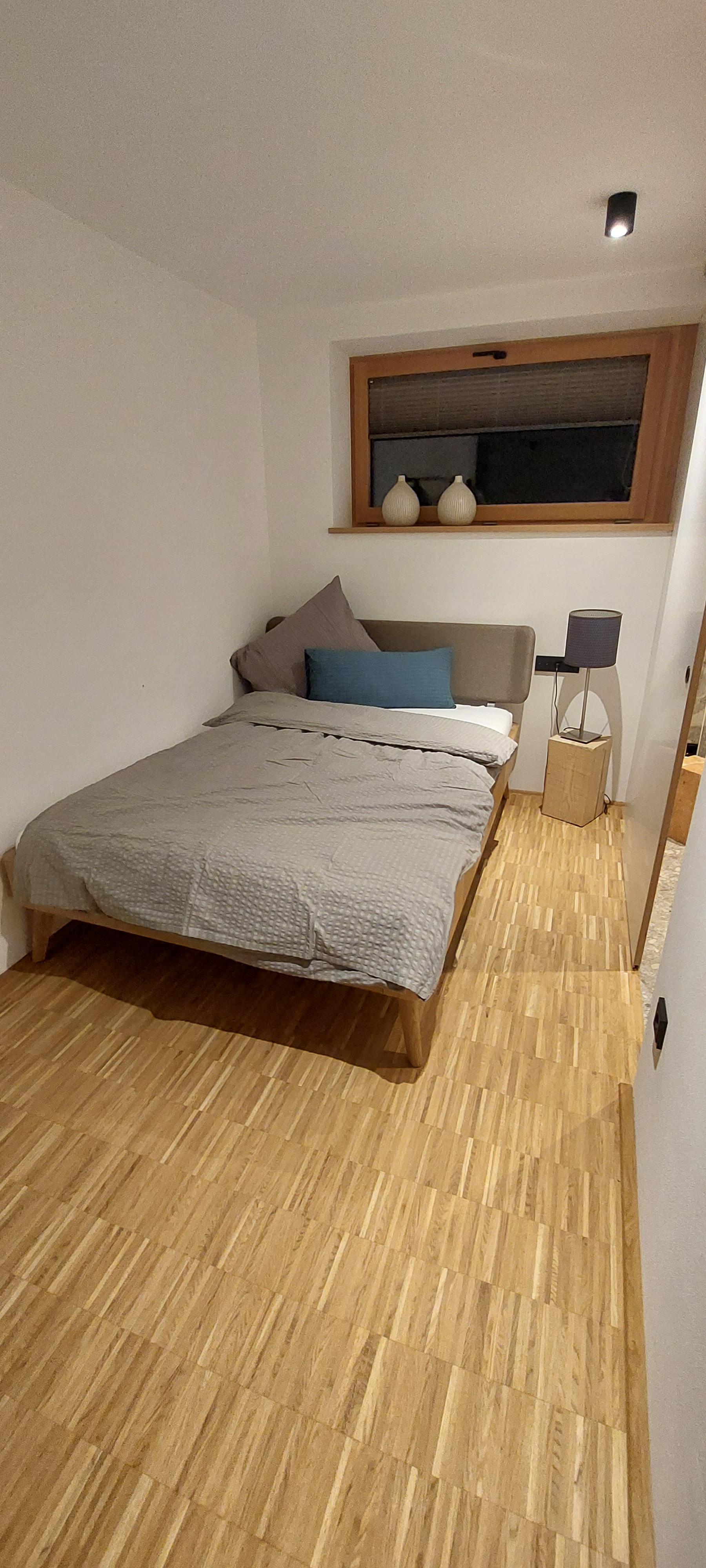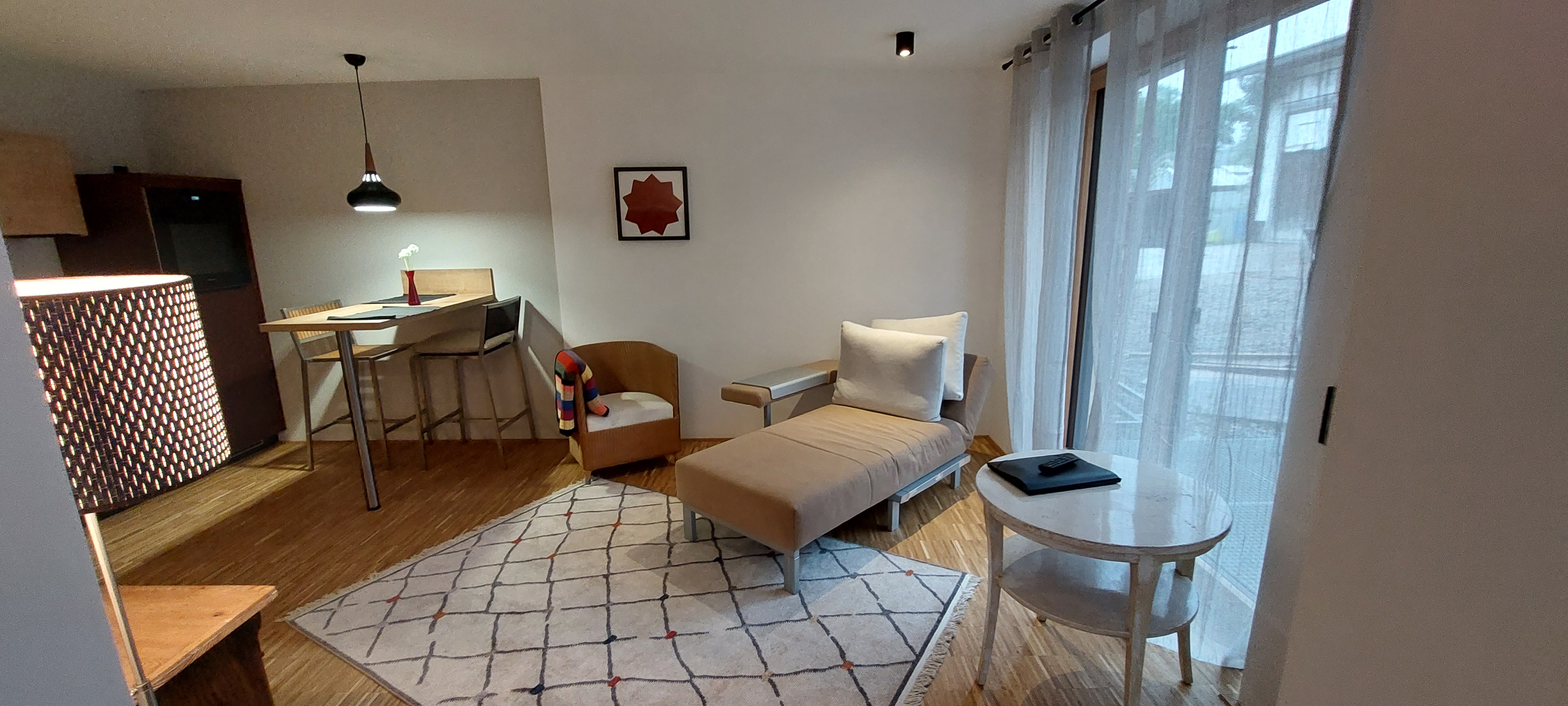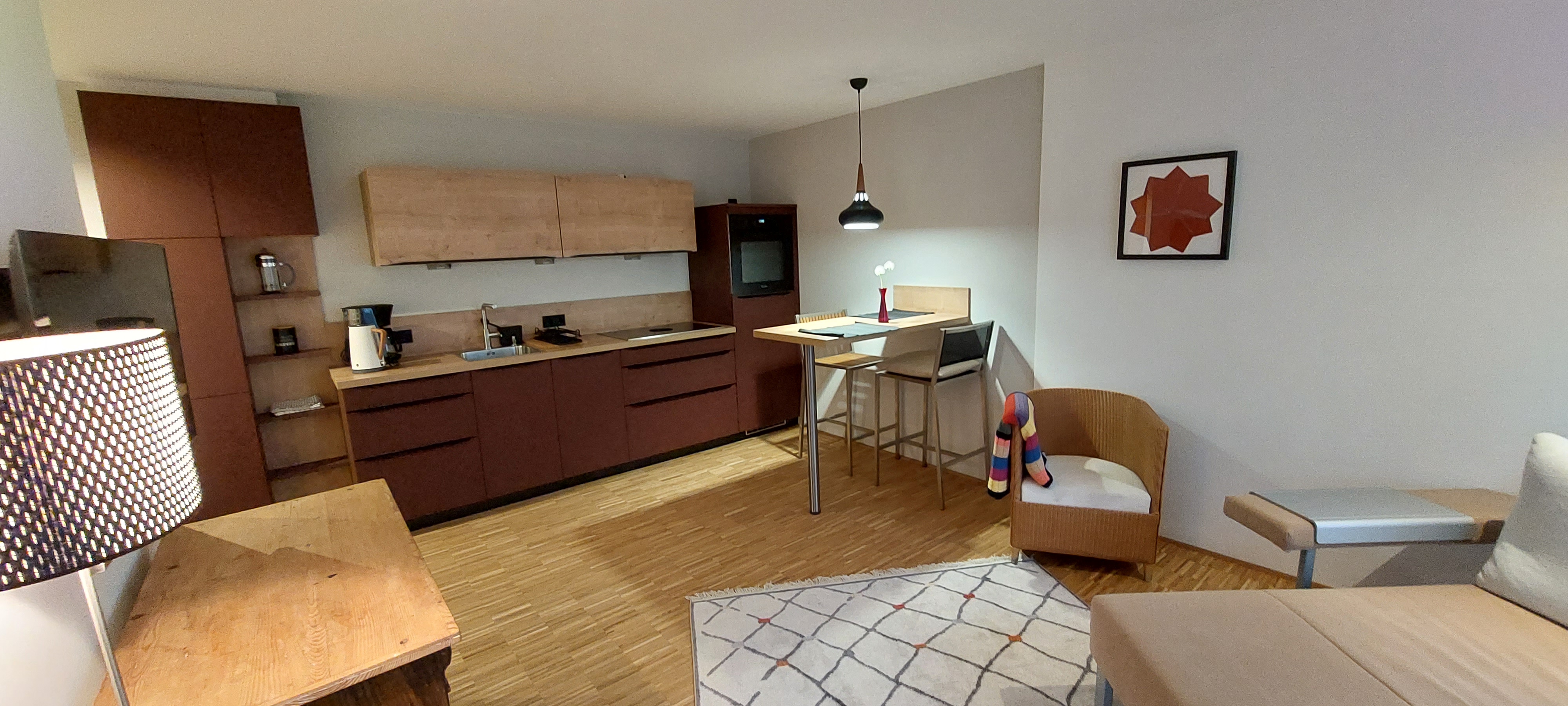 Unser 1 Zimmer-Appartement mit offenem Wohn- und Schlafraum (140 cm Bett) bietet Platz für 1-2 Personen. Die hochwertige Küchenausstattung (u.a. Induktionskochfeld, Geschirrspüler und Bora-Abzug), sowie die Ausstattung des Bades (Spülautomatik-Sensor und Regendusche) lassen keine Wünsche offen. Das Wohnambiente mit Sitztheke und Sofaliege, sowie ein kleiner Terrassenbereich laden zum Verweilen ein. Gerne kann auch unser großzügiger Obstgarten mit Blick auf die umliegenden Berge zum Entspannen genutzt werden.