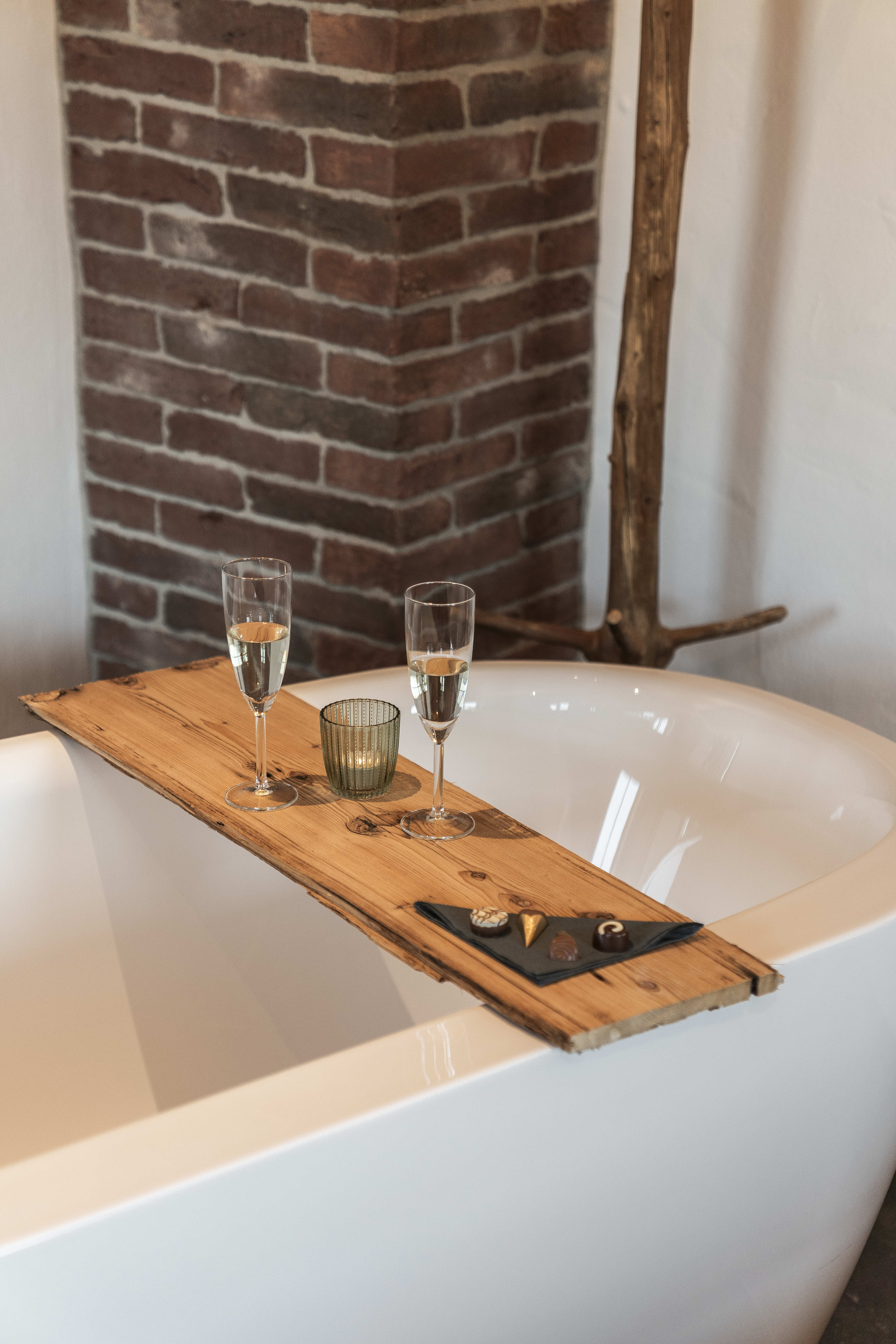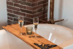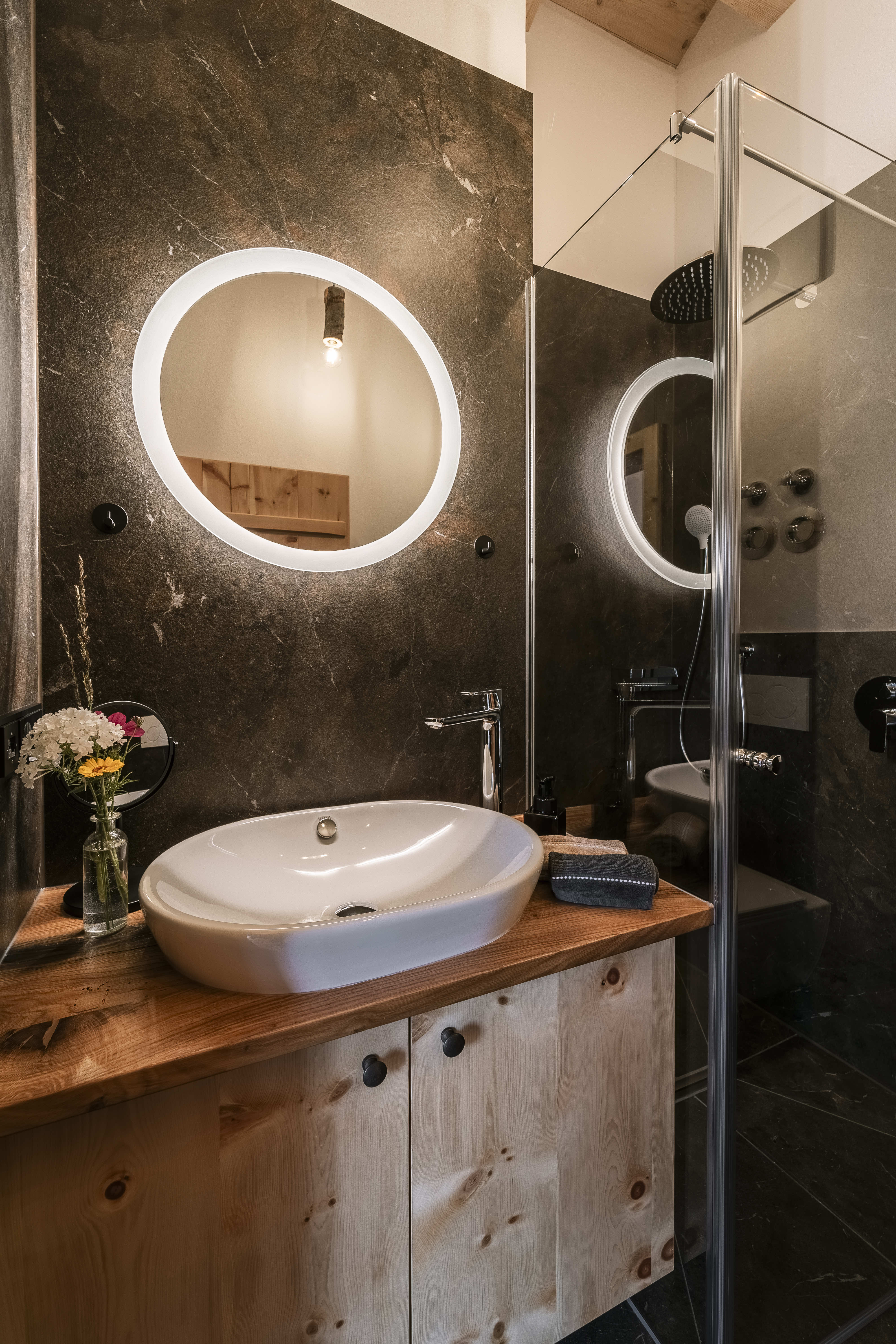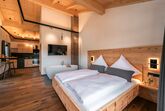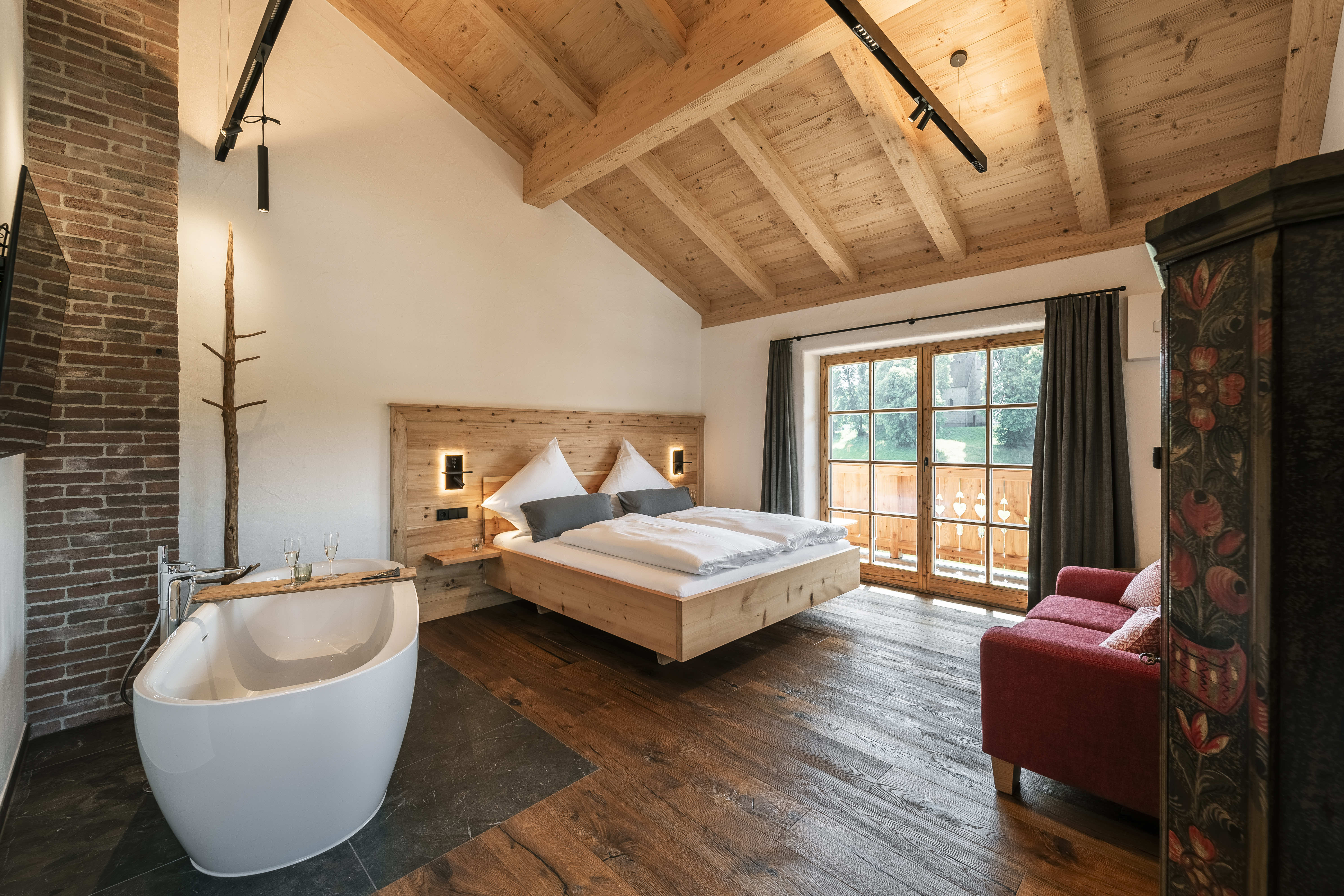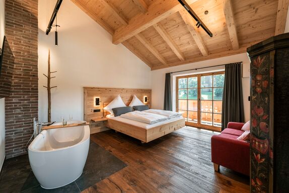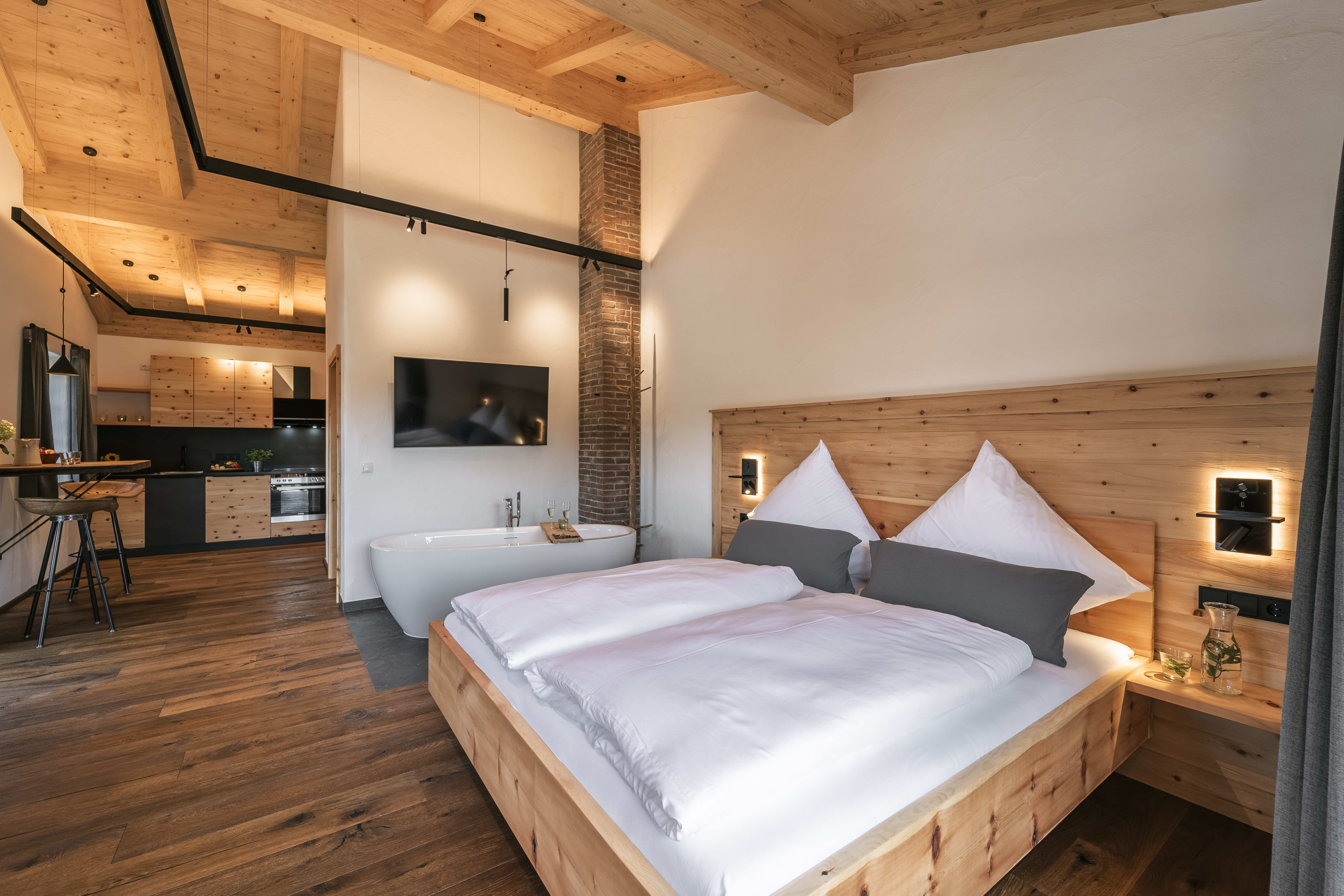 Unser romantisches Loft für Zwei mit freistehende Badewanne. Das Apartment Georg wurde ganz der Zirbe gewidmet – ihr Duft unterstützt wunderbar wohltuend Deinen Schlaf. Wohn- und Schlafraum sind harmonisch kombiniert und um einen Süd-Balkon sowie eine große Dachterrasse mit Himmelsliegen erweitert.