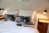 Nachttischlampe und Beleuchtung ist vom Bett aus schaltbar. Steckdosen neben dem Bett vorhanden.