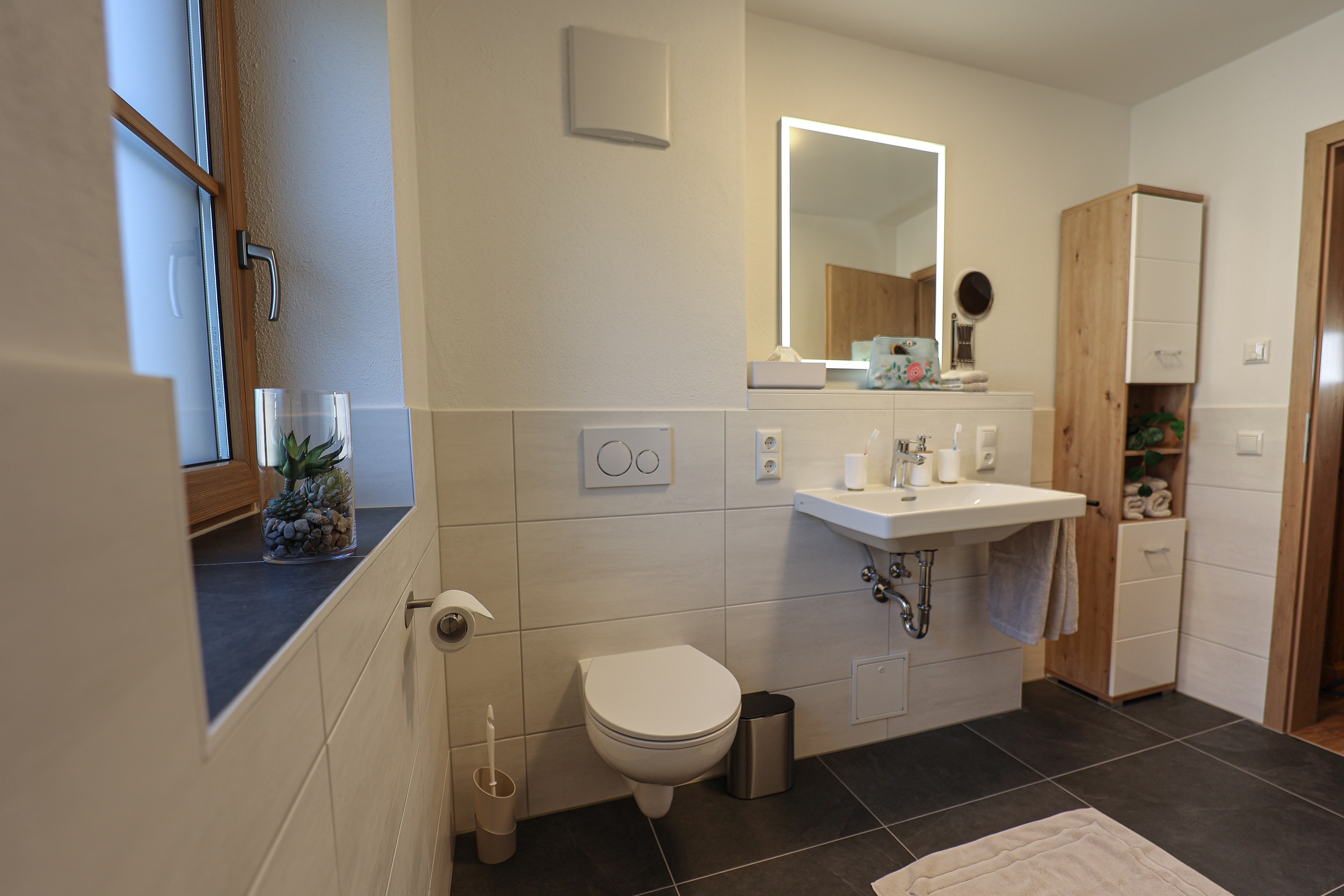 In unseren Bädern finden Sie ausreichend Frottiertücher, einen Handtuchwärmer, sowie eine ebenerdig