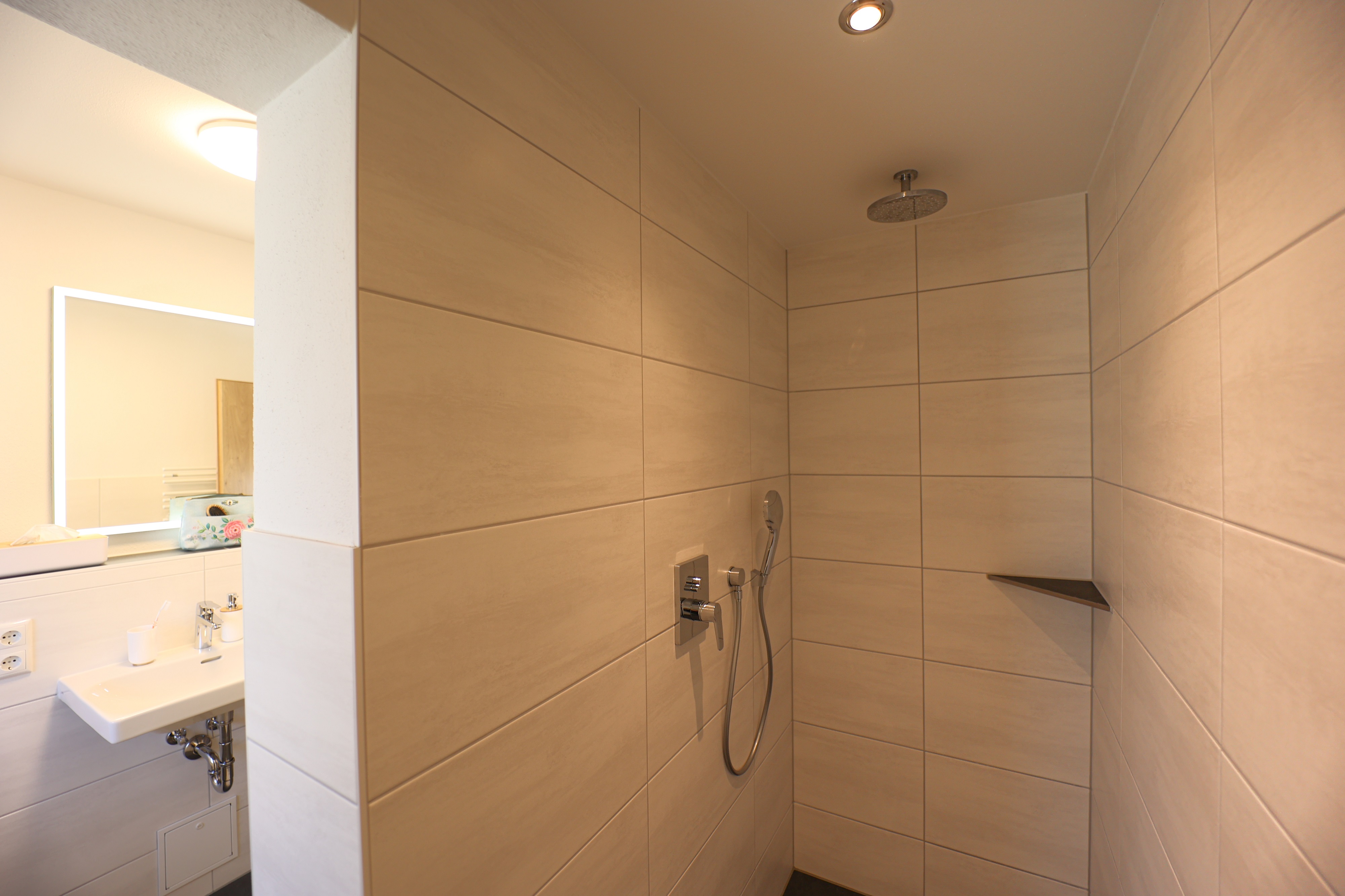 begehbare Regendusche. Haartrockner und Vergrößerungsspiegel vorhanden.
