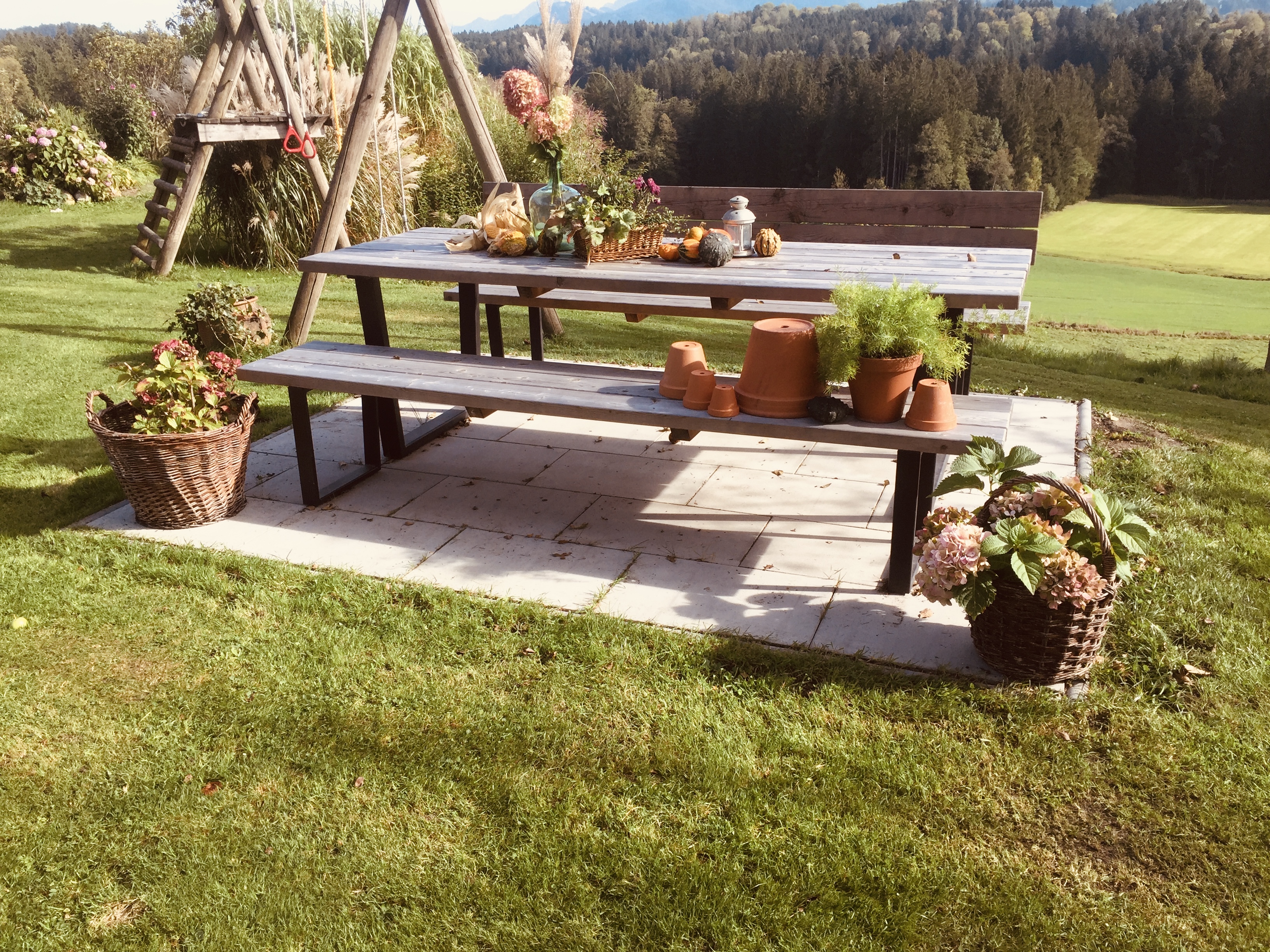 Unsere 5* Ferienwohnung Bauerngarten bietet Ihnen auf der Sonnenterrasse aus Holz einen Blick auf die Chiemgauer Alpen. Der Innenbereichen mit 105qm und der offenen Raumgestaltung bietet Ihnen einen Platz für entspannte Momente.