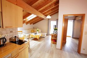 Wohnung mit Balkon oder Terrasse, herrlichem Bergblick, Wohnzimmer mit großem Flachbildschirmfernseher, geräumiges Bad mit Dusche & WC, Küchenzeile mit Cerankochfeld, Kaffeemaschine und Mikrowelle, Sitzgruppe mit Esstisch,großer Couch-Sitzgruppe und einem separaten Schlafzimmer mit Doppelbett. (Bettengröße 1,80 mal 2 Meter) Das Wohnzimmer hat ein Doppelbett in einem abgeteilten Bereich des Wohnzimmers / oder Wohnung mit Sichtdachstuhl, herrlichem Bergblick und Balkon, mit separatem Schlafzimmer und 2 getrennten Betten in einem abgeteilten Bereich des Wohnzimmers.