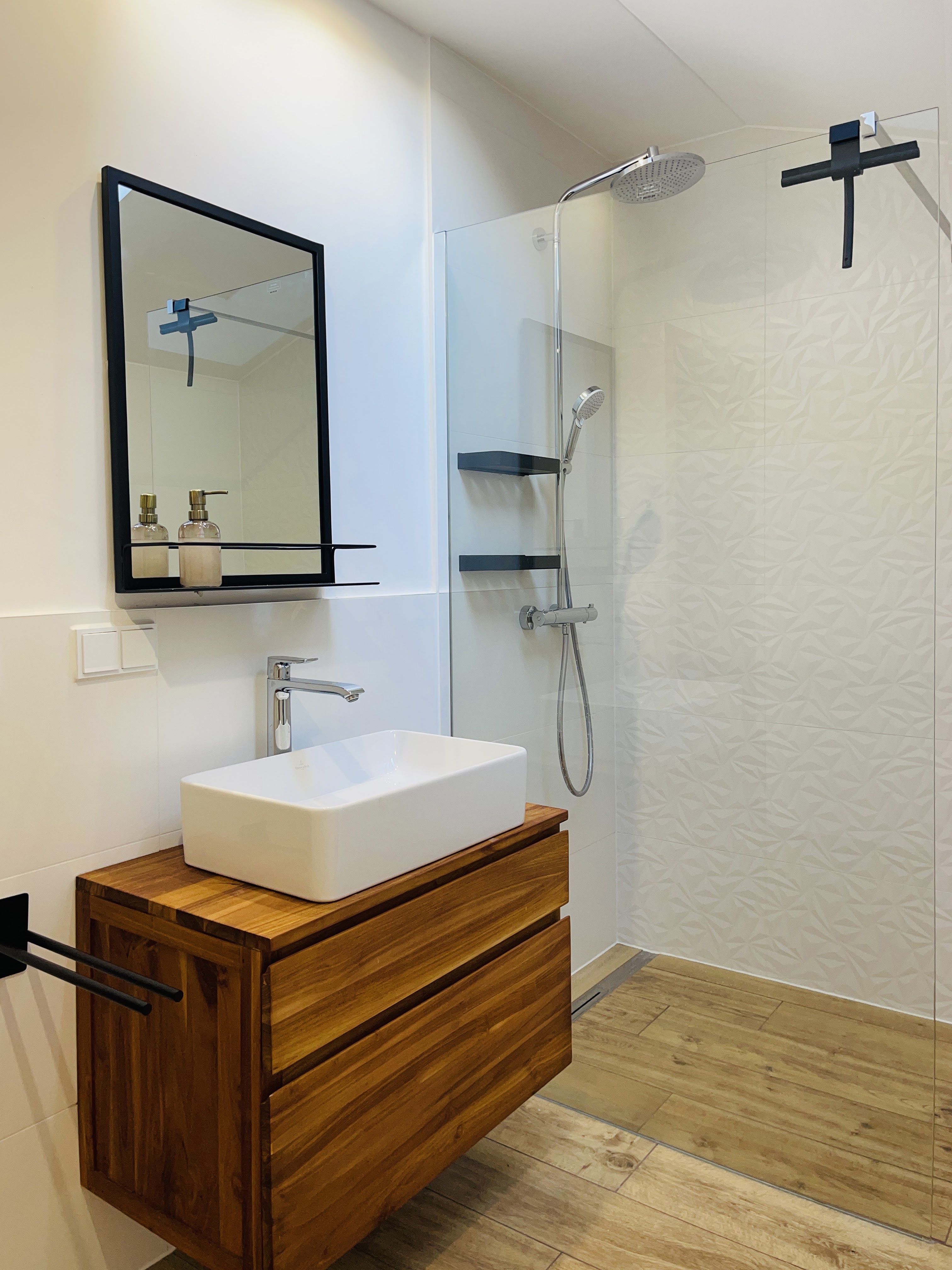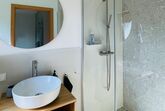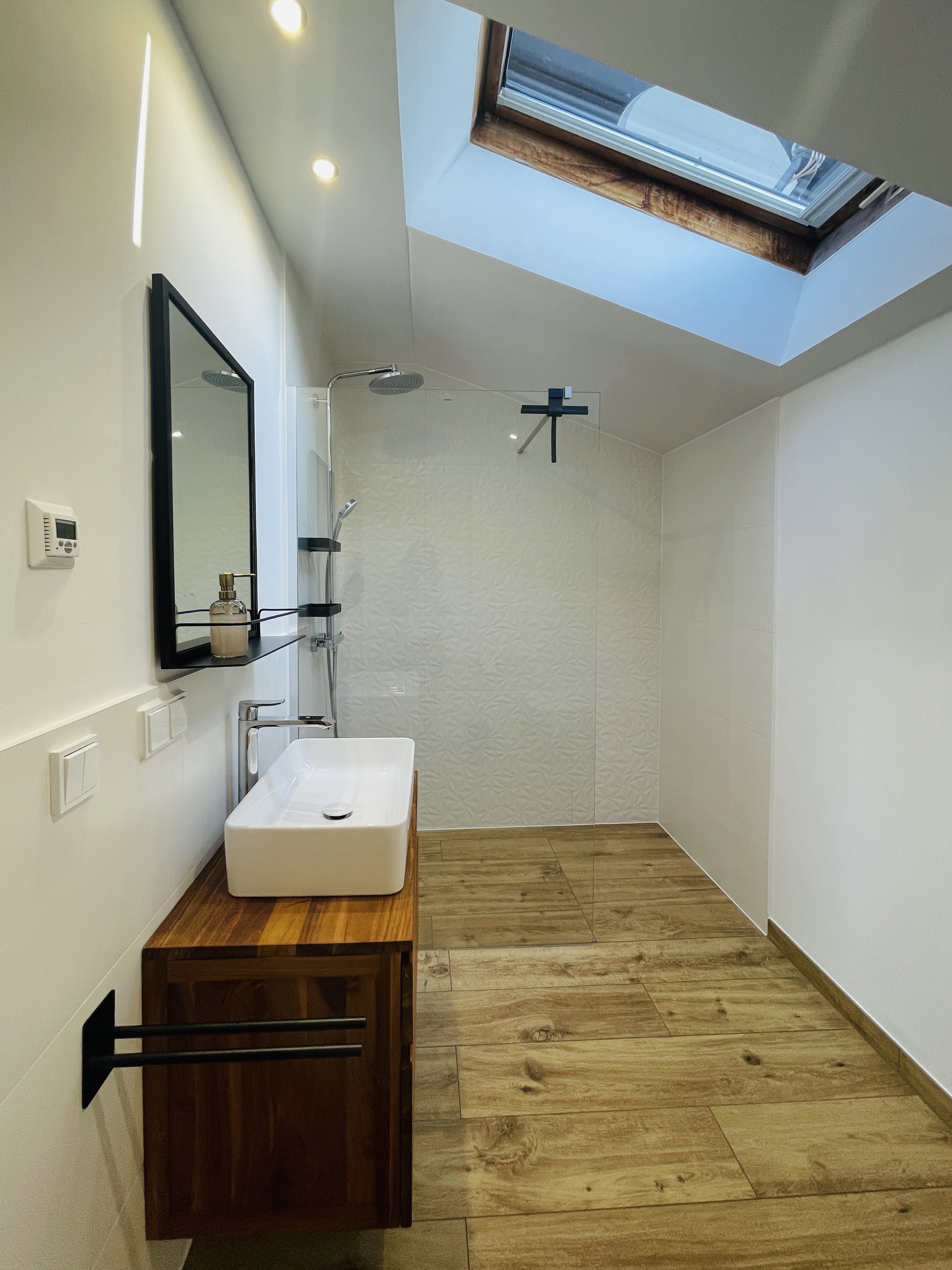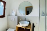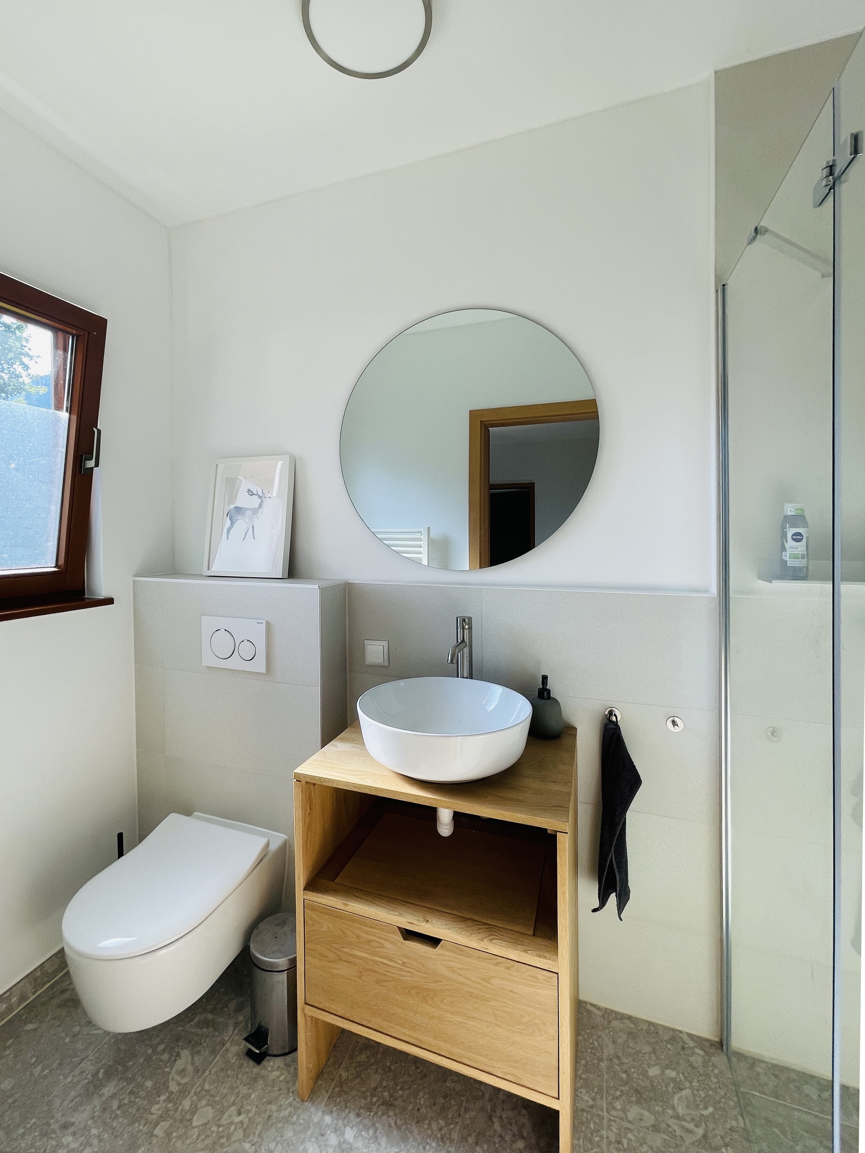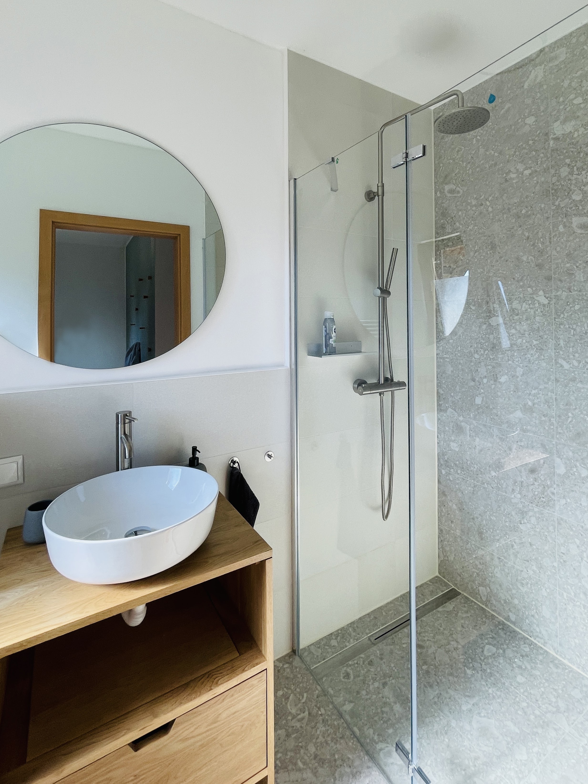 Das helle Tageslichtbad im Obergeschoss verfügt über eine geräumige Dusche, ein Waschbecken und ein WC. Der überdachte Balkon mit tollem Blick auf die angrenzenden Berge lädt ebenfalls zum Entspannen ein.