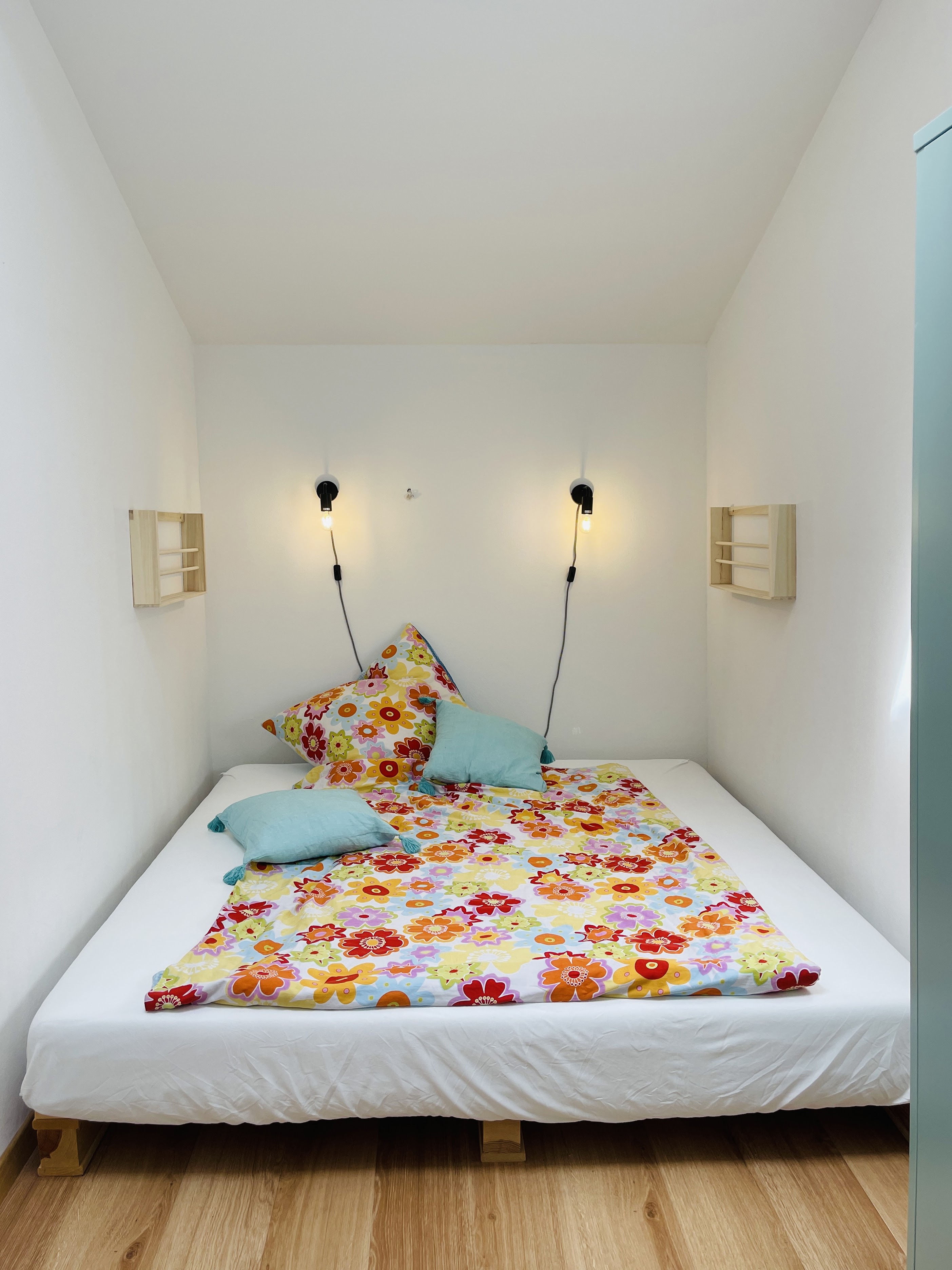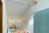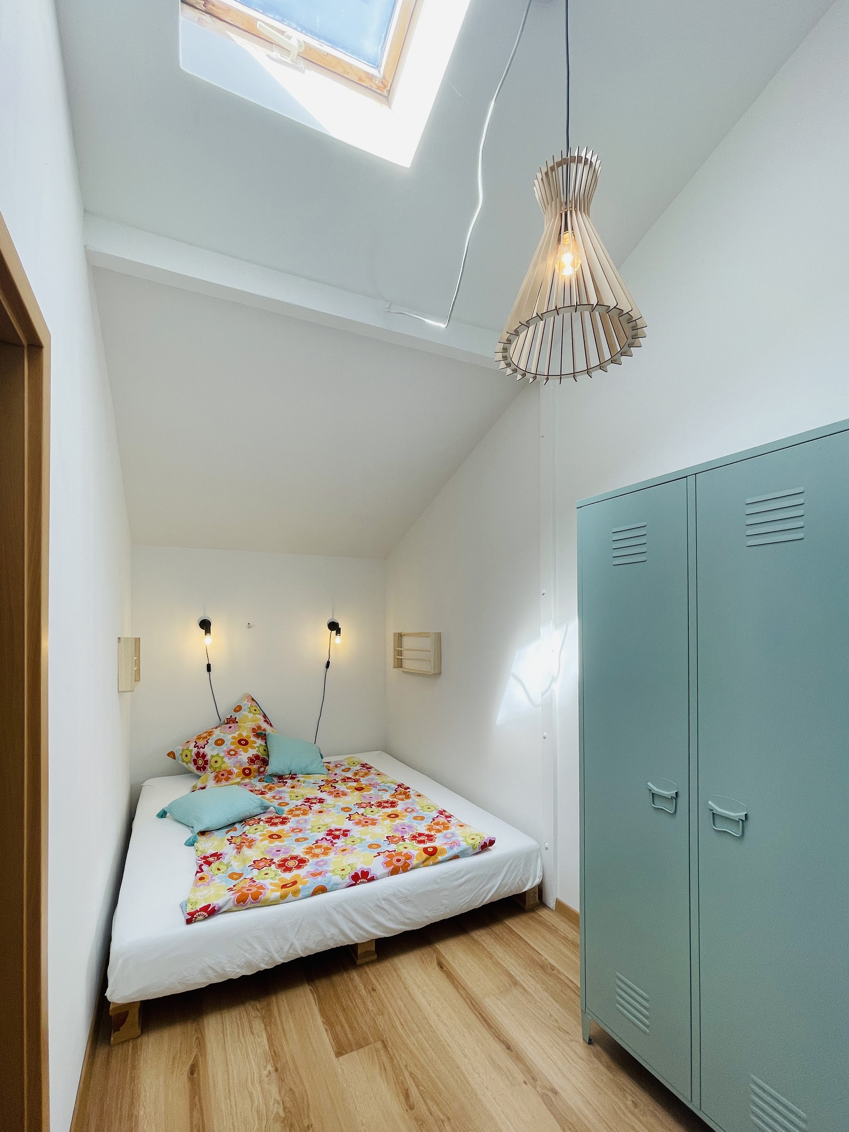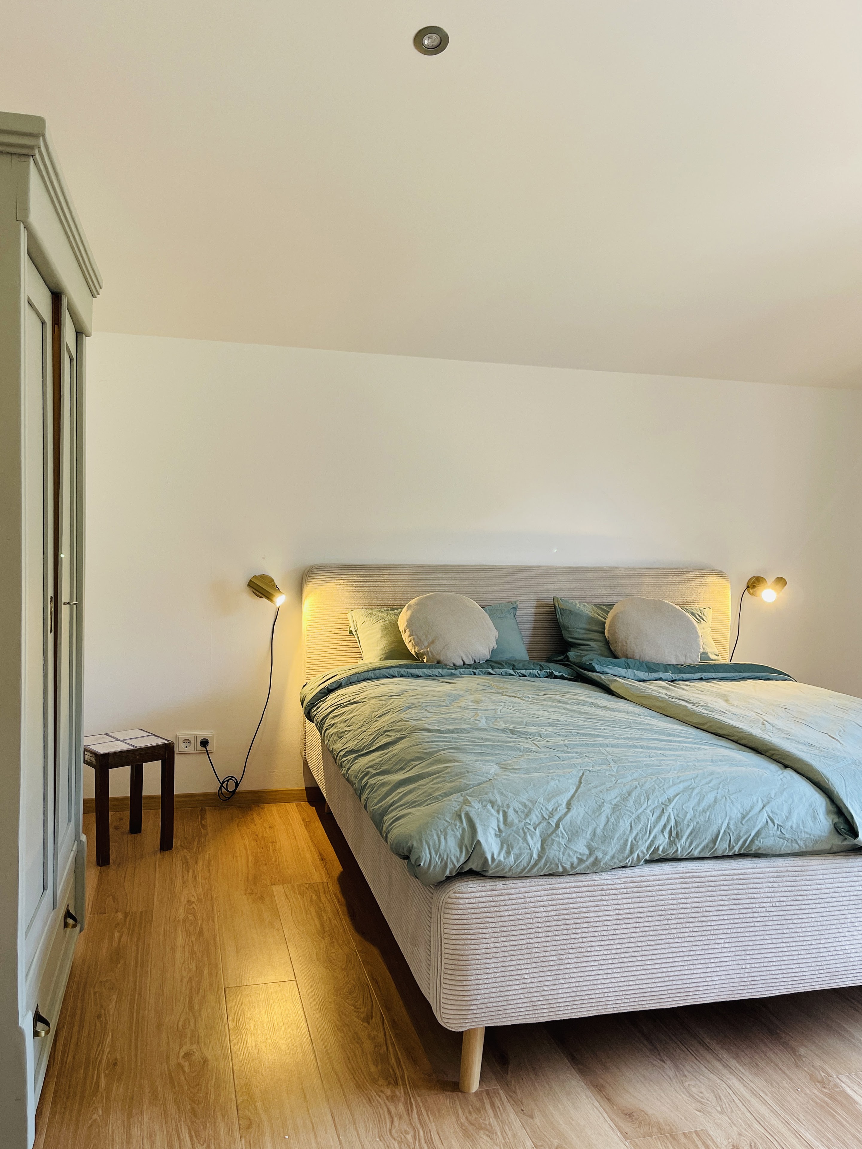 Im Obergeschoss befinden sich die 3 Schlafzimmer und 1 Badezimmer. 2 Schlafzimmer haben ein großes Doppelbett (180 x 200 cm). Das 3. Schlafzimmer verfügt über 2 Einzelbetten (90 x 200 cm), die auch zu einem Doppelbett zusammengeschoben werden können.
