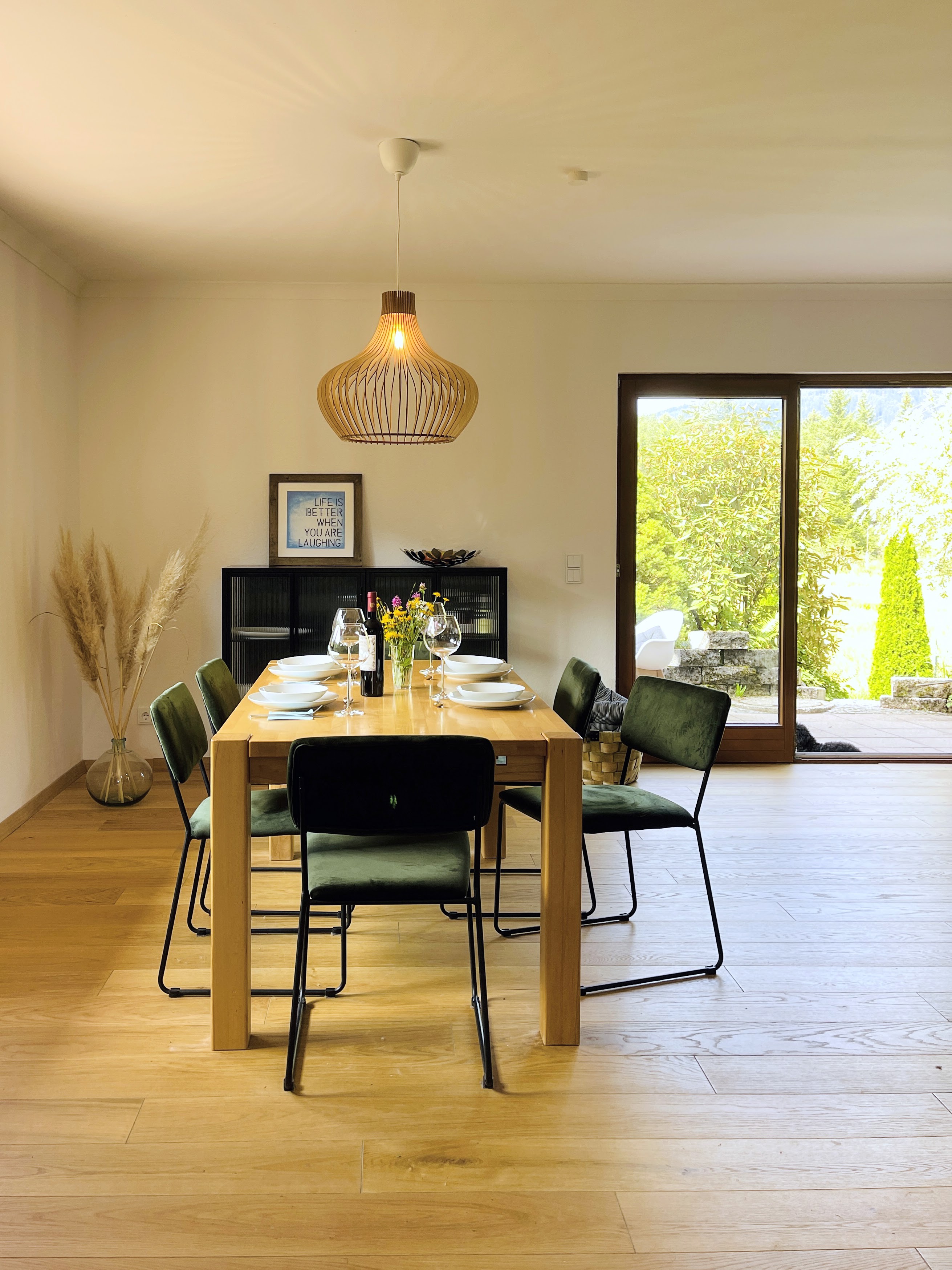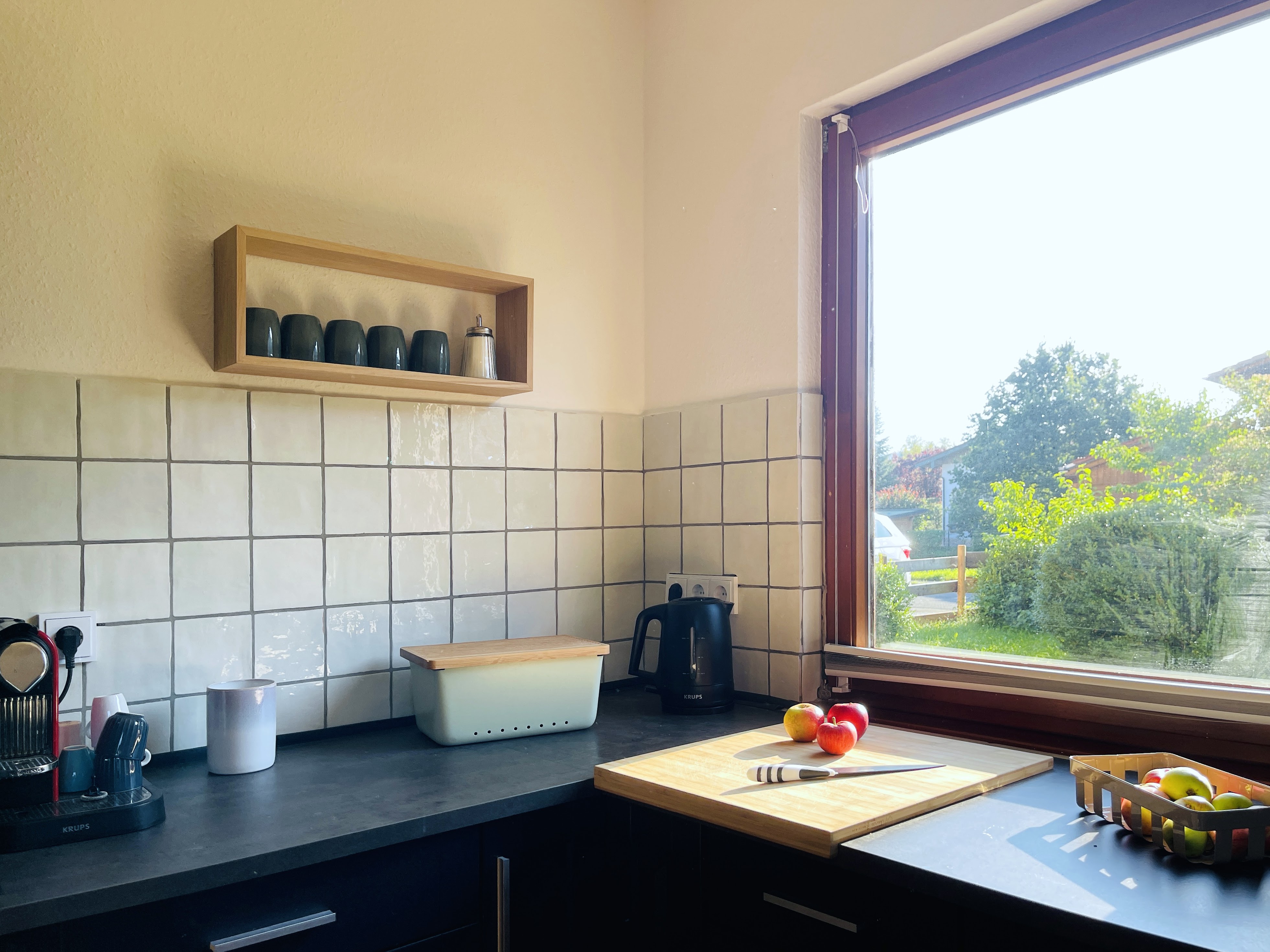 Der helle, sehr geräumige Wohn-Essbereich verfügt über eine gemütliche Couch und einen Esstisch für 6 Personen. Die Küche ist komplett eingerichtet mit Geschirrspüler, Mikrowelle, Kühlschrank/ Gefrierfach, Cerankochfeld, Kaffeemaschine (Nespresso & Filtermaschine), Wasserkocher, Toaster, etc.