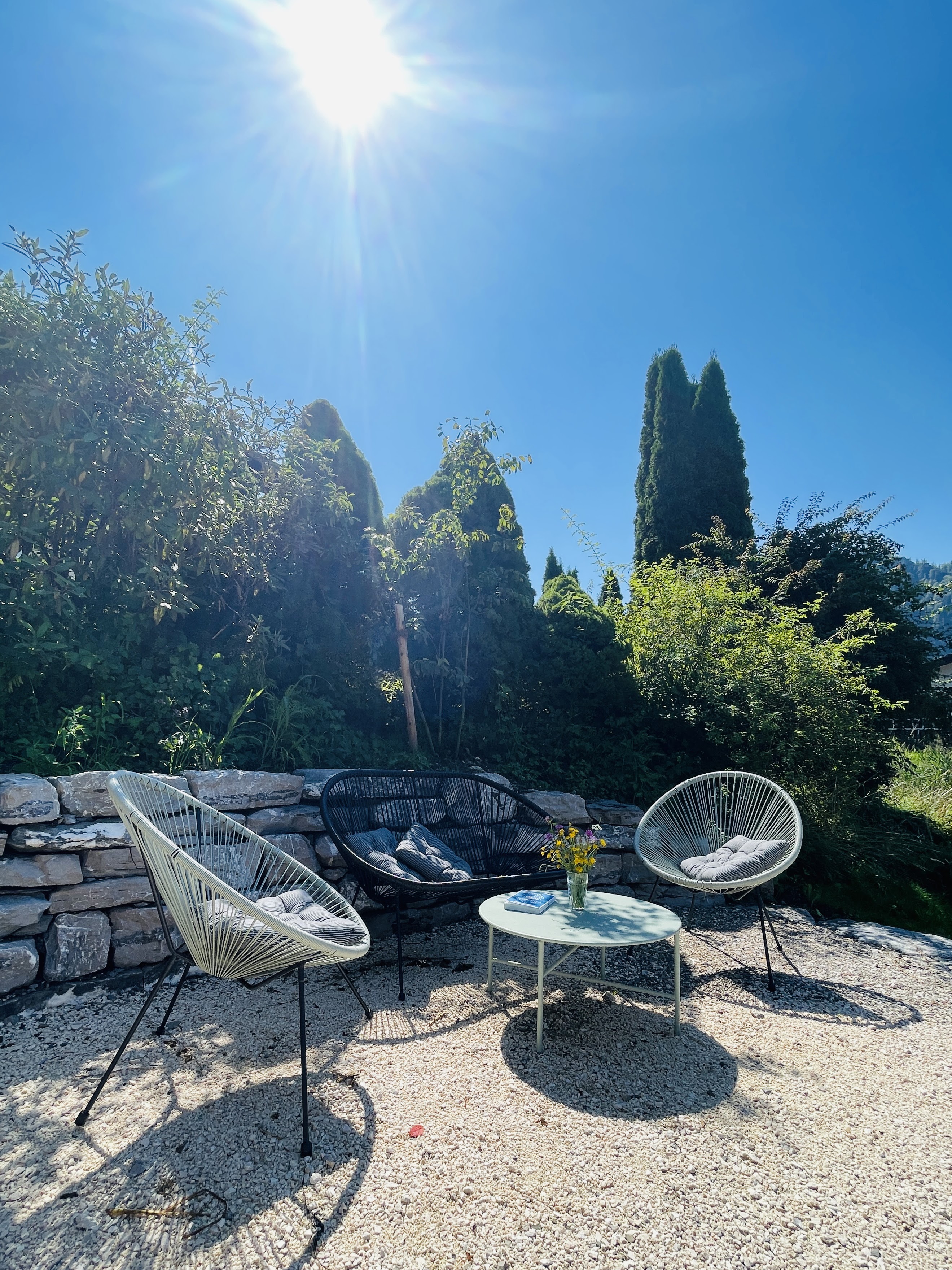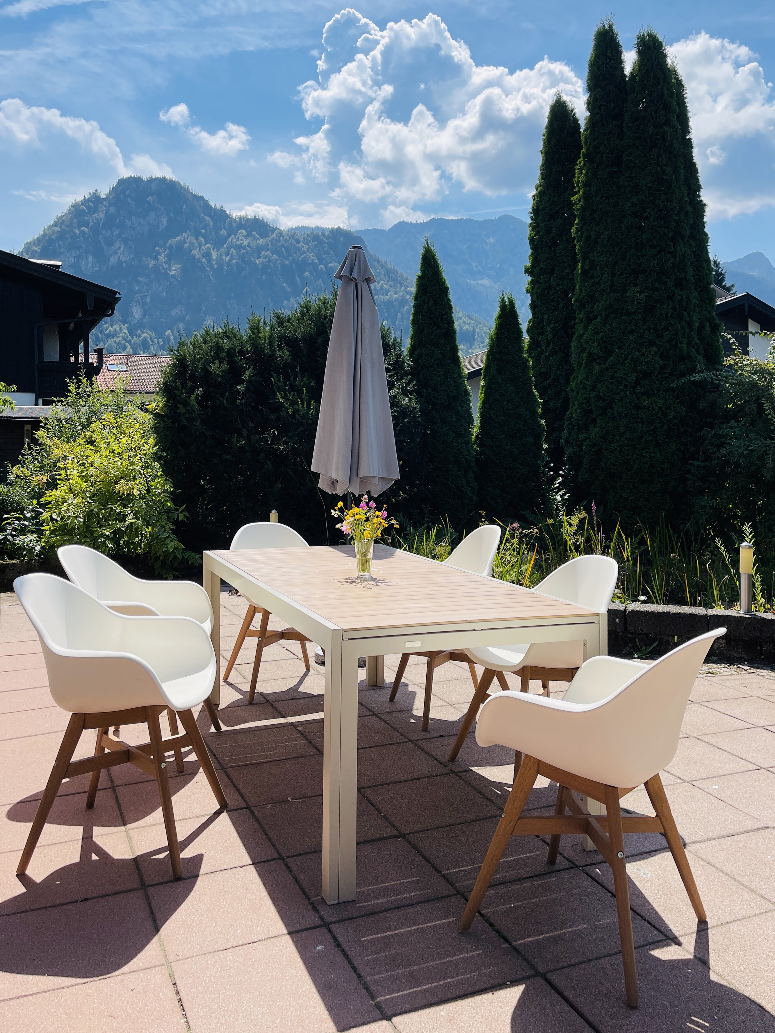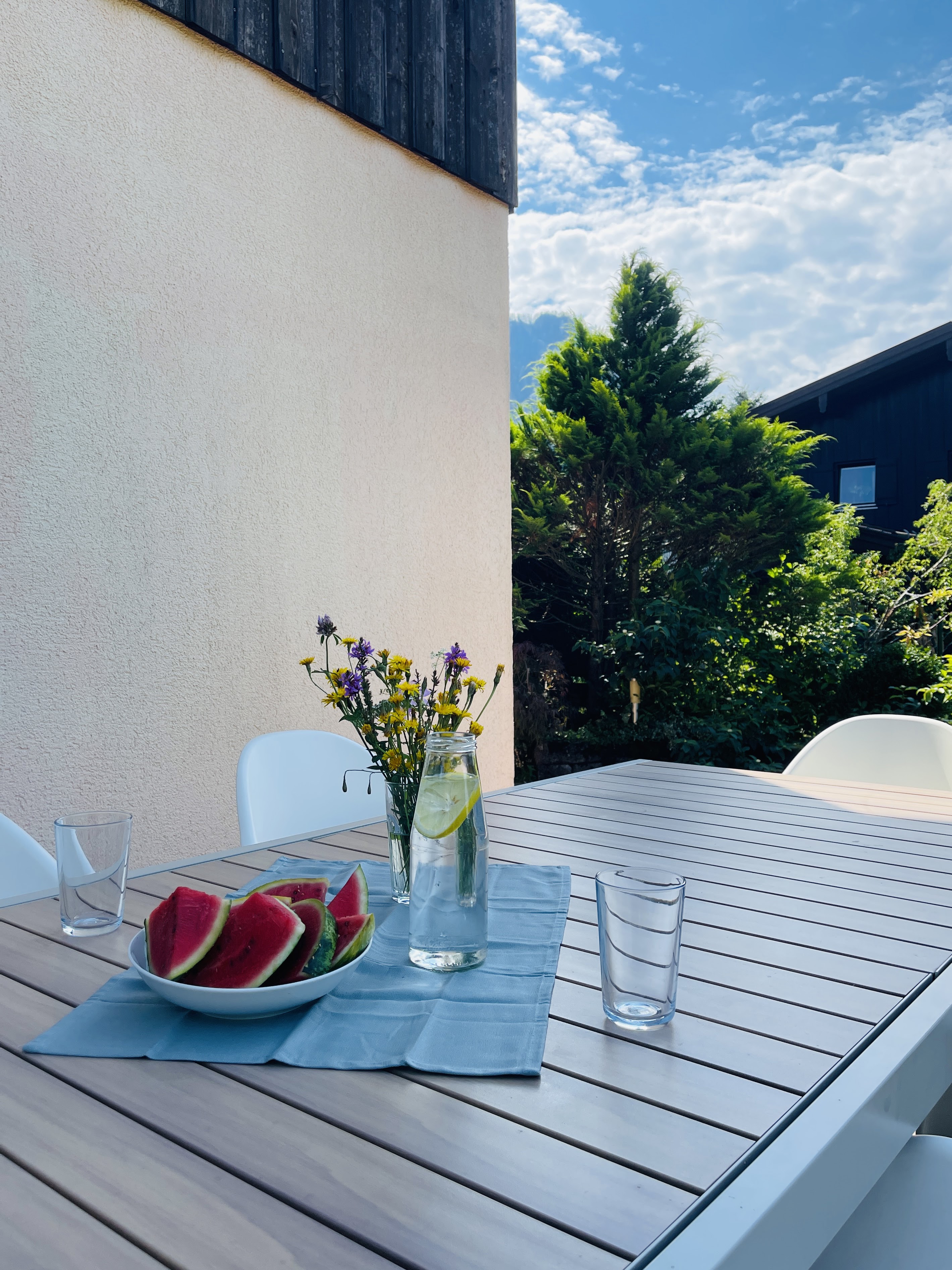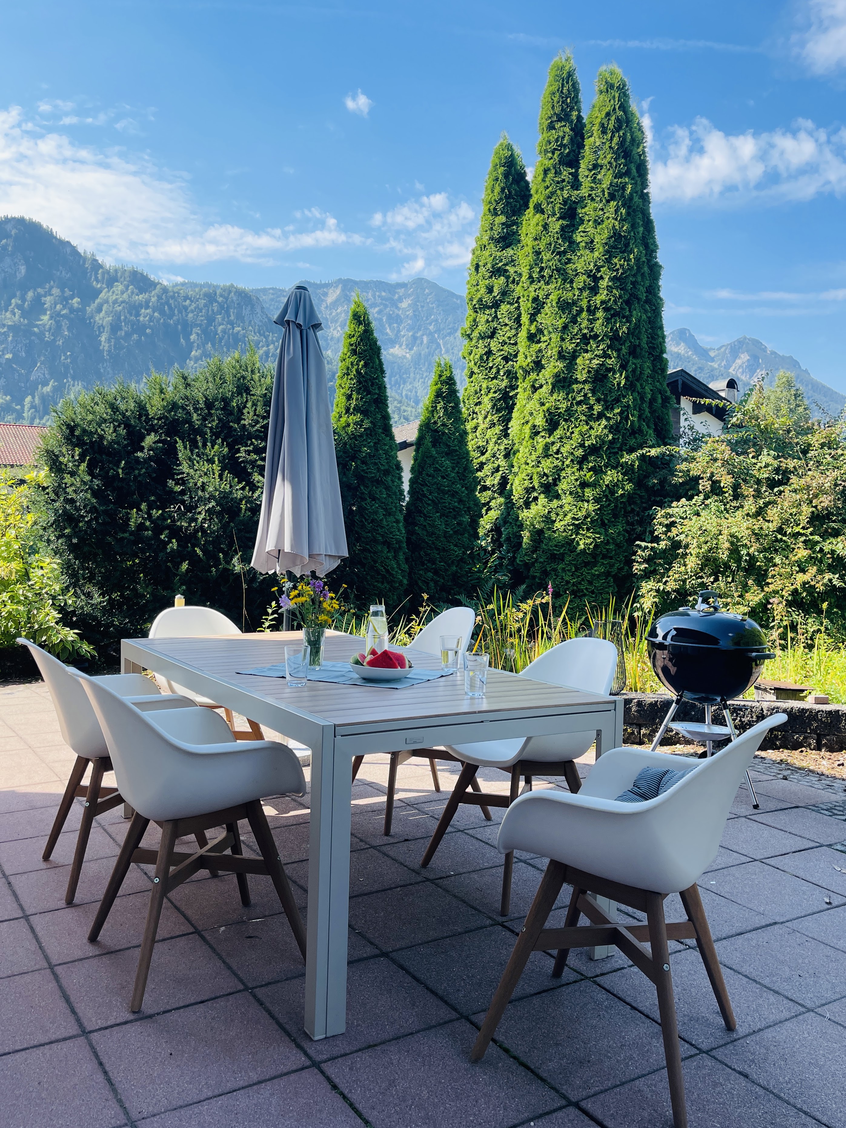 Vom Wohn-Essbereich gelangen Sie auf die große Sonnenterrasse mit traumhaften Rundum-Bergblick. Schöne Gartenmöbel, eine Lounge Ecke und ein Grill warten auf Sie.