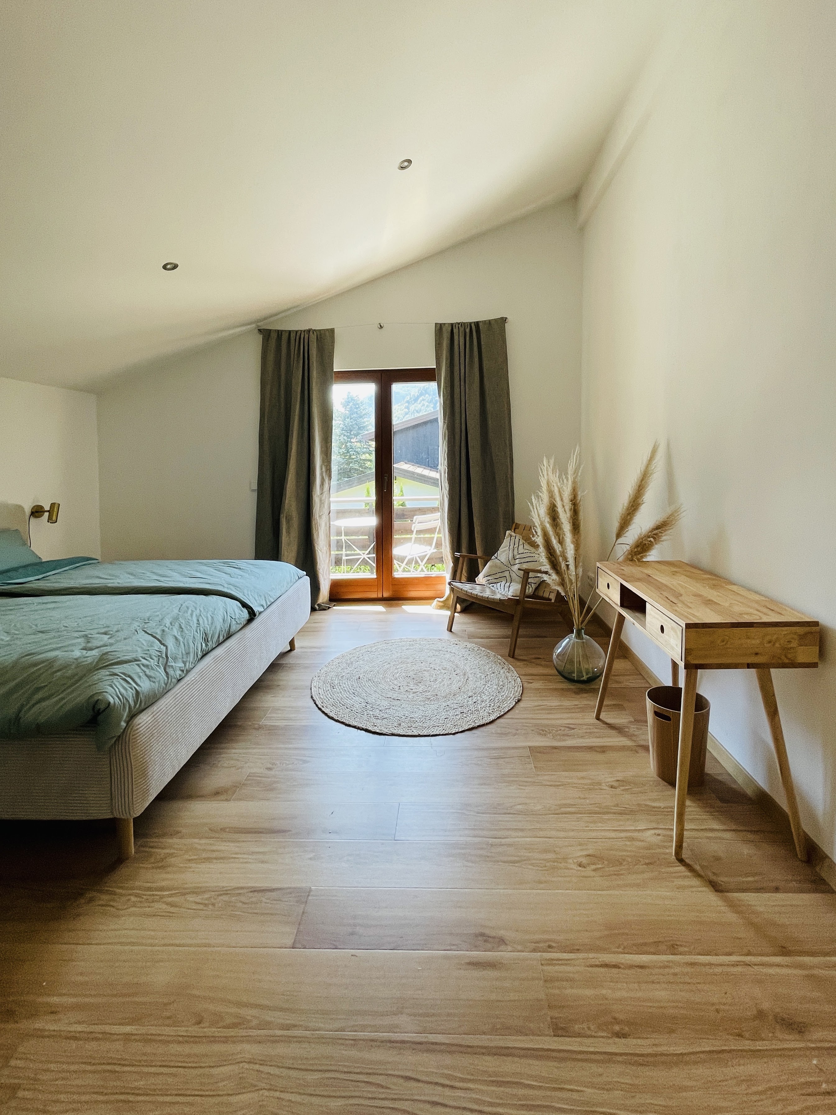 Im Obergeschoss befinden sich die 3 Schlafzimmer und 1 Badezimmer. 2 Schlafzimmer haben ein großes Doppelbett (180 x 200 cm). Das 3. Schlafzimmer verfügt über 2 Einzelbetten (90 x 200 cm), die auch zu einem Doppelbett zusammengeschoben werden können. Das helle Tageslichtbad im Obergeschoss verfügt über eine geräumige Dusche, ein Waschbecken und ein WC. Der überdachte Balkon mit tollem Blick auf die angrenzenden Berge lädt ebenfalls zum Entspannen ein.