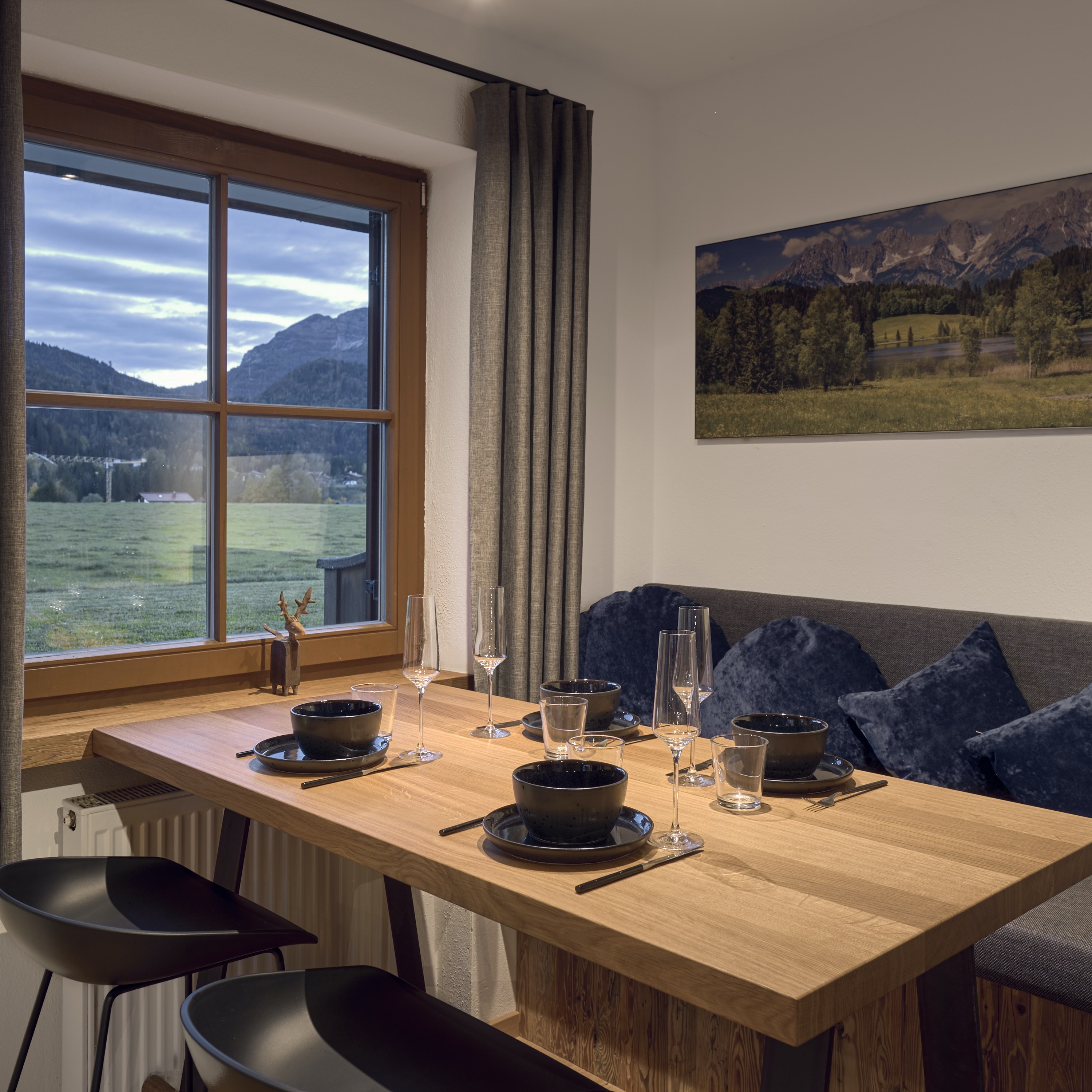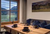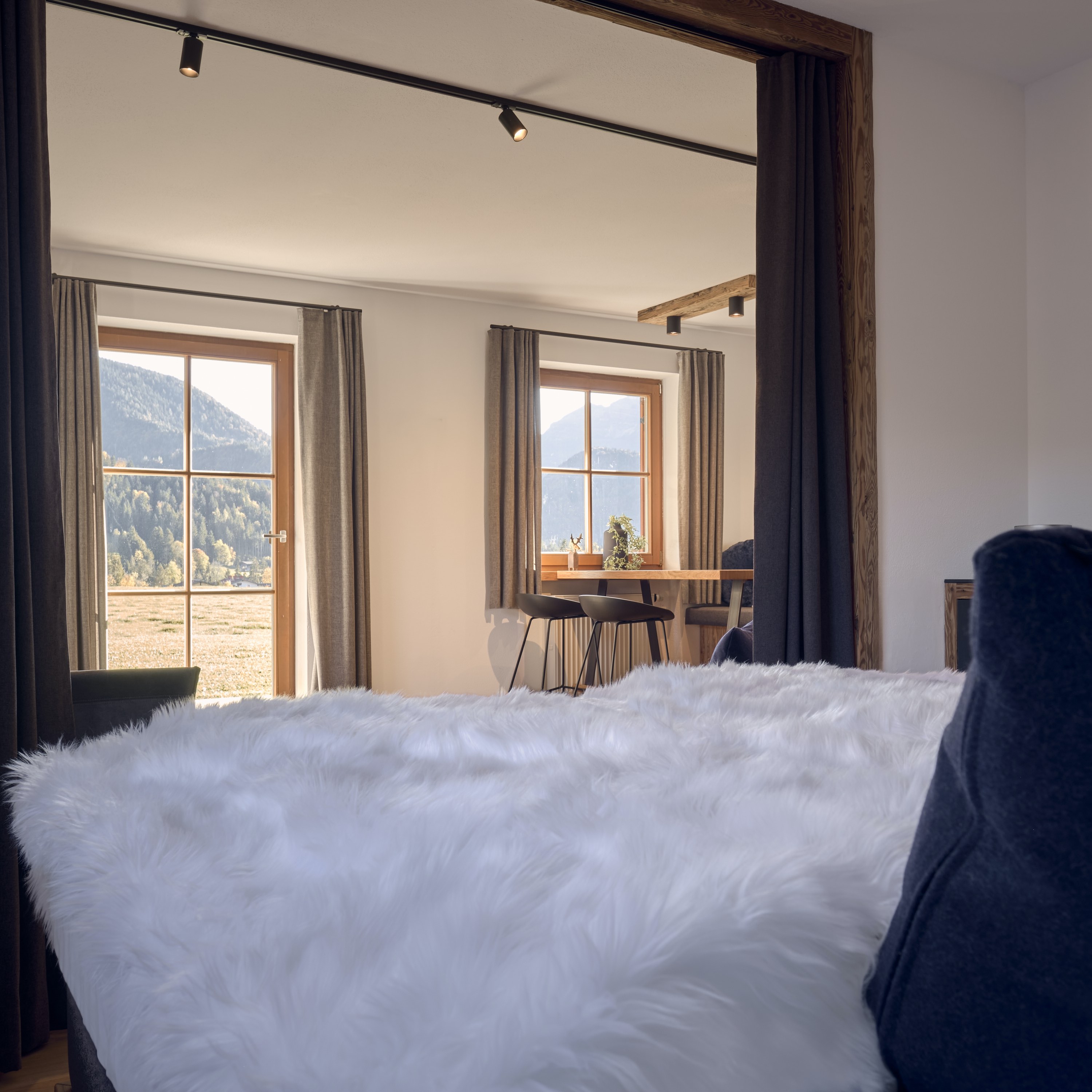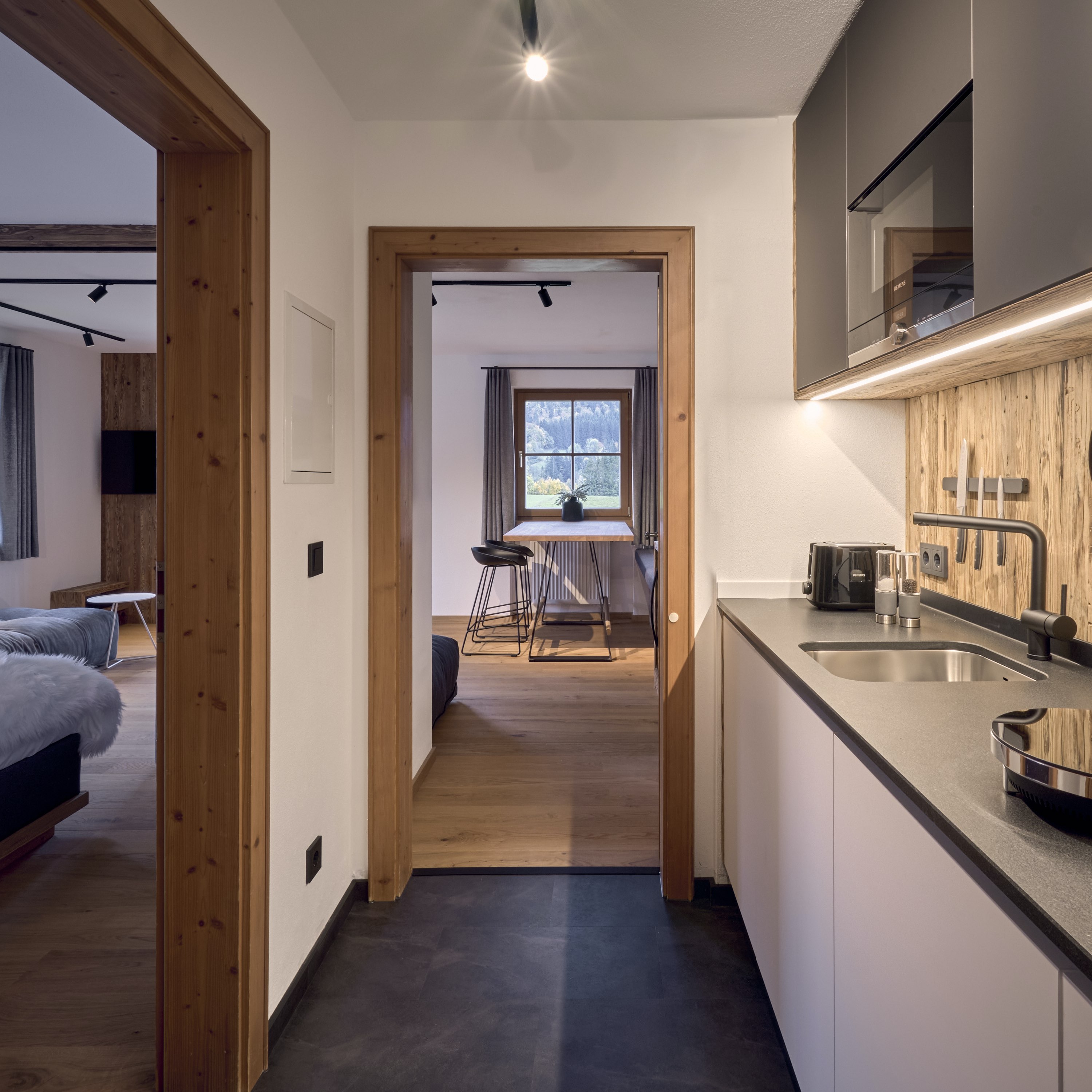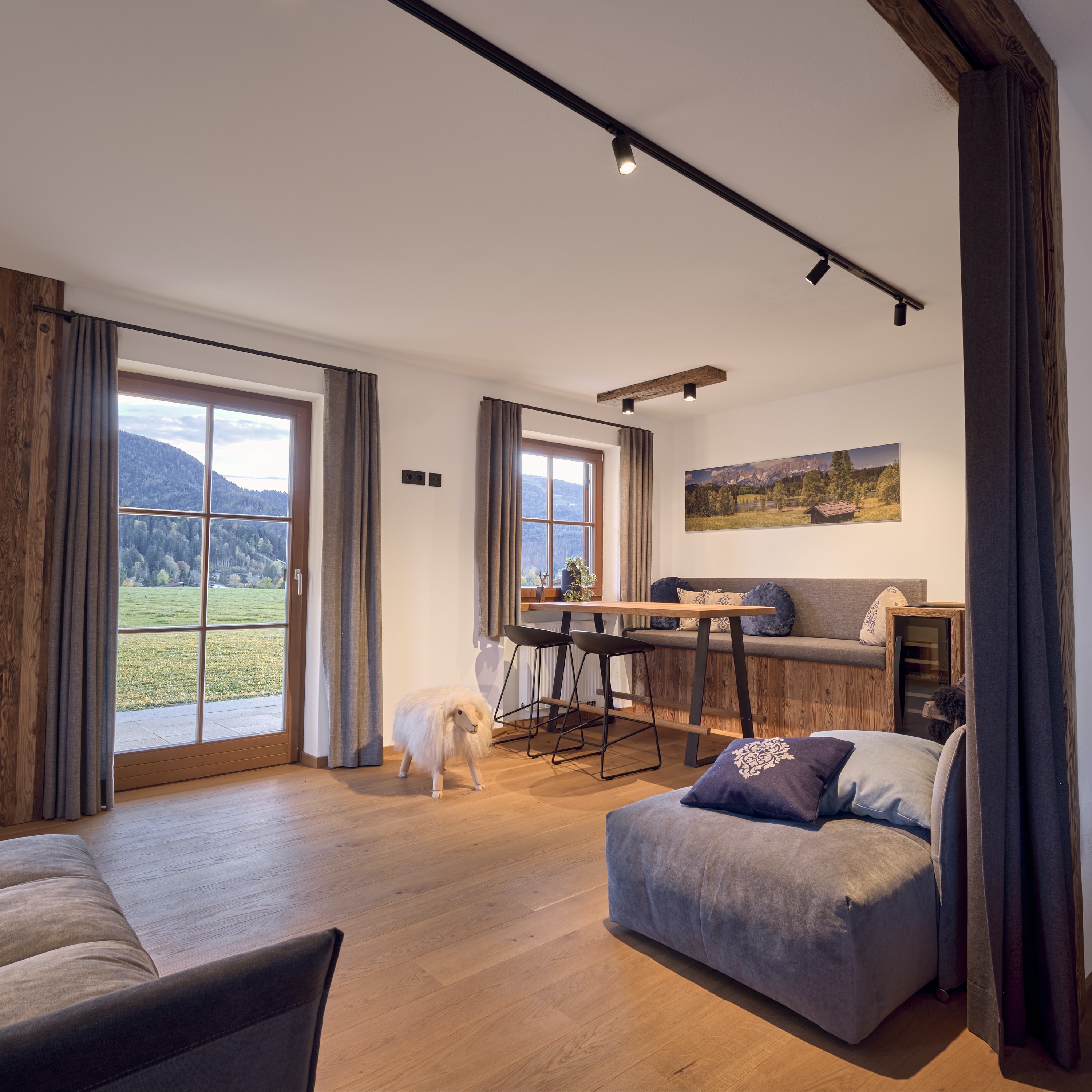 Design meets Natur: ideal für den Urlaub zu zweit. Ein mit viel Holz verarbeitetes, gemütliches Design auf 40qm Wohnfläche. Das zum Wohnzimmer offene Schlafzimmer erlaubt den Blick direkt nach draußen auf die Berge. Aufstehen aus dem urgemütlichen Boxsprignbett daher nicht zwingend erforderlich. Die kleine, aber feine, vollausgestattet Küche erlaubt das vollwertige Kochen auf kleinstem Raum dank 2-Platten Induktionsherd, vollwertigem Kühlschrank und kombinierter Mikrowellen-/Grilleinheit. Zu jedem Apartment gehört eine größzügige Terrasse oder Balkon mit Tisch und Stühlen. Der Cloo - jedes Apartment verfügt über einen Weinkühlschrank.