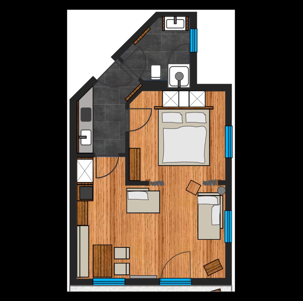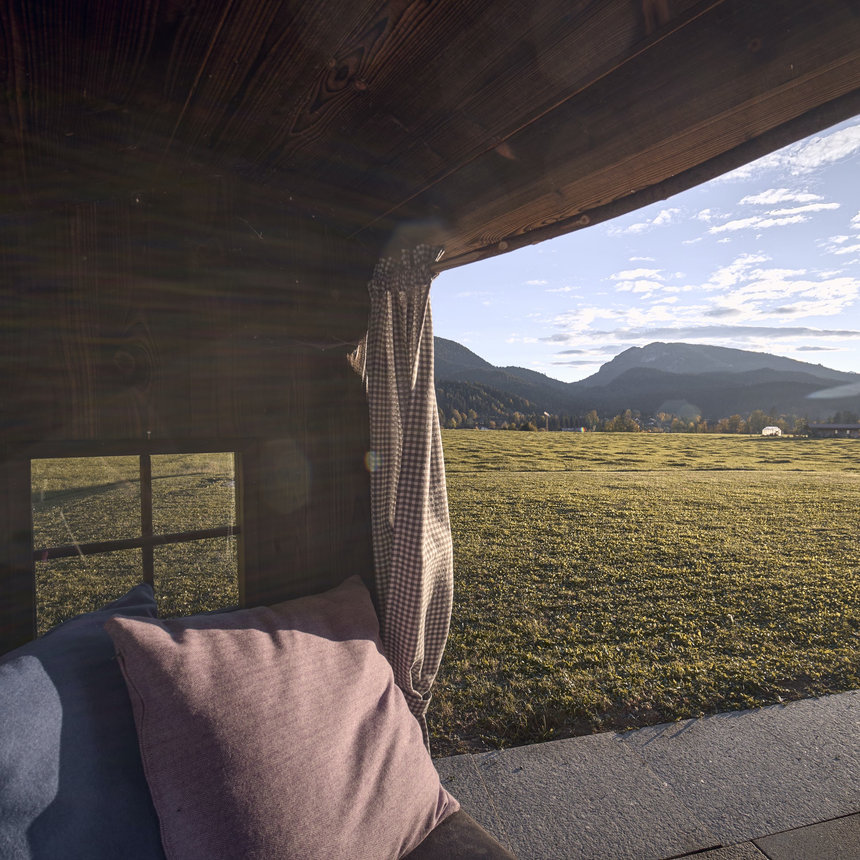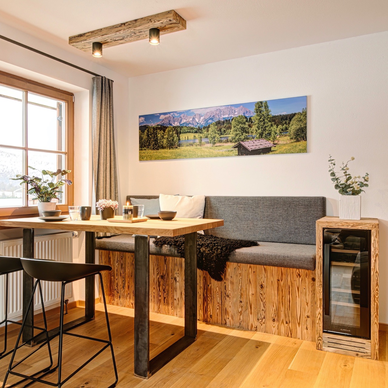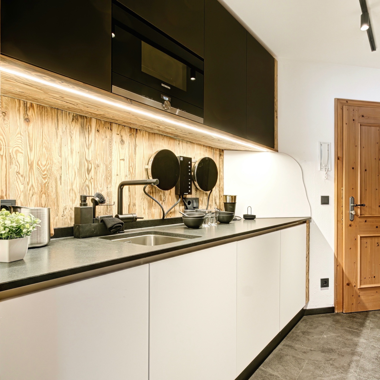 Design meets Natur: ideal für den Urlaub zu zweit. Ein mit viel Holz verarbeitetes, gemütliches Design auf 40qm Wohnfläche. Das zum Wohnzimmer offene Schlafzimmer erlaubt den Blick direkt nach draußen auf die Berge. Aufstehen aus dem urgemütlichen Boxsprignbett daher nicht zwingend erforderlich. Die kleine, aber feine, vollausgestattet Küche erlaubt das vollwertige Kochen auf kleinstem Raum dank 2-Platten Induktionsherd, vollwertigem Kühlschrank und kombinierter Mikrowellen-/Grilleinheit. Zu jedem Apartment gehört eine größzügige Terrasse oder Balkon mit Tisch und Stühlen. Der Cloo - jedes Apartment verfügt über einen Weinkühlschrank.