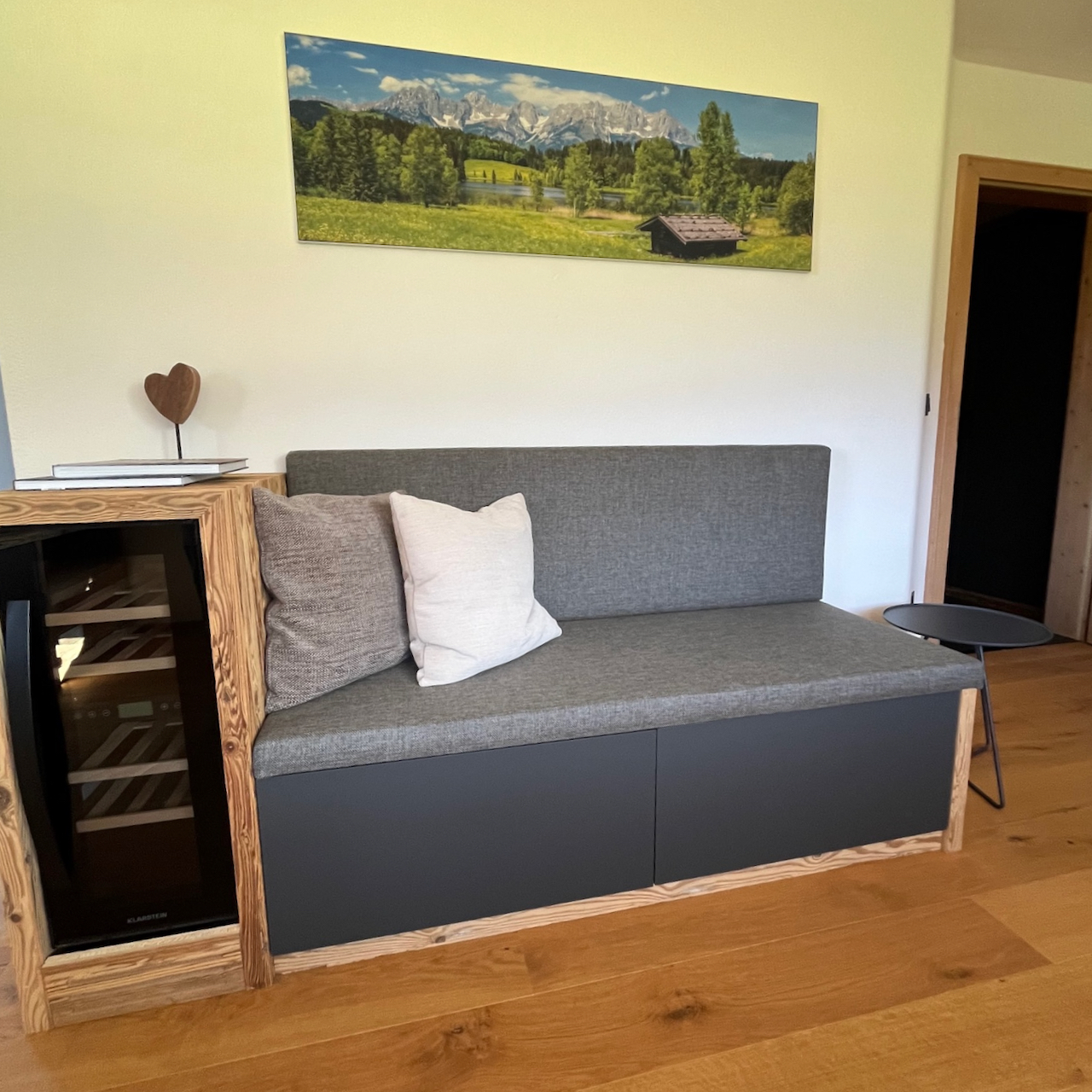Frühaufsteher oder Langschläfer? Egal, ob nun Eule oder Lärche, Ihr werdet Euch schon einig: es stehen Euch ein Boxspringbett (1,80 × 2 Meter) und ein bequemes Schlafsofa (1,60 × 2 Meter) in separaten Zimmern zur freien Verfügung. Vom Wohn-/Essbereich aus habt ihr einen fantastischen Blick auf den Zahmen Kaiser.