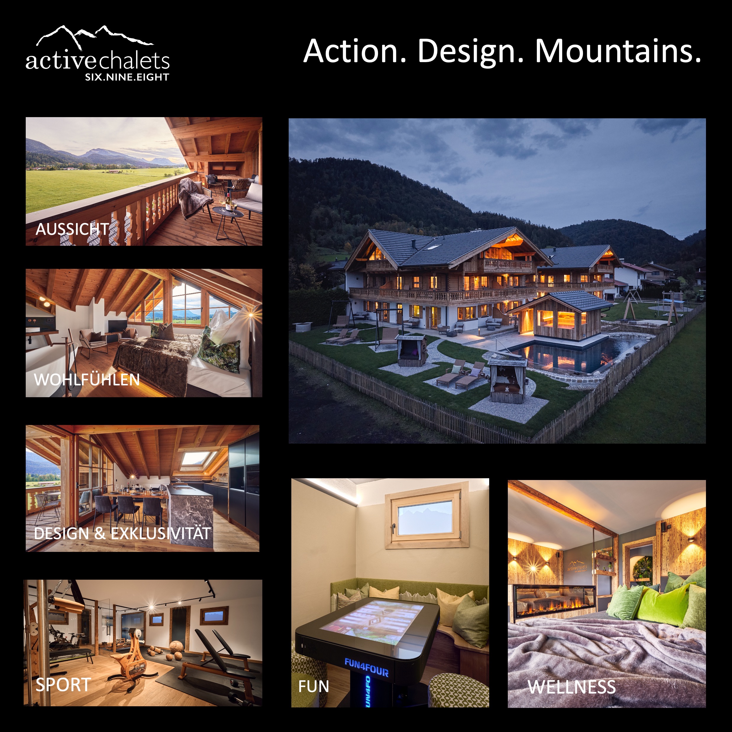 Das Chalet für Aktive im Chiemgau. Faszinierendes Alpstyle-Design, traumhafter Blick auf die Bergwelt – Sport & Fun für den Körper, Erholung & Inspiration für Geist und Seele. Das activechalets six.nine.eight liegt auf 698m Höhe am Eingang zu Reit im Winkl vor dem Kaisergebirge, das auf neue Art und Weise die Freiheit von Apartments mit der Möglichkeit der Aktivität und Design verbindet. Vom Chalet für zwei auf 40m2 bis zum großzügigen Chalet für bis zu 8 Person im Dachgeschoß mit 150m2 mit höchstem Komfort ist für jeden Geschmack was dabei. Im modern eingerichteten Fitnessraum ist auf 50 qm für jeden Aktiven was dabei. Danach entspannen in der Innen- oder Außensaune im 400qm alpspa Wellnesbereich mit Ruheräumen und Naturpool (> 16 Jahre) oder im alpspa family mit den kids und wer mag eine Runde digitale Brettspiele am Fun4Four display. Für die kids steht draußen ein spannendenr Spielplatz bereit. lFür Langeweile bleibt keine Zeit.