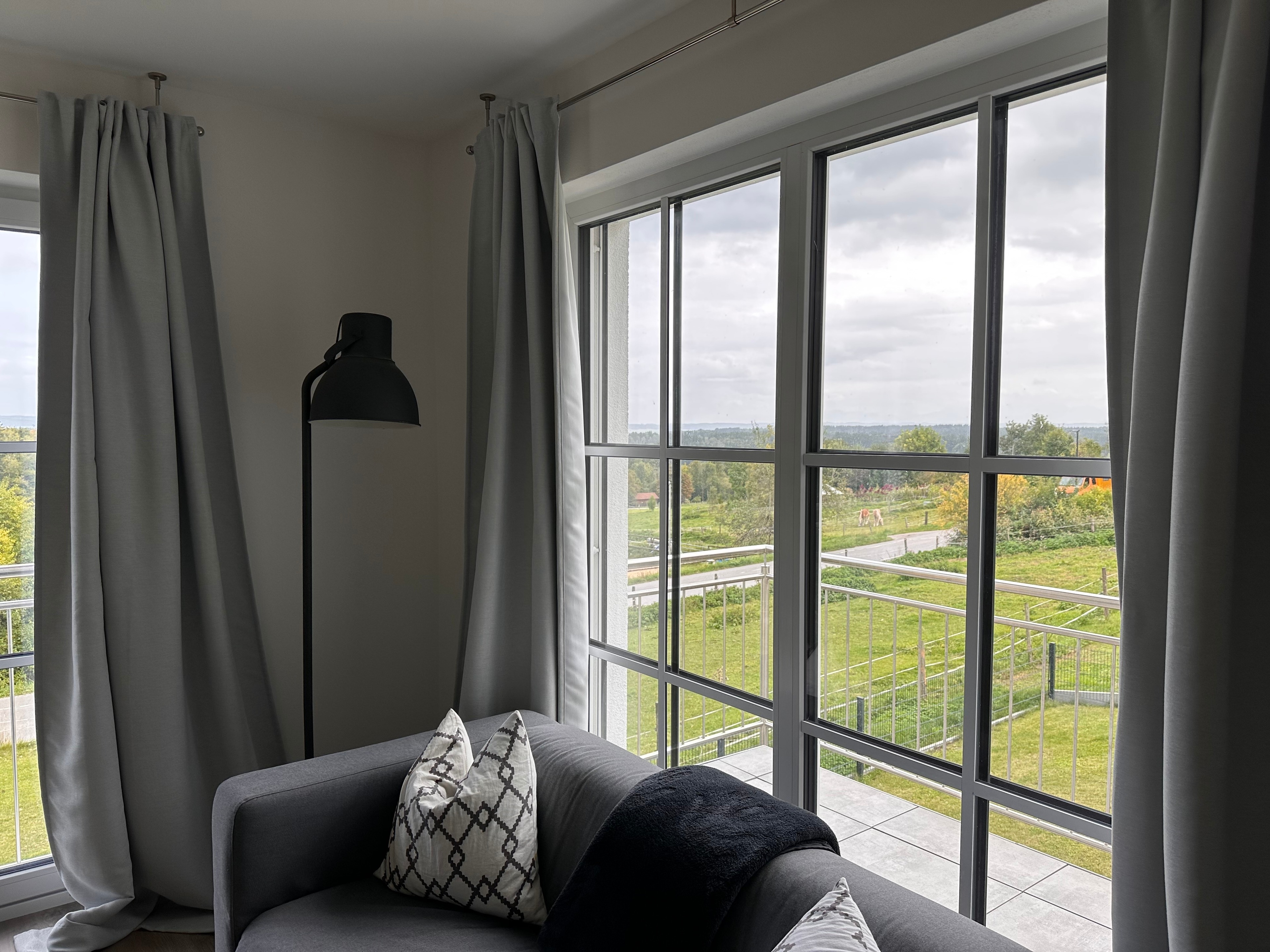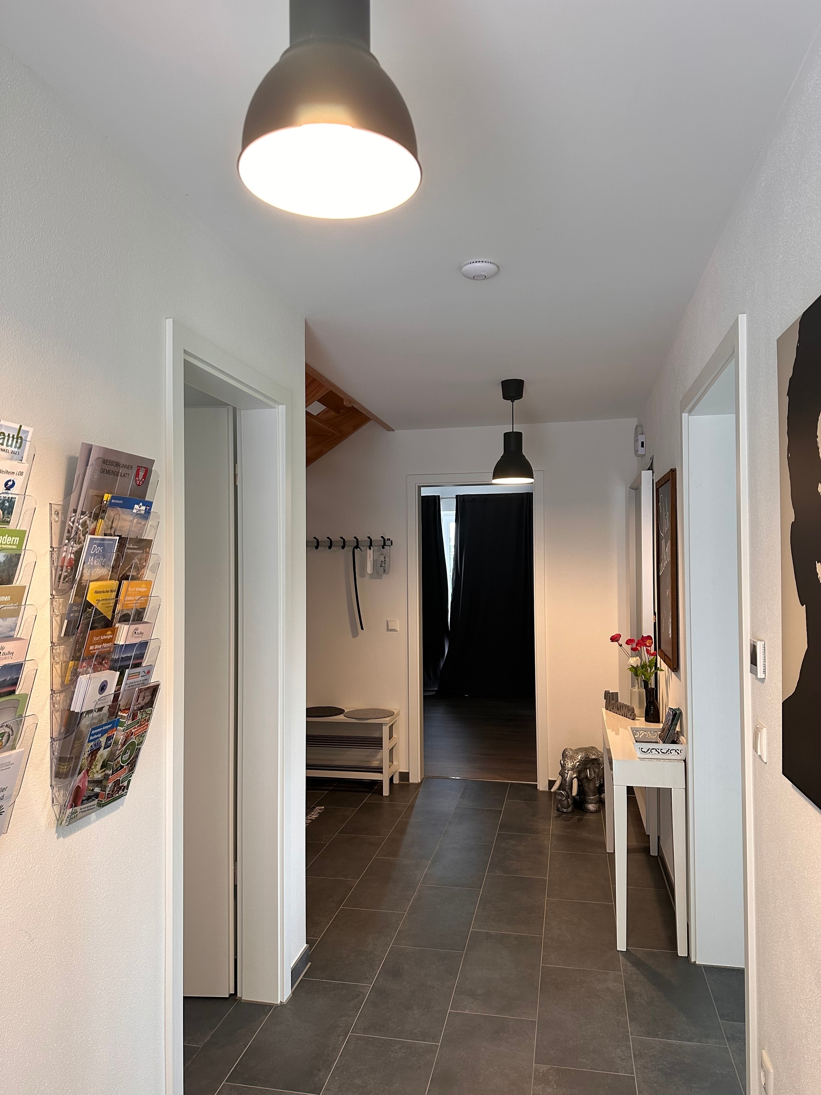 Liebe Gäste, wir starten gleich mit zwei Highlights: Anreise ab 12:00 | Abreise bis 12:00 möglich und dann sind wir auch noch KönigsCardgastgeber :-)). Außerdem vereinen wir in unserer kleinen Heimat Paterzell, einem ländlichen Nest mit 200 Einwohnern: Ruhe und rasendes Internet (kostenfreies WLAN mit einer 1 GBit Glasfaserleitung) und zwar in unserer XXL-Panoramablickwohnung. Sie lädt mit 140 m² Gäste mit dem Wunsch nach einem großen Raumangebot recht herzlich ein. Die großzügige Wohnung befindet sich in einem höchst attraktiven Neubau, einem KfW Effizienzhaus 55. Der sichtbare naturbelassene Holzsichtdachstuhl im Dachgeschoß zeigt sich gerne für ein angenehmes Raumgefühl verantwortlich. Das Energiesparhaus ist mit einem Designboden (Vinylboden ohne Vinyl (blauer Engel)) oder Fliesen ausgestattet. Die Flügeltüren im 1. Stock und im Dachgeschoss sind abschließbar. Insgesamt vier Schlafräume stehen für unsere Gäste zur Verfügung. Zwei moderne Badezimmer, Handtuchtrockner, eines mit Badewanne, stehen als Wohlfühloase gerne bereit. Der grandiose Panoramablick wird Sie verzaubern und genießen lassen. Hereinspaziert ……..