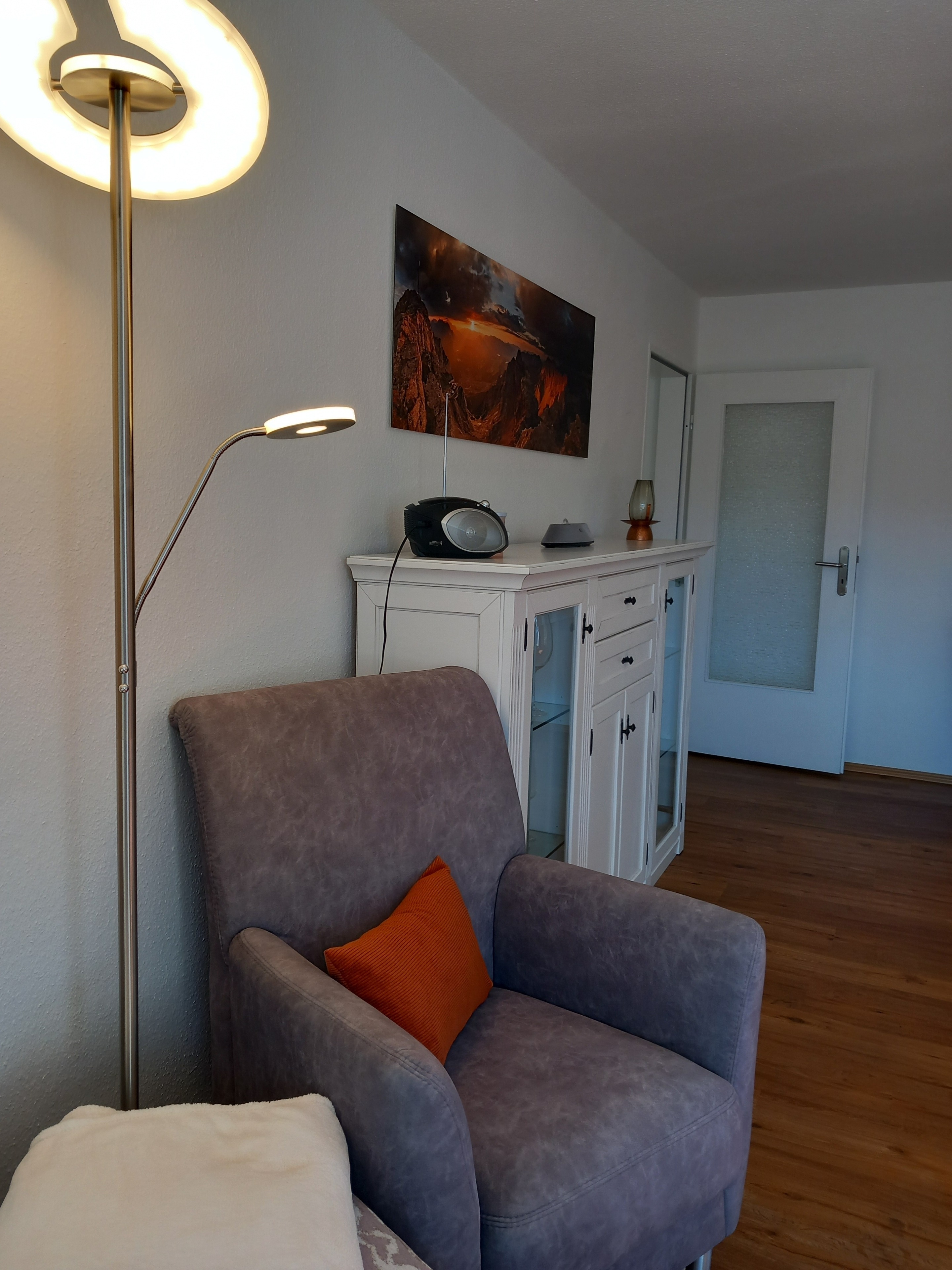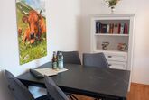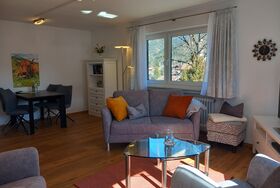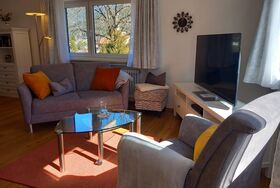 Wohnzimmer mit Couch und 2 Sesseln, einem gemütlichen Esstisch, Kabel-TV mit Sky-Sport, DVD, Stereoanlage mit CD-Player. Neue hochwertige Küche mit kleinem Essplatz und Geschirrspüler.