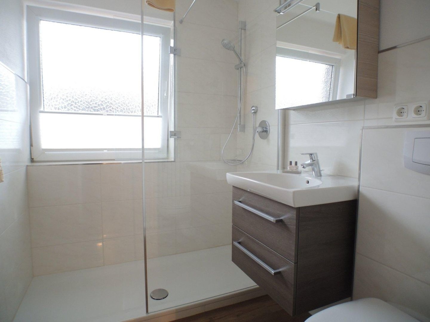 Begehbare Dusche, Waschkonsole und WC. Sonniger Balkon mit herrlichem Panoramablick.
