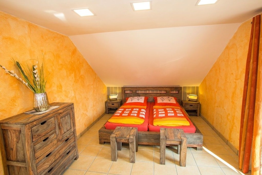 1 Schlafzimmer mit Doppelbett und Massivmöbeln in warmen Farbtönen; Tisch mit 2 Stühlen; Blick auf den wunderschönen Garten
