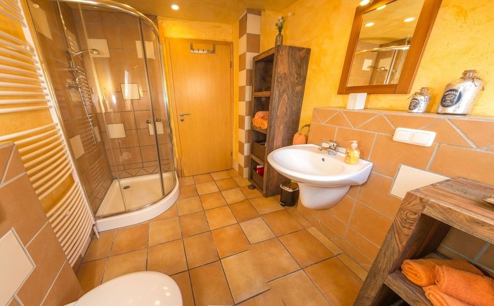 1 geräumiges Bad mit Dusche, WC mit mediterranem Flair