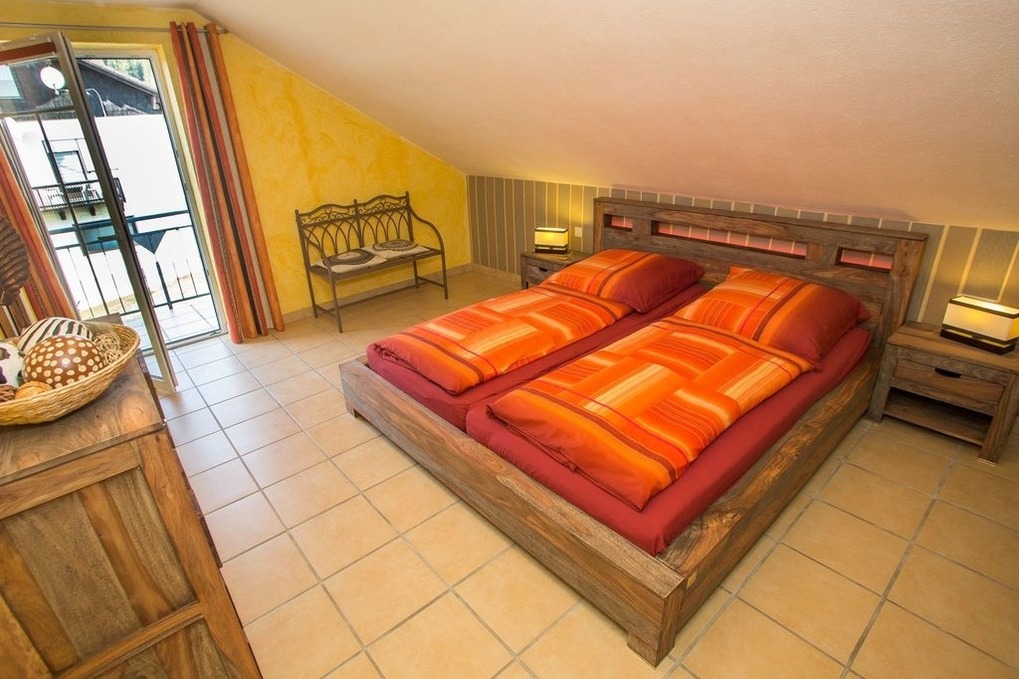 1 geräumiges Schlafzimmer mit Doppelbett und Massivmöbeln in warmen Farbtönen; direkter Zugang zum eigenen Balkon (9 qm)