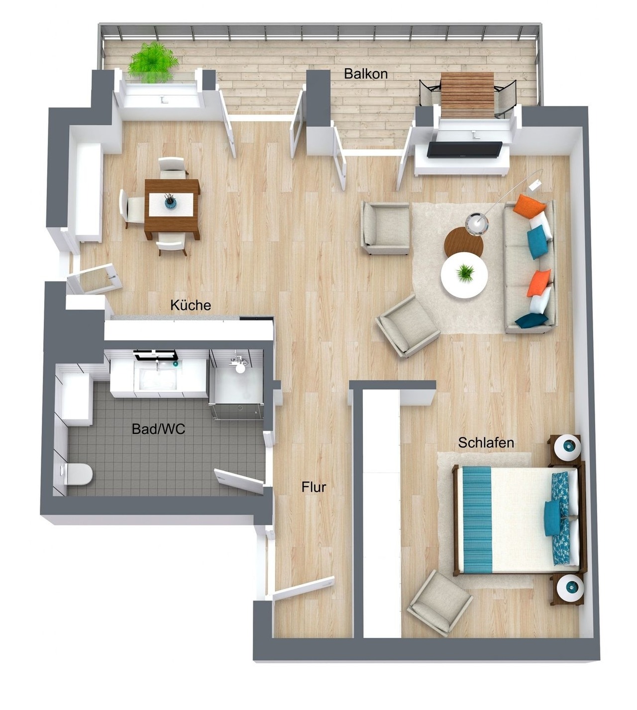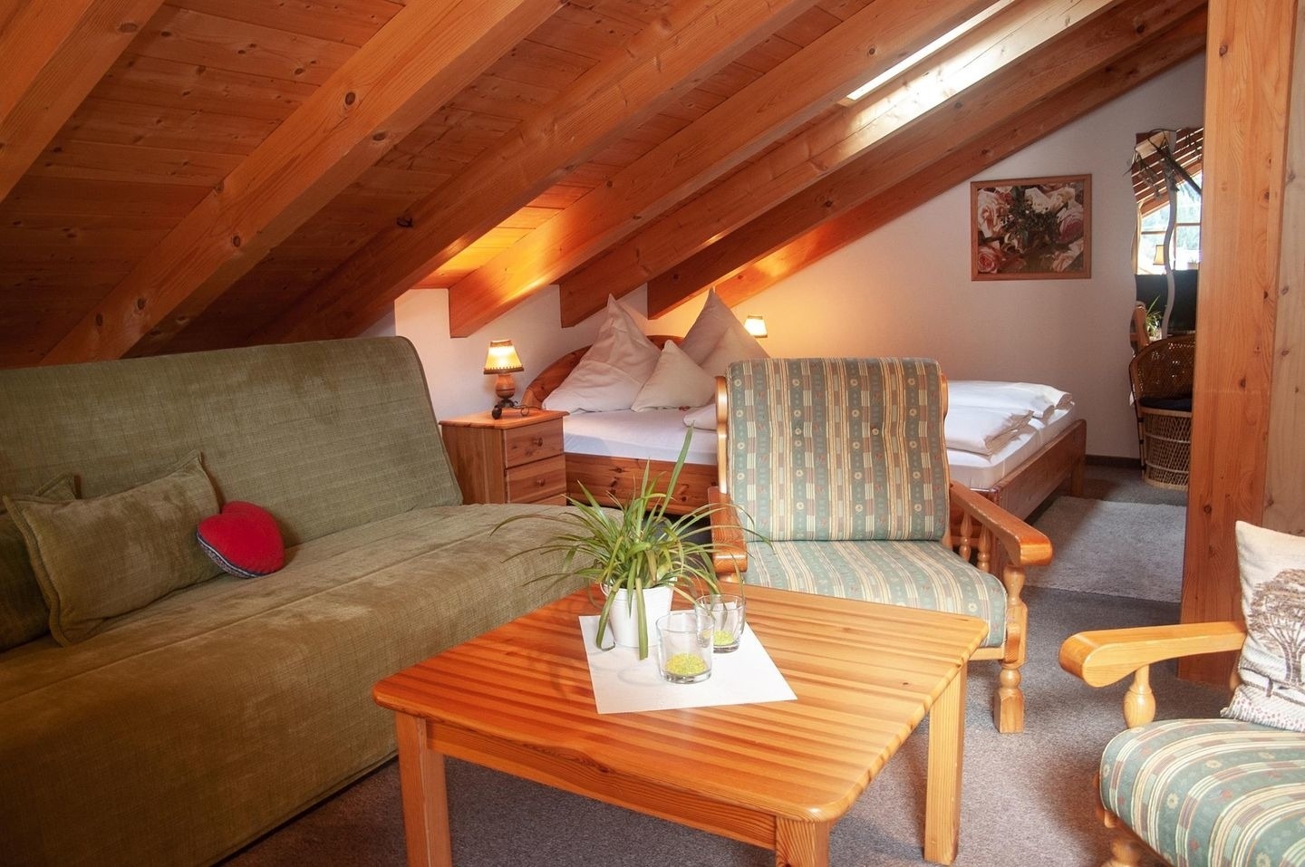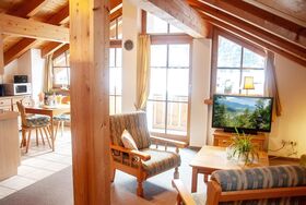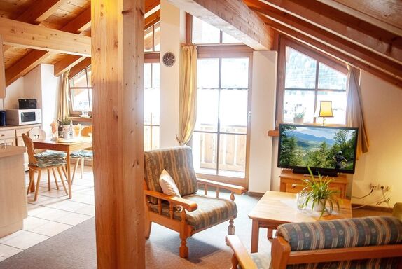 1-Zimmer-Appartement für 1 - 2 Personen, 42 qm mit freiem Holzgiebel im Dachgeschoss mit herrlichem Blick aufs Karwendel vom möbliertem Balkon.