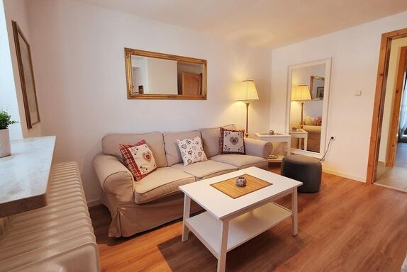 Helles Wohnzimmer, das zum Relaxen einlädt, mit Kabel-TV, Radio - CD Wechsler, bequemem Sofa und Sesseln.