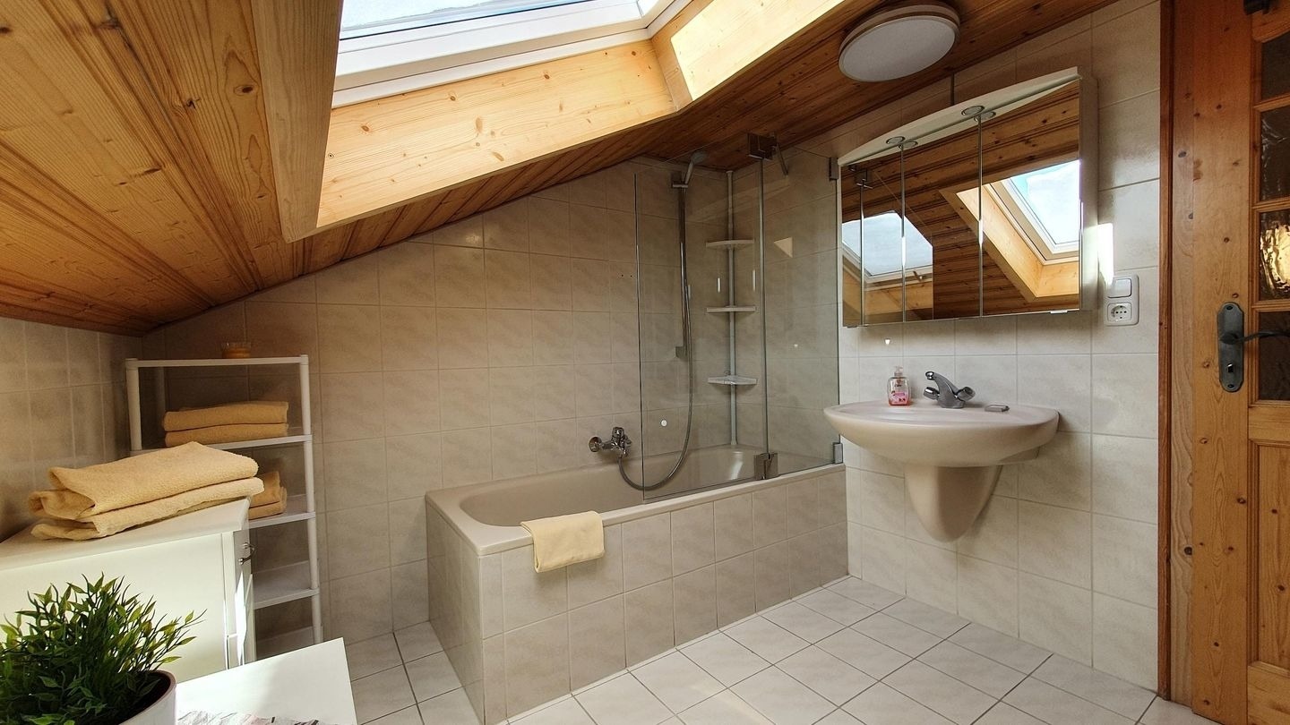 Das Bad mit Fenster, verfügt über eine Badewanne und Duschwand und reichlich Schrankplatz. Das WC ist separat.