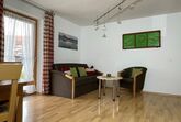 Wohnung Hopfensee, ca. 56 m², ebenerdig mit Terrasse, kleiner Gartenanteil, ausgerichtet nach Süden, mit Garten- und Hofblick, allergikerfreundlich, großzügige Wohnküche mit Couch, Sat-TV und Stereoanlage.