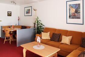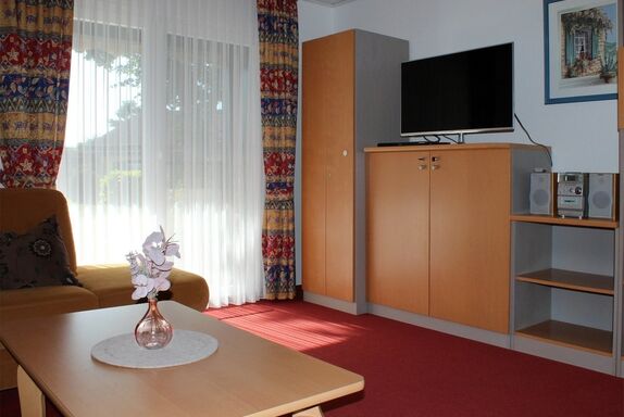 1 gemütliches Wohn-Esszimmer mit Sitzgruppe, Polstersitzgruppe, TV, Telefon und Radio.