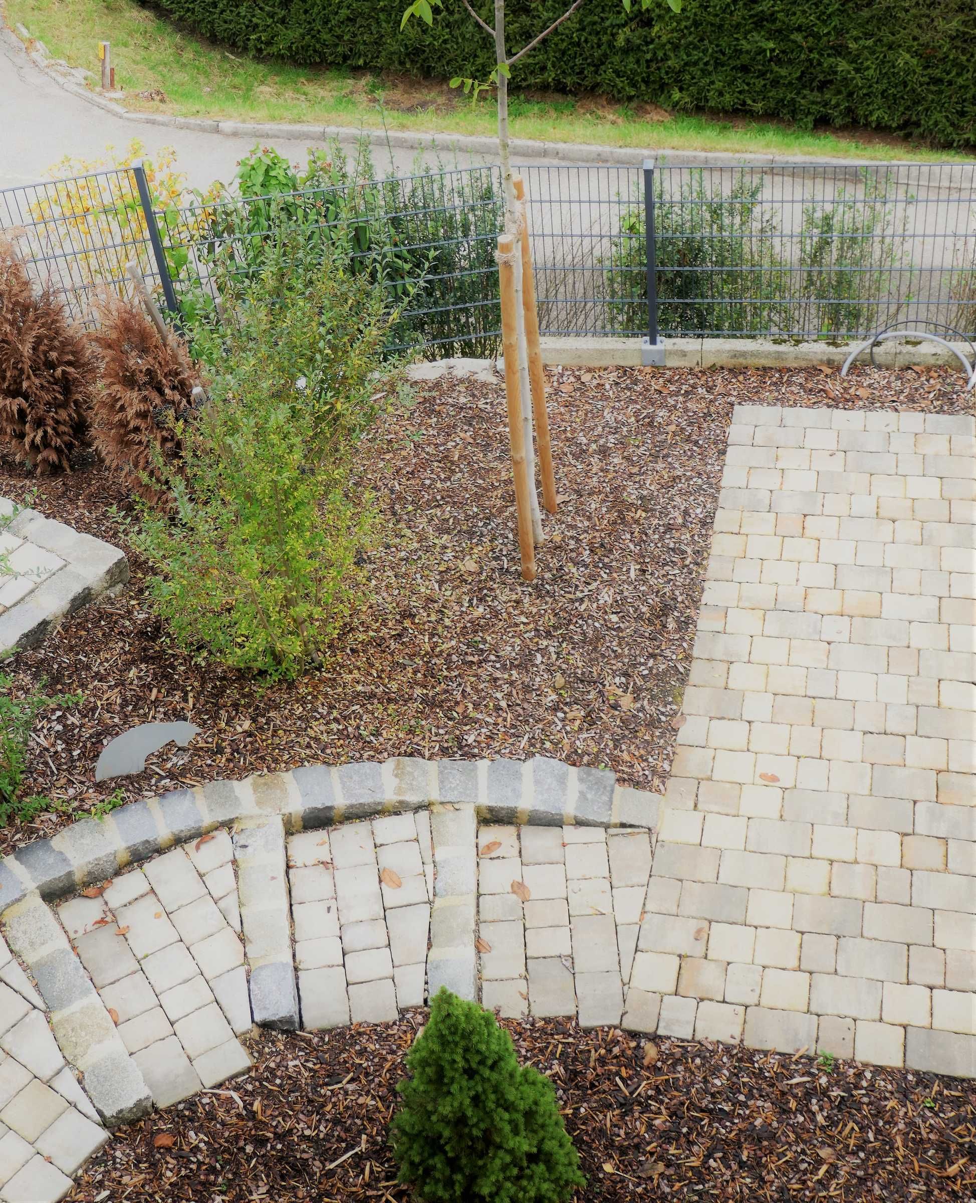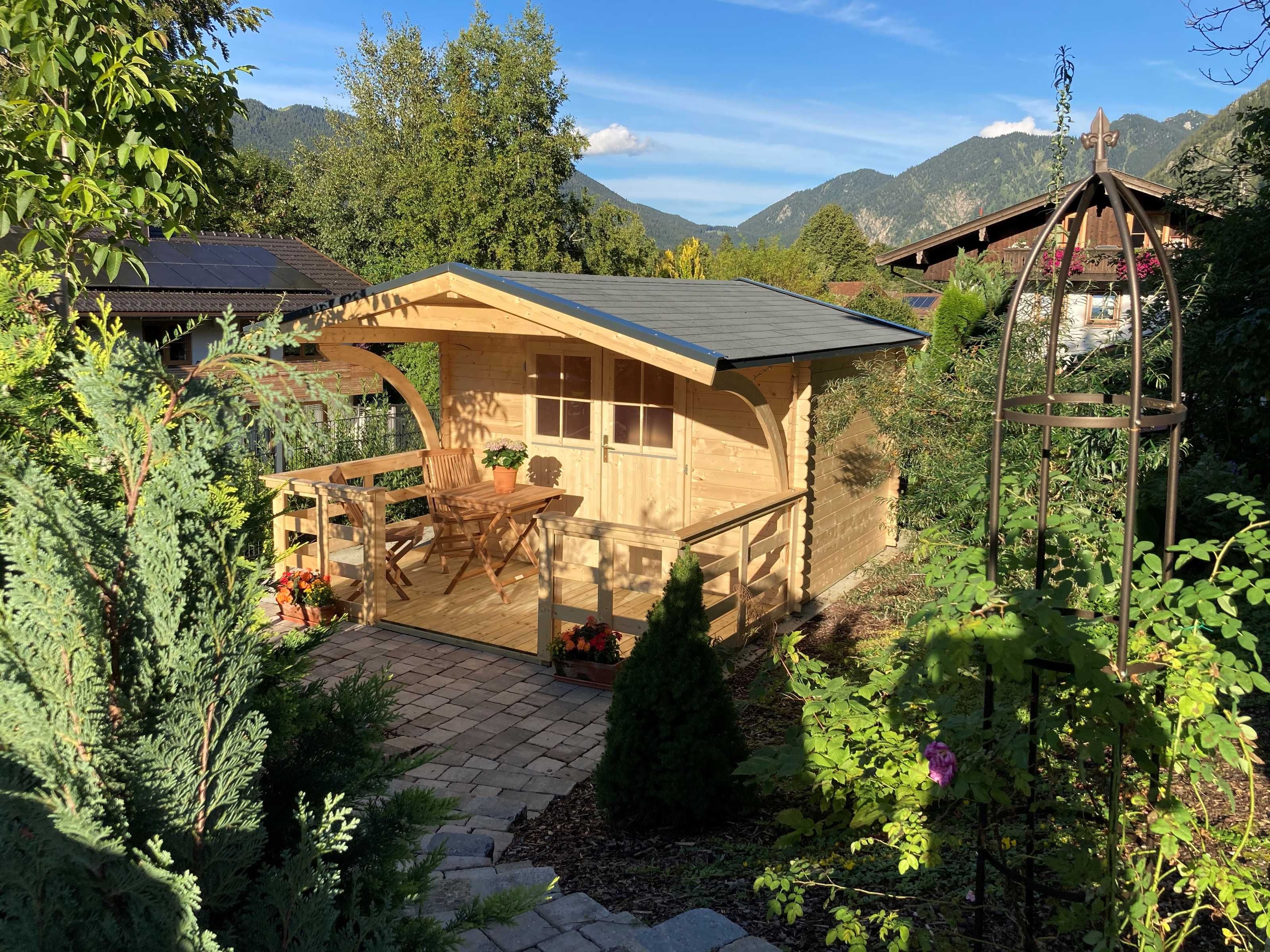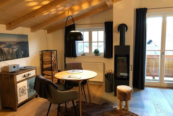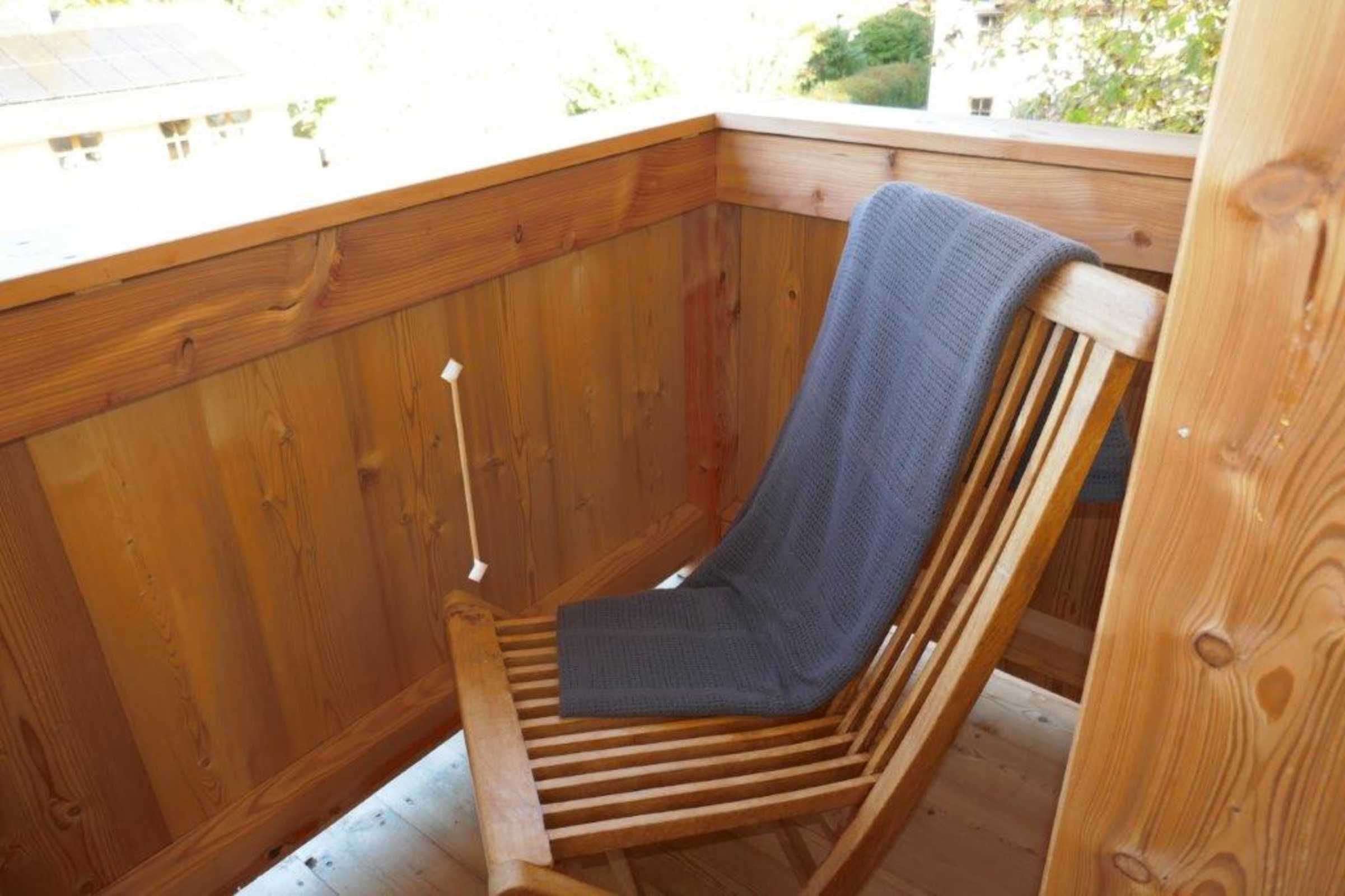 Behagliche, aber moderne Ferienwohnung mit Schwedenofen und Balkon und kleinem Sitzbereich vor dem Haus.