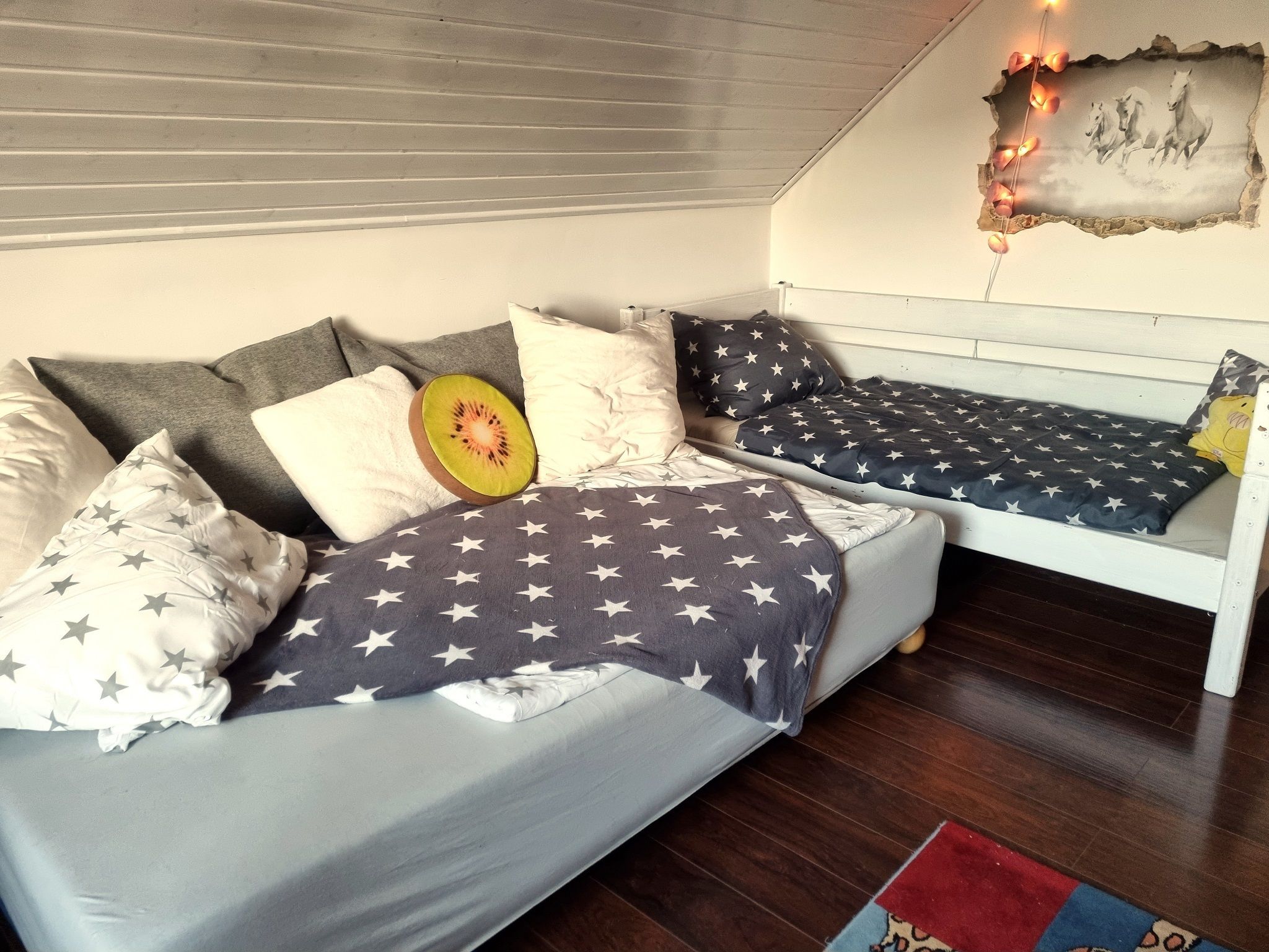 Die Ferienwohnung befindet sich im ersten Stock unseres Zweifamilienhauses und hat eine Größe von 85 qm. Sie verfügt über ein großzügiges Wohnzimmer, Schlafzimmer, Kinderzimmer, Küche und Bad.