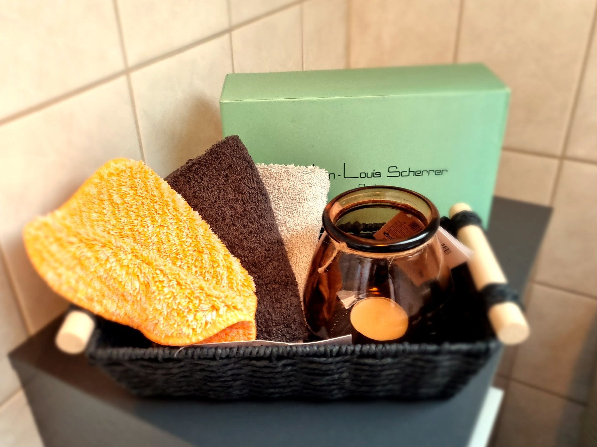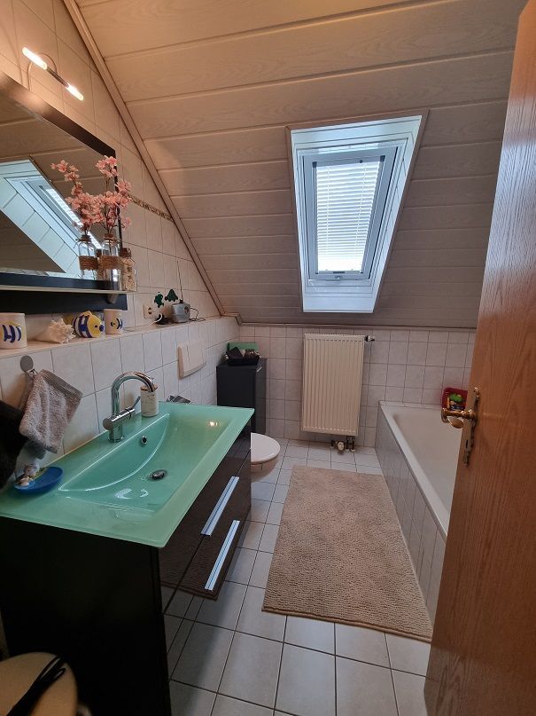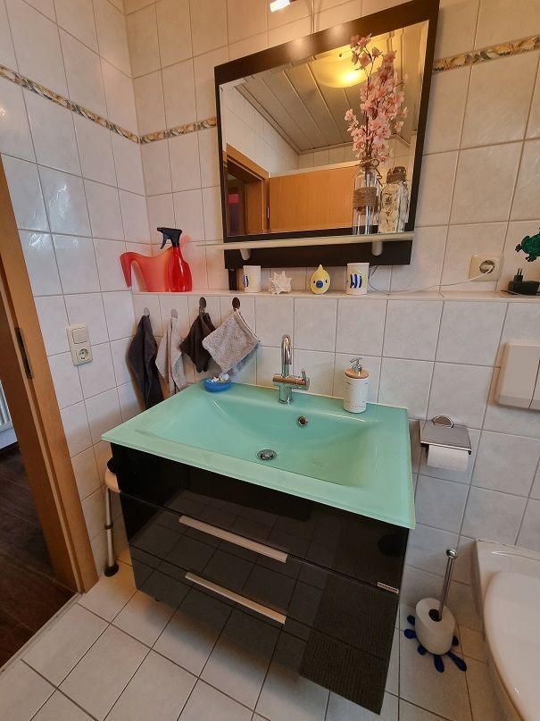 Das Badezimmer ist mit Badewanne, Dusche, WC und Waschbecken ausgestattet. Föhn ist vorhanden. Hand- und Badetücher werden bereitgestellt.