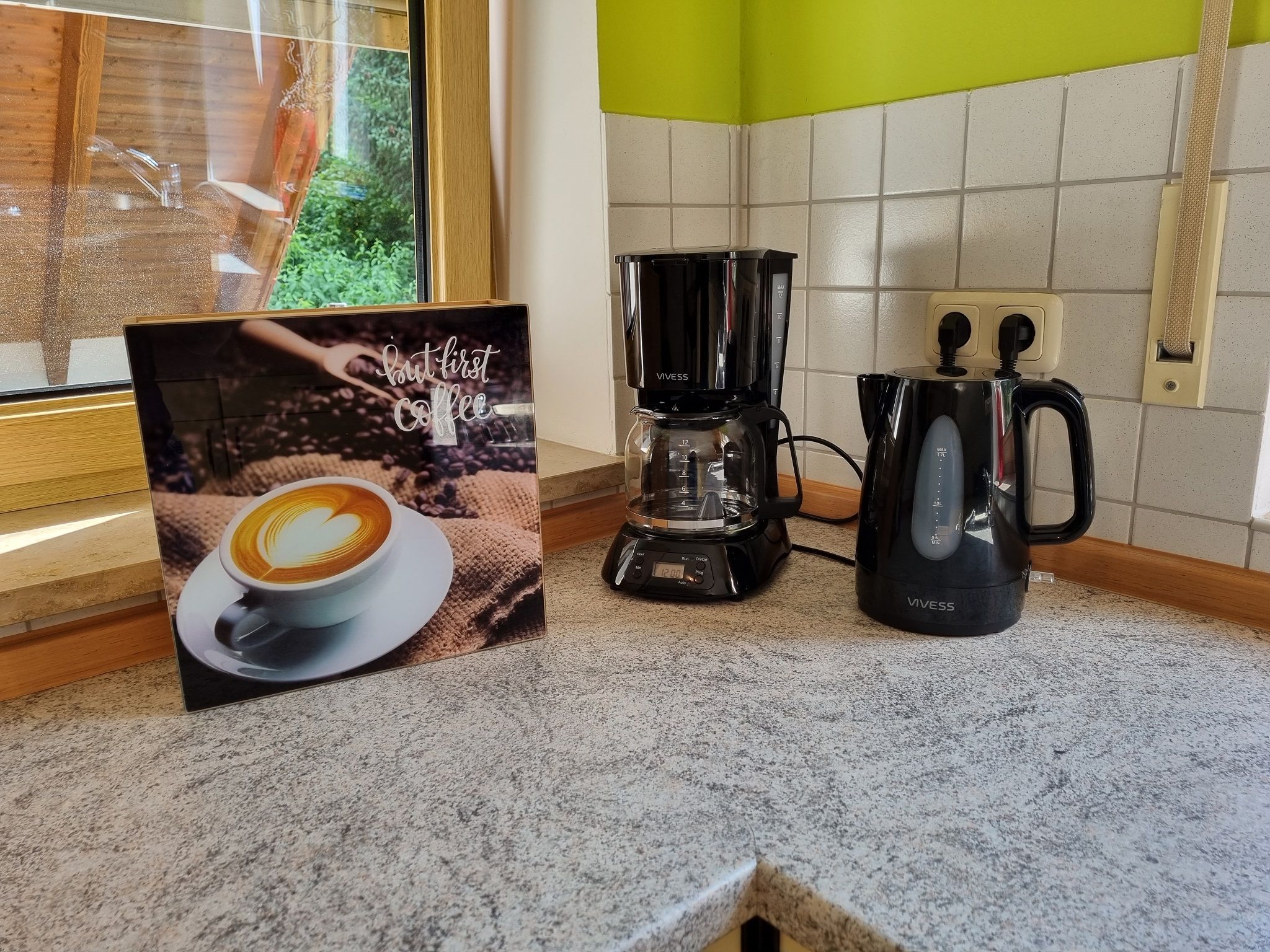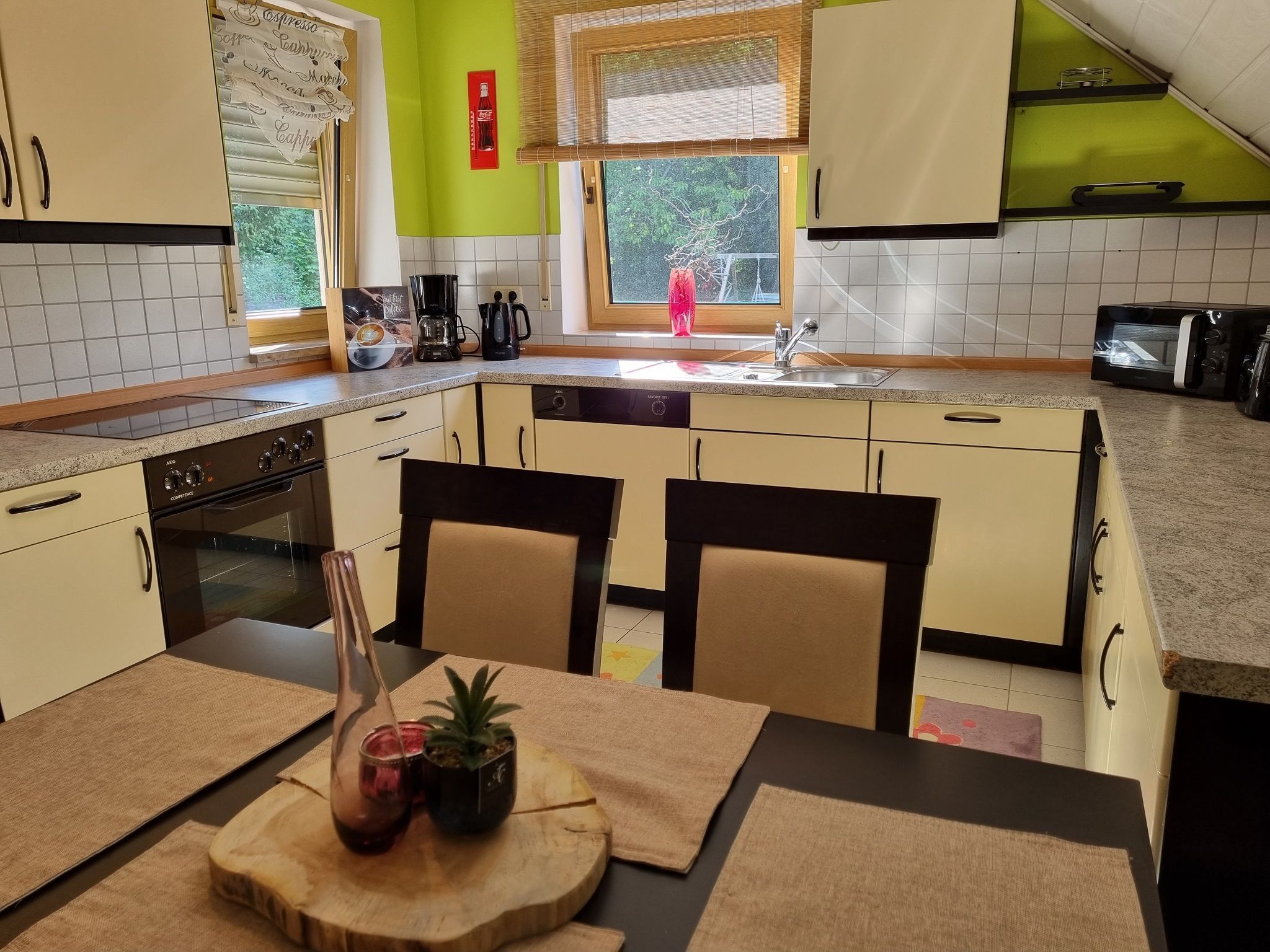 Die geräumige Küche ist mit einem Essbereich, sowie Kühl-, Gefrierschrank, Backofen mit Ceran-Kochfeld, Geschirrspülmaschine, Kaffeemaschine, Wasserkocher, Mikrowelle ausgestattet. Geschirr, Besteck und Geschirrtücher sind ebenfalls vorhanden.