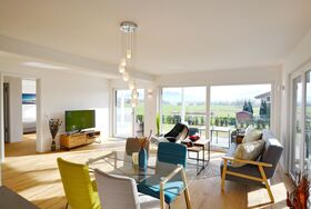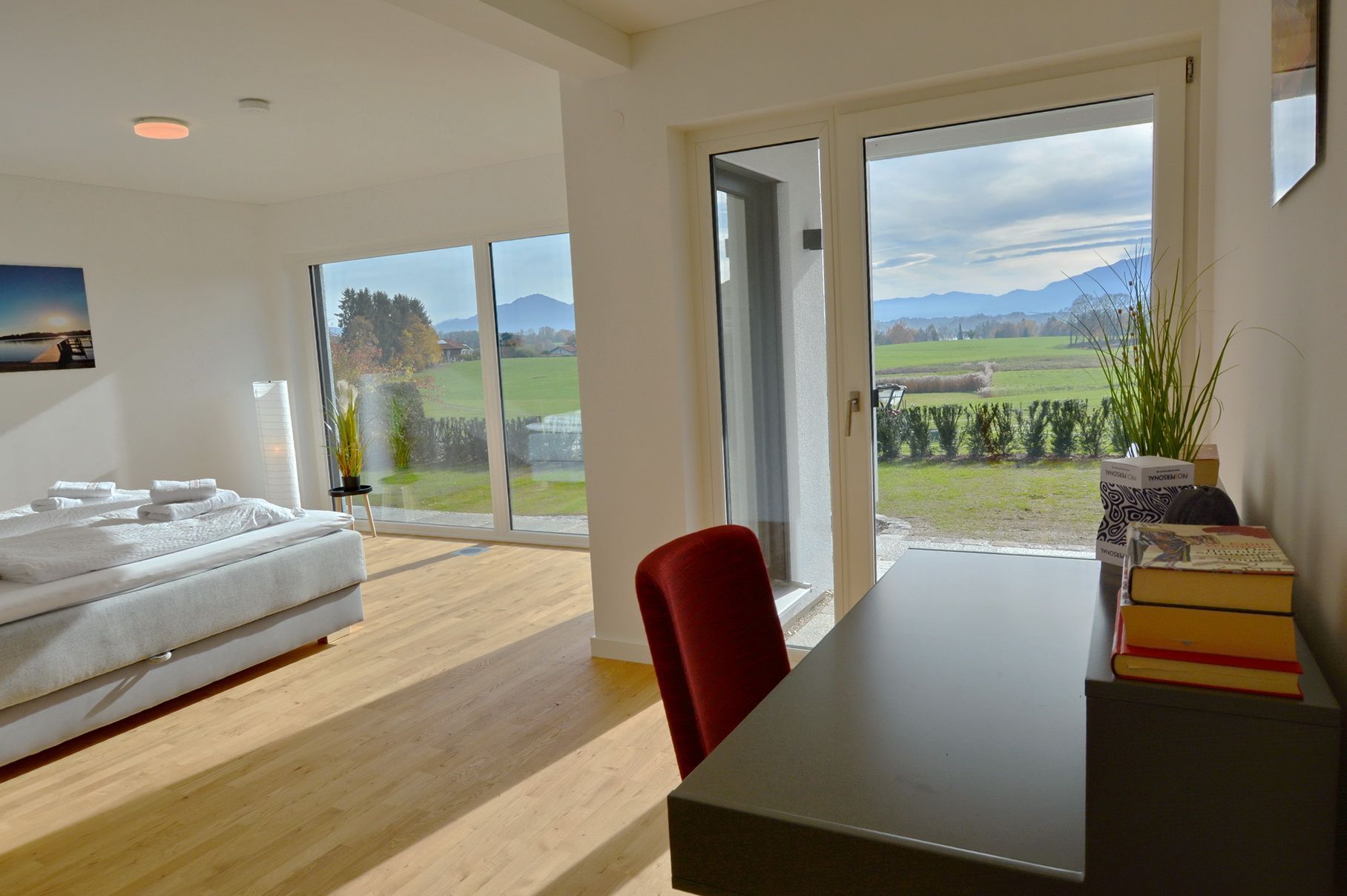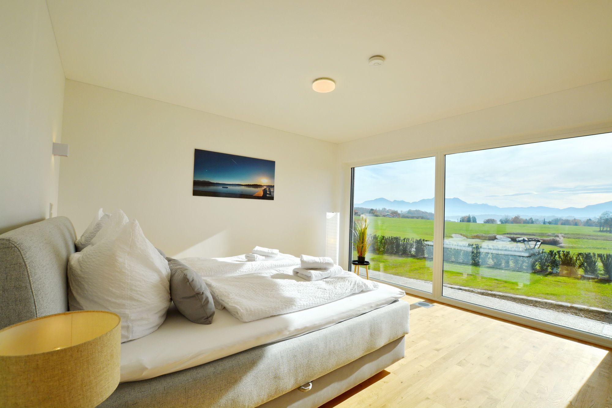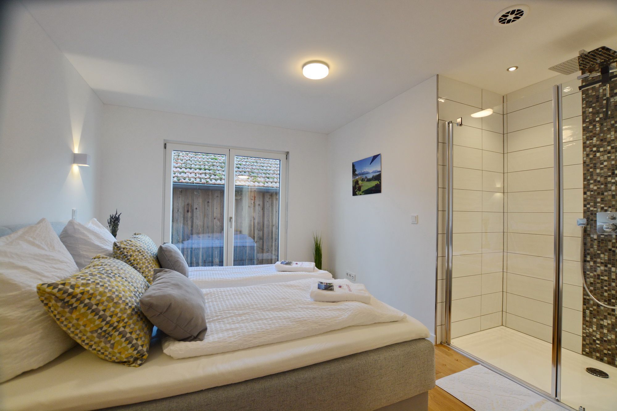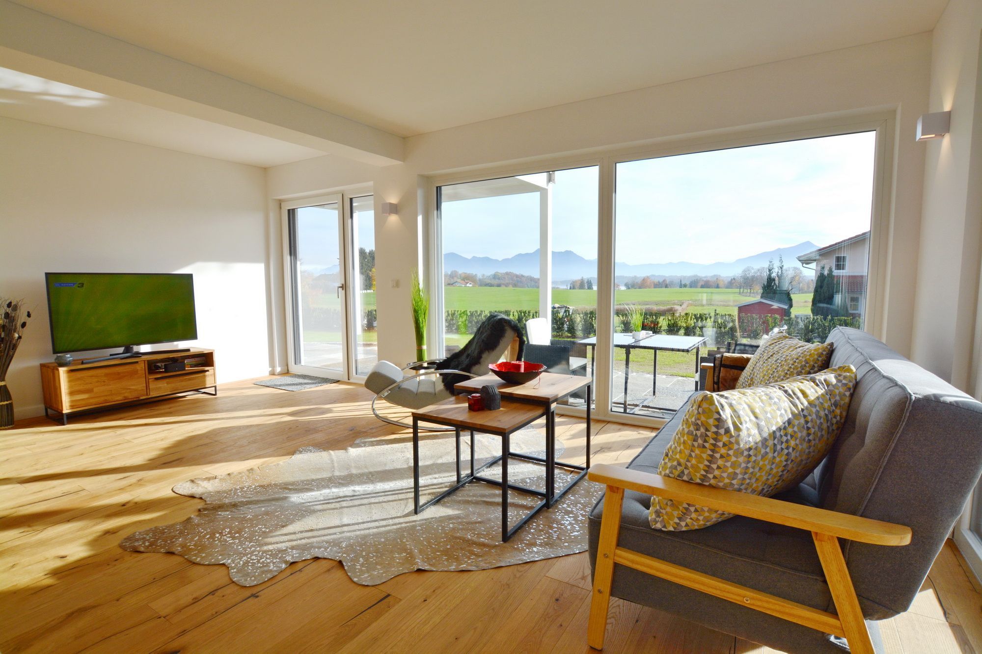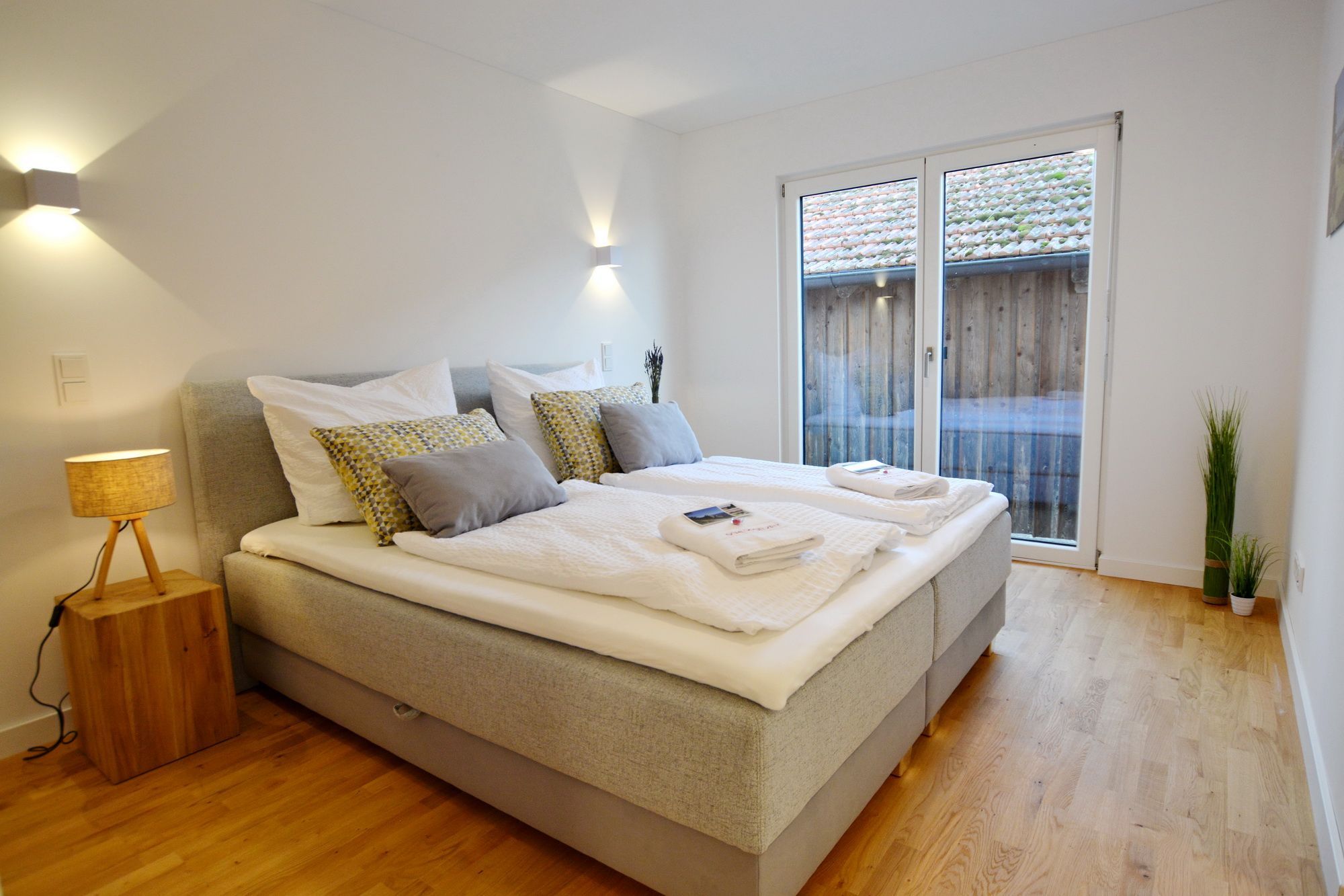 Die modern ausgestattete Ferienwohnung mit sehr vielen Fensterfronten bietet alles, was das Herz begehrt. Sie werden vom Blick auf den Chiemsee und die Berge begeistert sein, welcher sich nicht nur von der Terrasse aus bietet, sondern auch direkt vom großen Schlafzimmer. Die Süd-Terrasse und den Garten können Sie über den Wohnbereich sowie über das große Schlafzimmer betreten. Letzteres bietet ein eigenes Badezimmer mit Doppelwaschbecken, Badewanne, Dusche und WC. Ein weiteres Schlafzimmer verfügt über ein Waschbecken und eine ebene Dusche. Hochwertige Boxspringbetten sorgen für einen angenehmen Schlaf in beiden Räumen. Viel Stauraum bieten Ihnen die Einbauschränke in den Schlafräumen. Trendig und stilvoll eingerichtet präsentiert sich der Wohn- und Essbereich. In der offenen, großzügigen und modernen Küche finden Sie Backofen, Ceranfeld, Geschirrspülmaschine, Mikrowelle und vieles mehr. Ein WC ist im Eingangsbereich separat untergebracht.